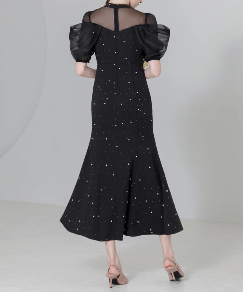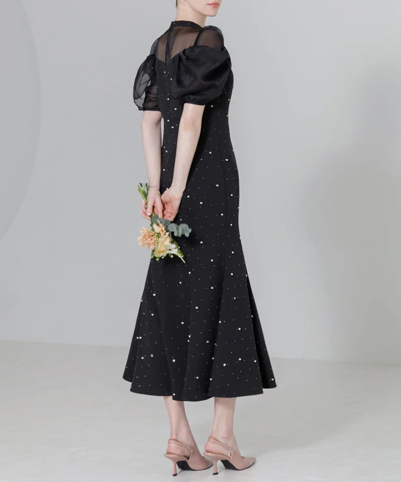 光輝くパールやビジューと上品な印象のパフスリーブを組み合わせたマーメイドドレス。