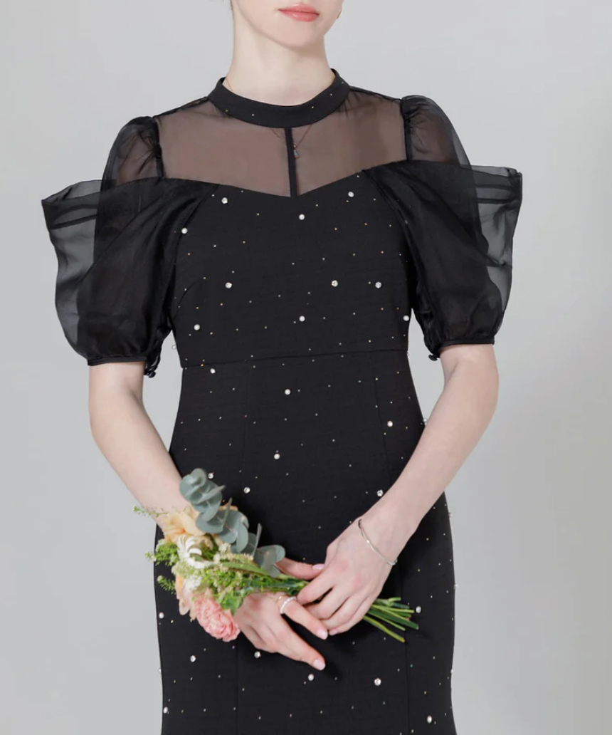 透け感のあるオーガンジーをデコルテとスリーブ部分に使うことで、すっきりとした印象と華奢な肩ラインを強調します。