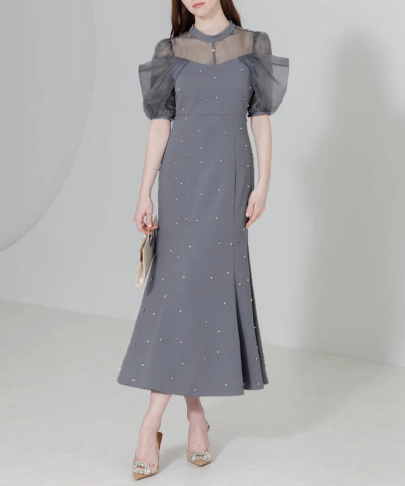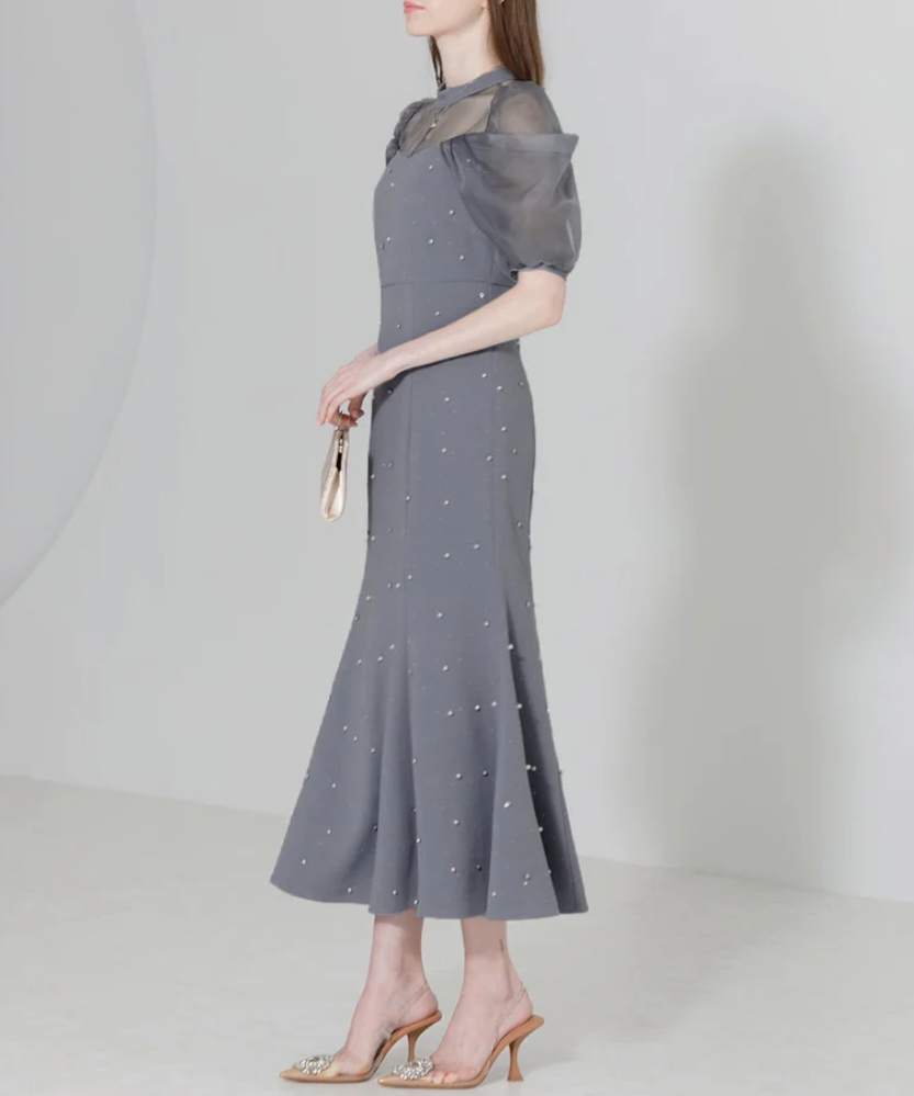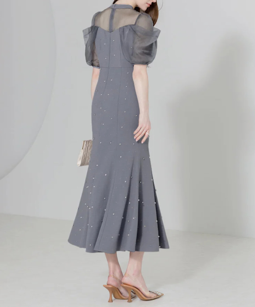 光輝くパールやビジューと上品な印象のパフスリーブを組み合わせたマーメイドドレス。