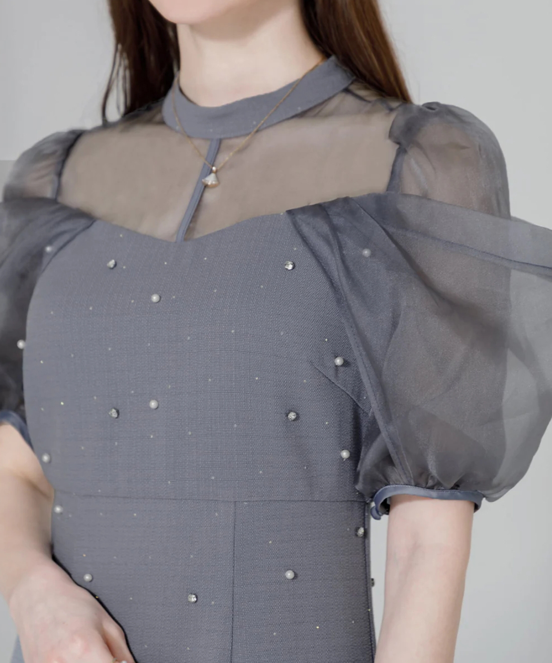 透け感のあるオーガンジーをデコルテとスリーブ部分に使うことで、すっきりとした印象と華奢な肩ラインを強調します。