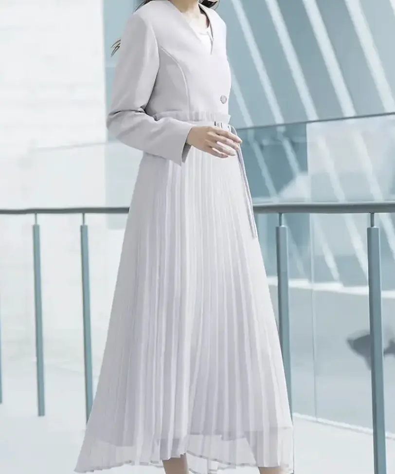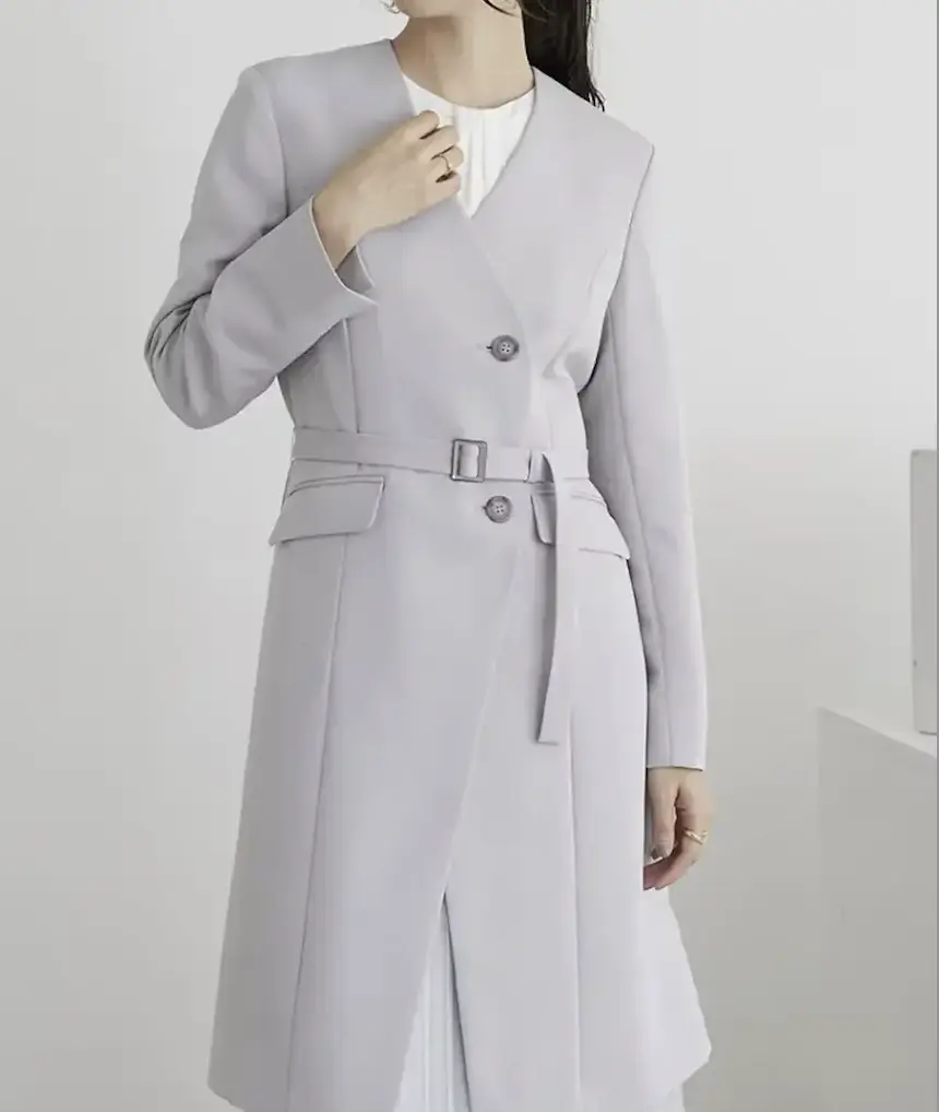 上品さとモダンな雰囲気を兼ね備えたデザインが魅力の一着でございます。程よくフィットするシルエットがスタイルを美しく見せ、ブラックの落ち着いたカラーが大人のエレガンスを引き立てます。