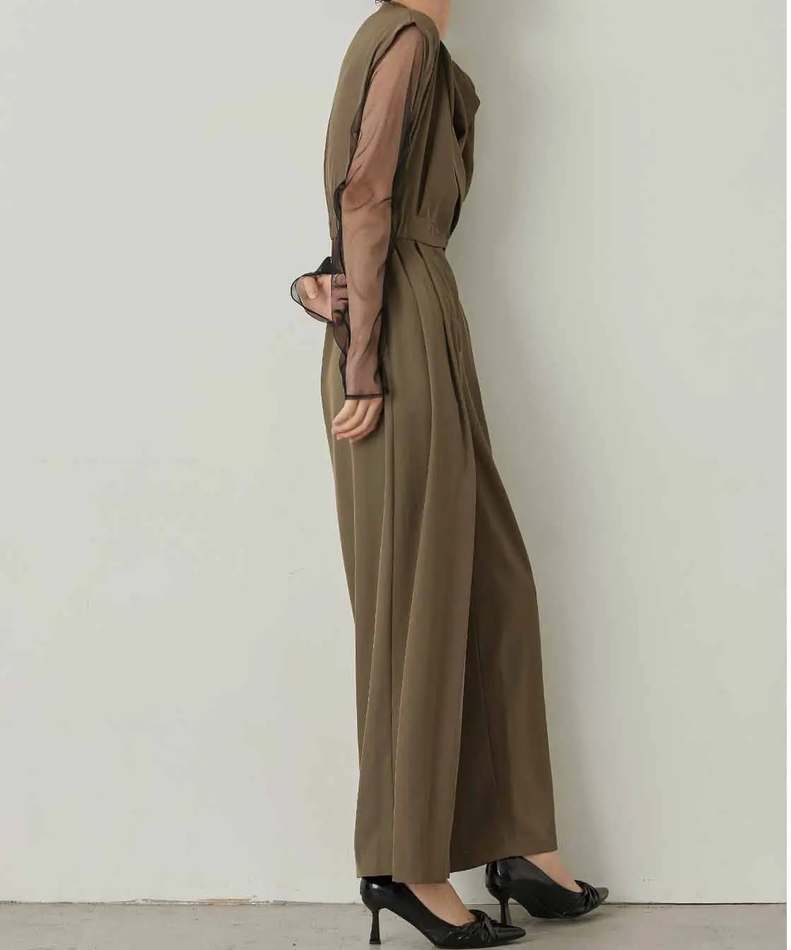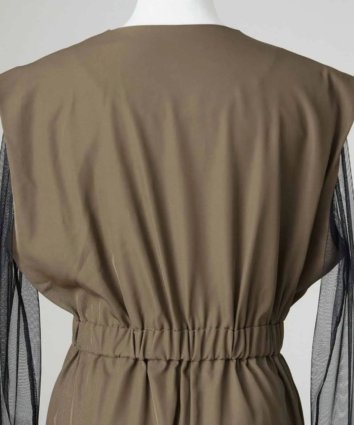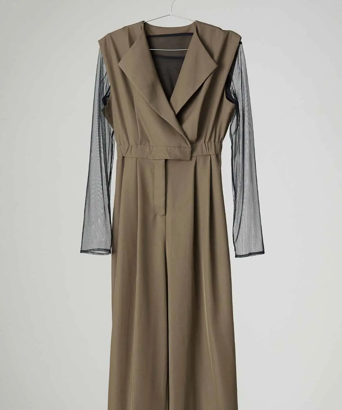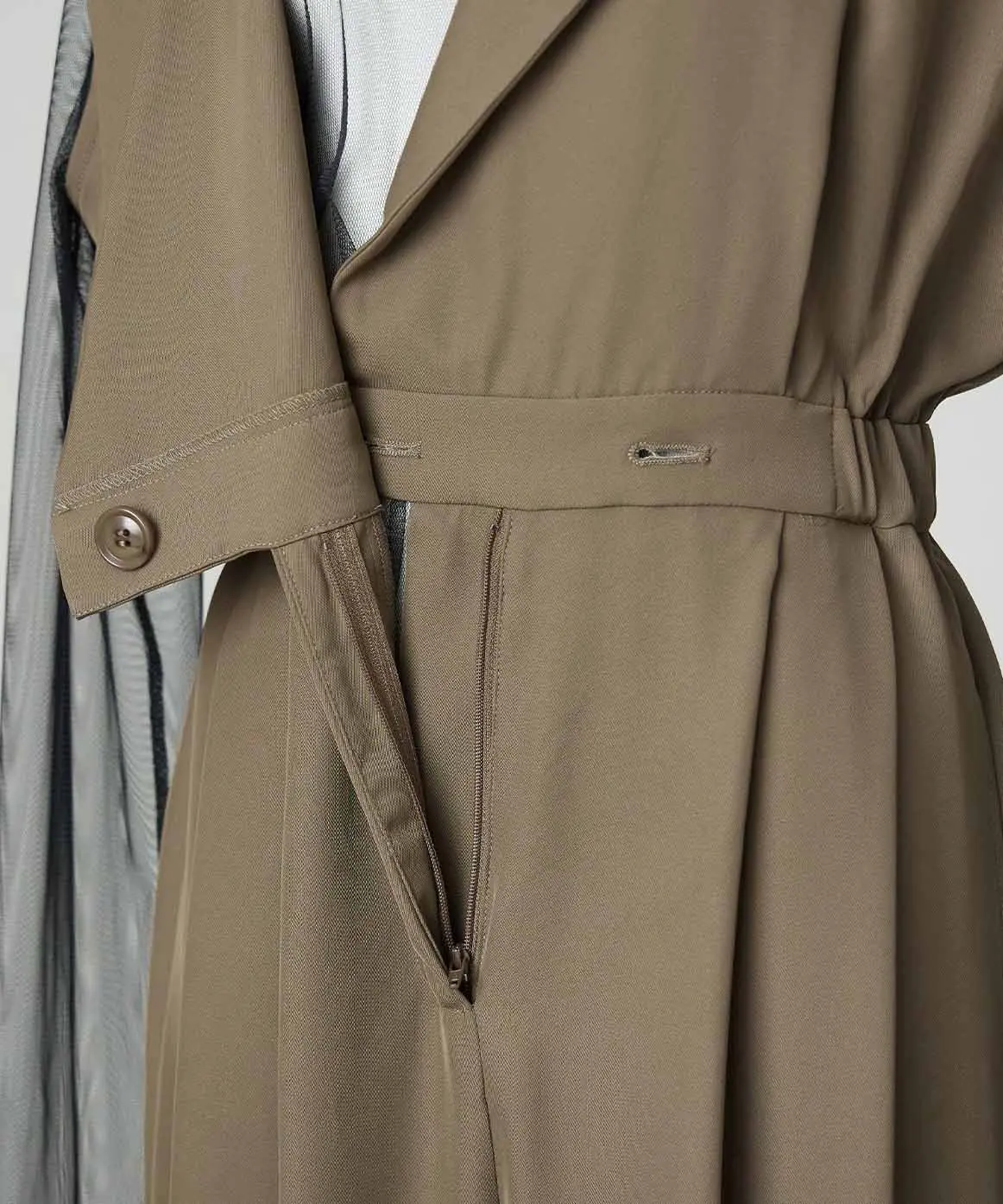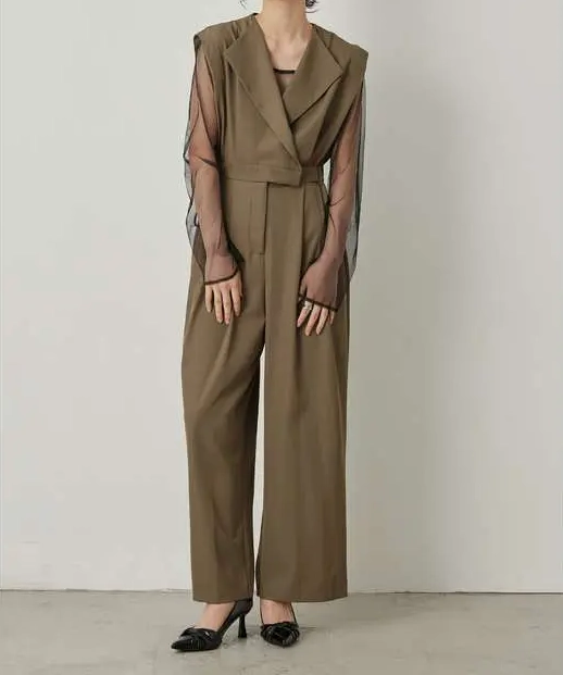 落ち着いた色合いと繊細なディテールが魅力の一着でございます。柔らかなベージュカラーは肌なじみが良く、上品で優しい印象を演出します。