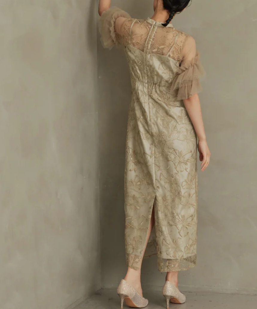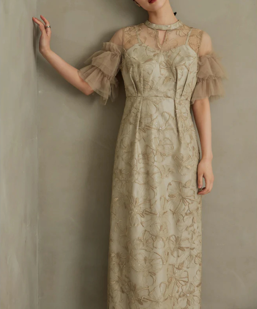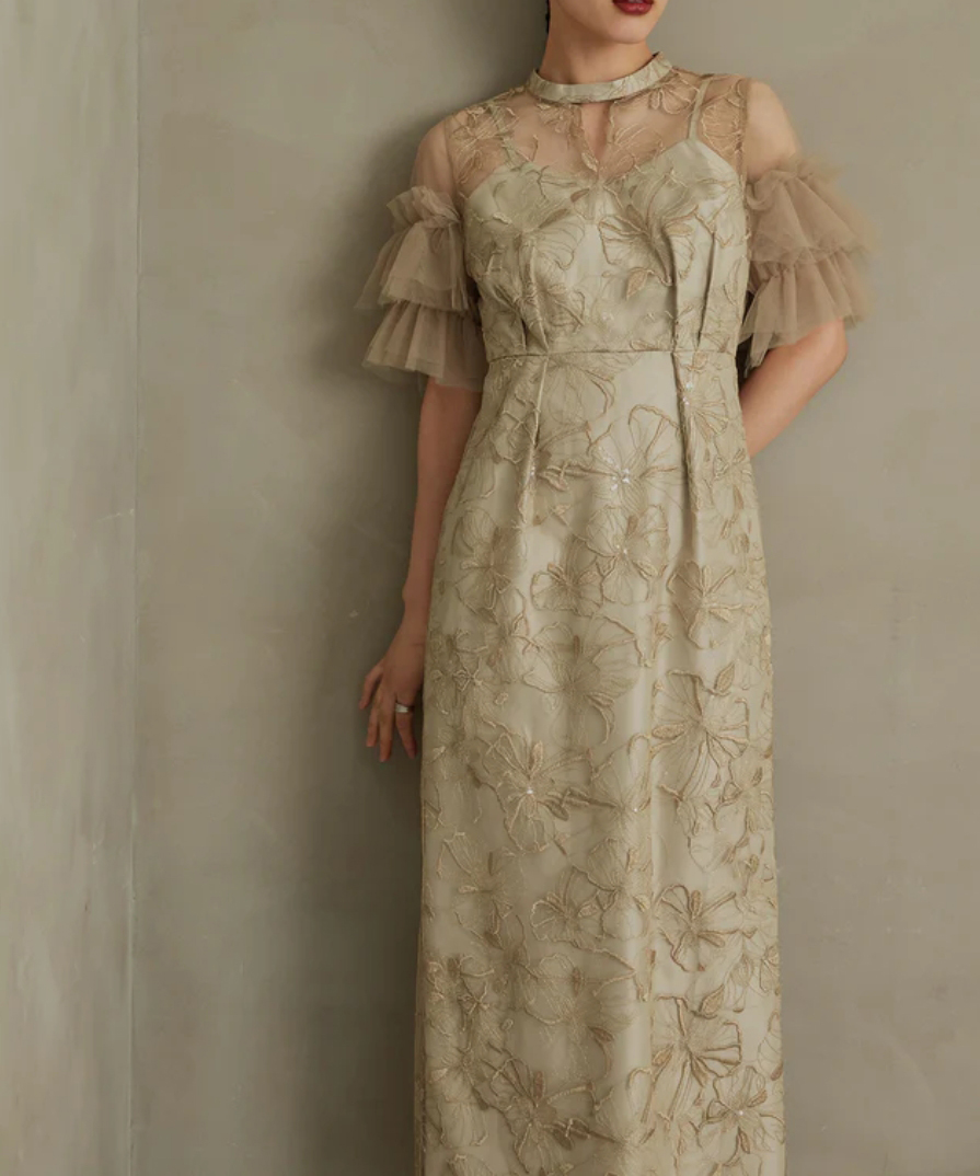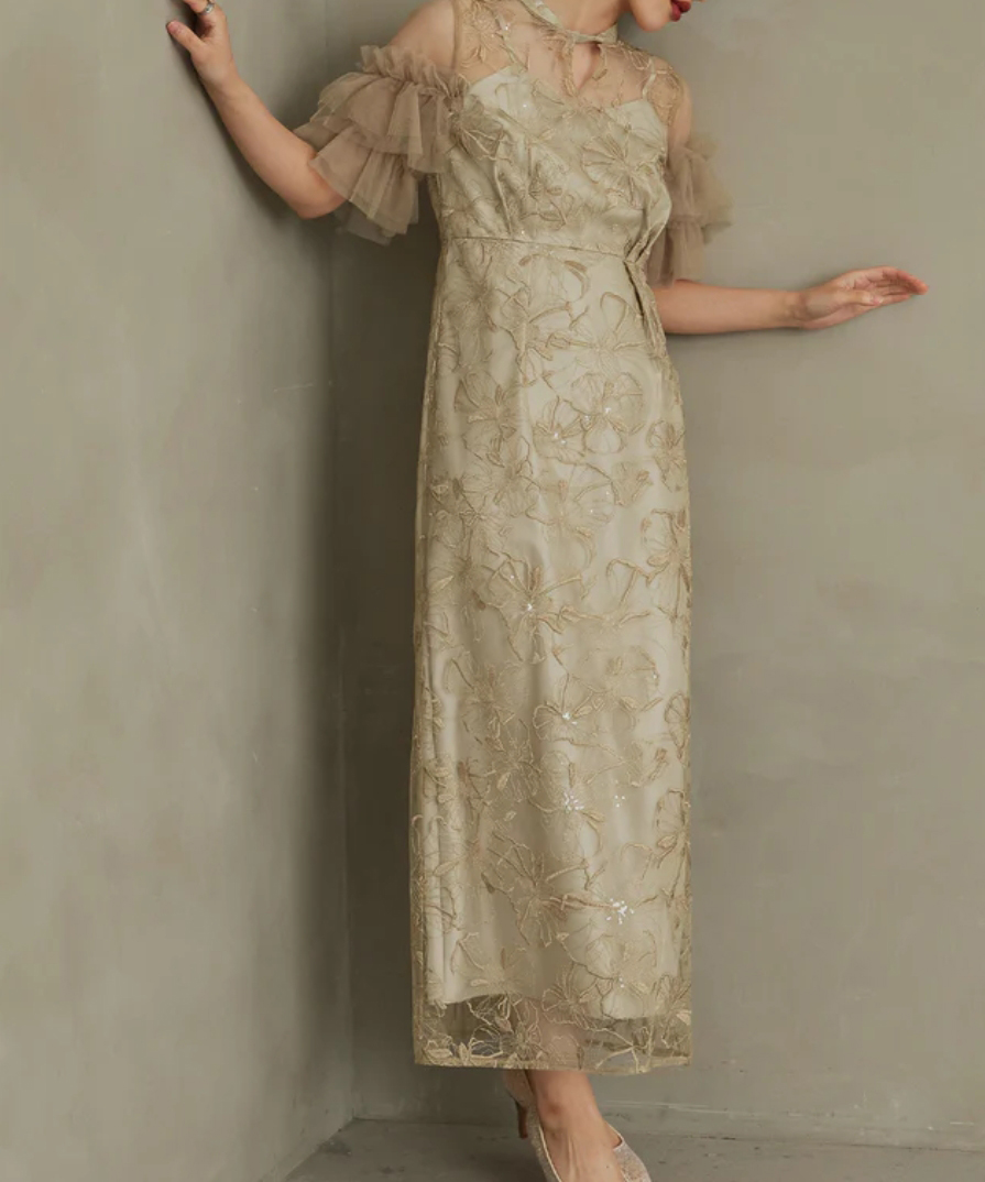印象的な花柄の刺繍レースにきらきら煌めくスパンコールを散りばめたドレス。