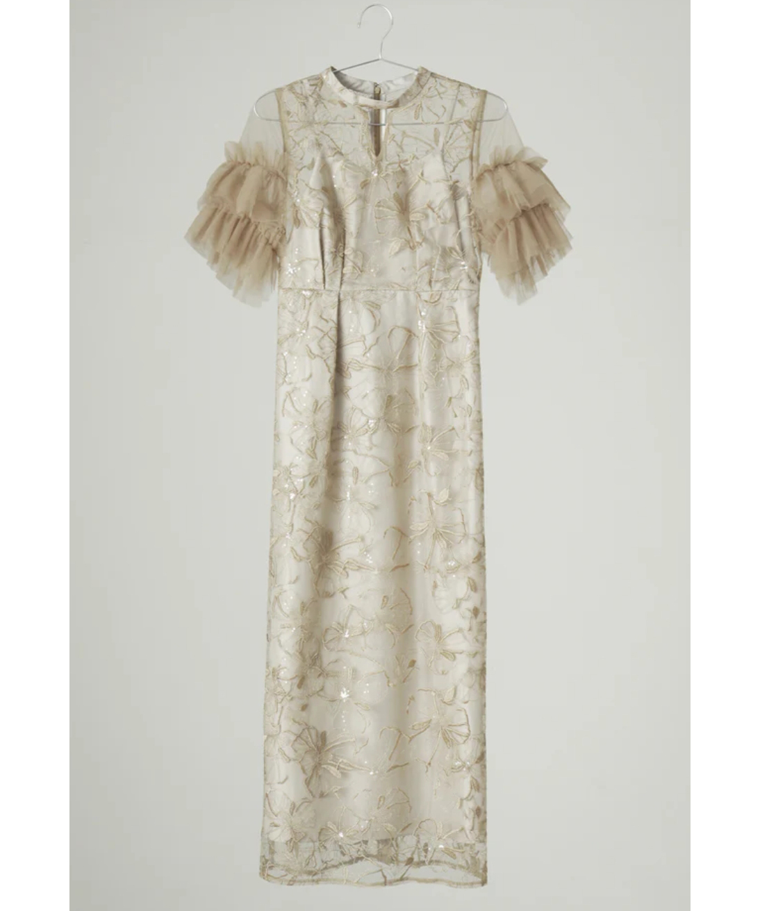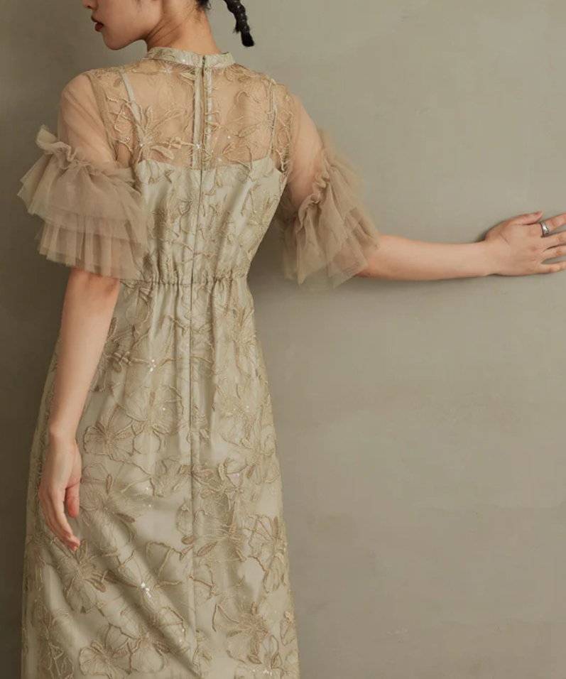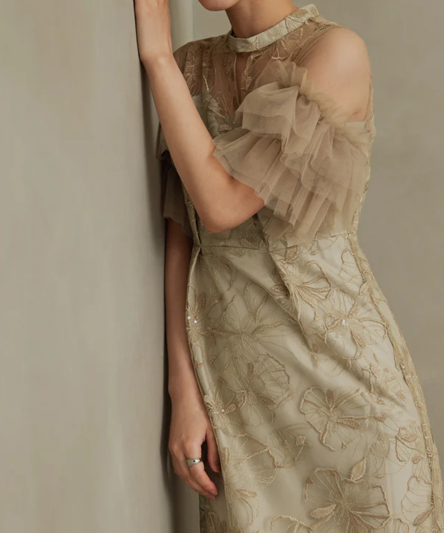 印象的な花柄の刺繍レースにきらきら煌めくスパンコールを散りばめたドレス。