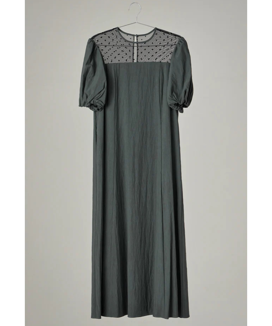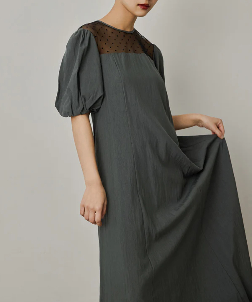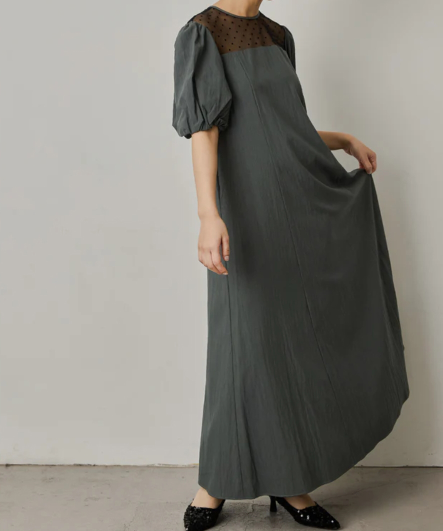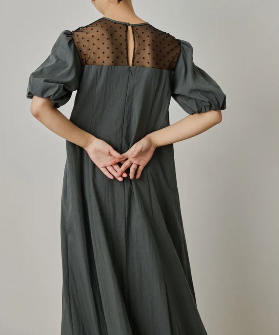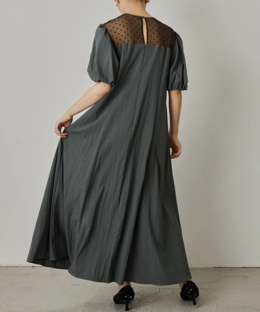 デコルテのチュールにドット柄が目を惹くAラインワンピース。