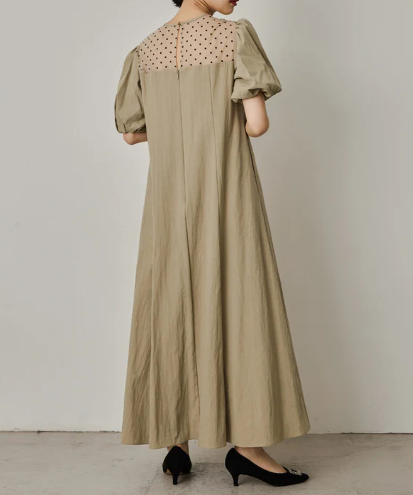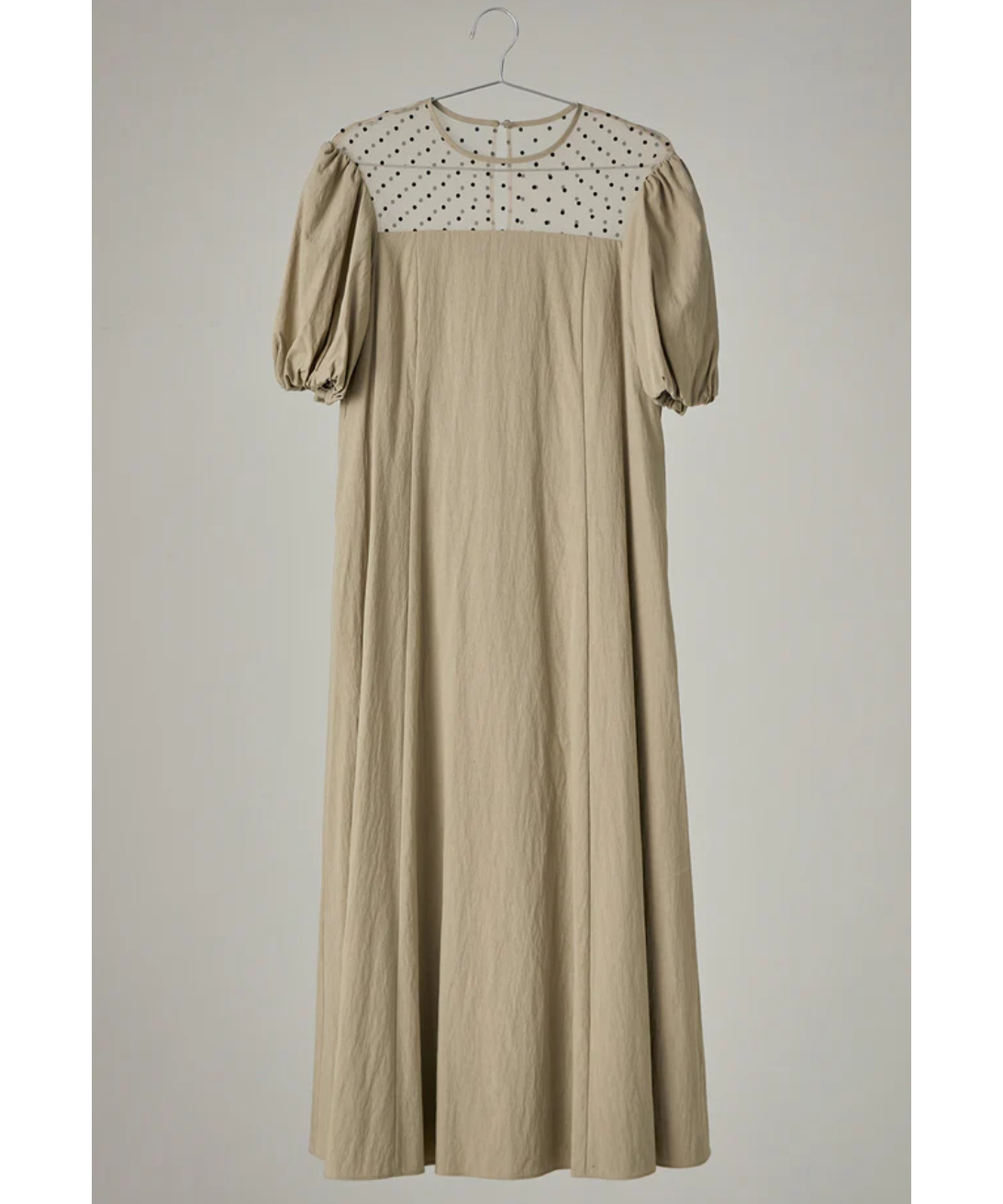 デコルテのチュールにドット柄が目を惹くAラインワンピース。
