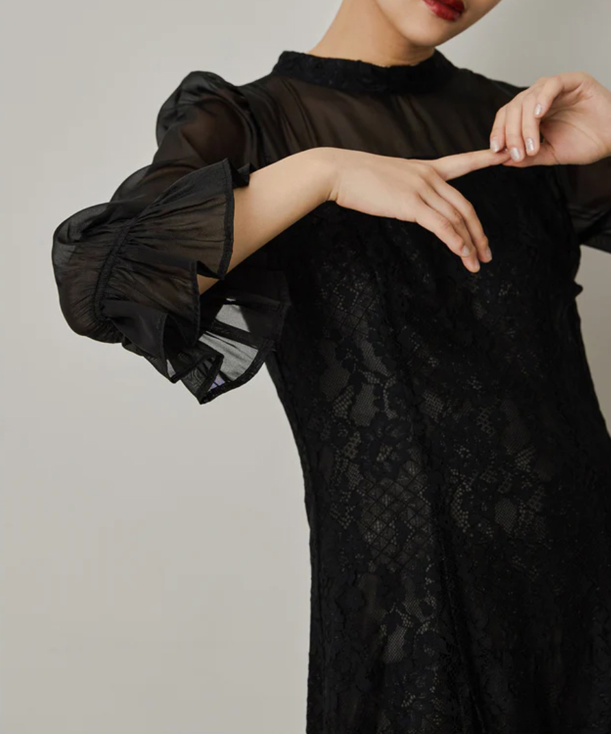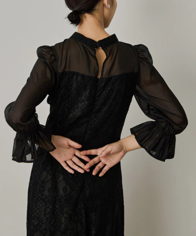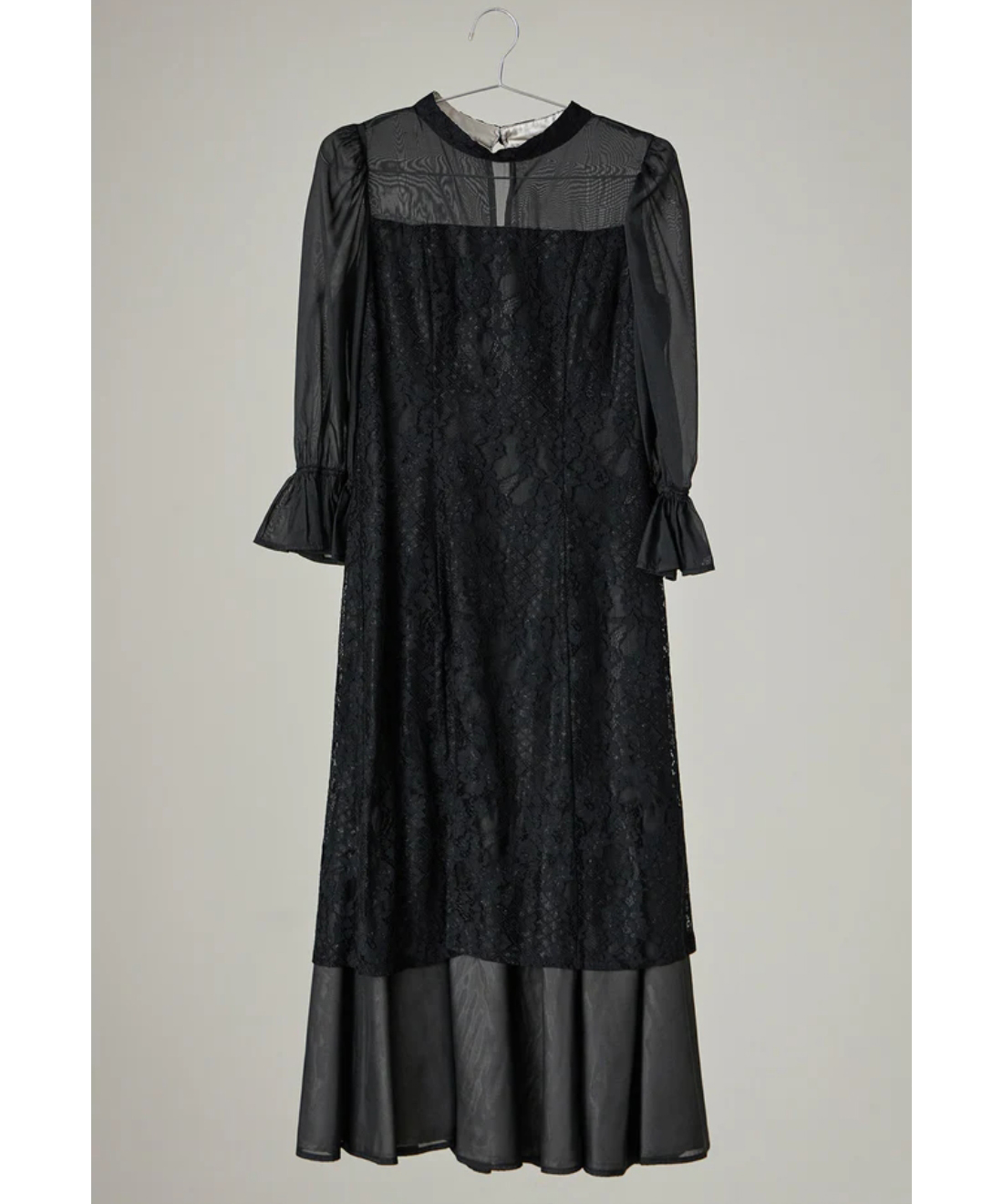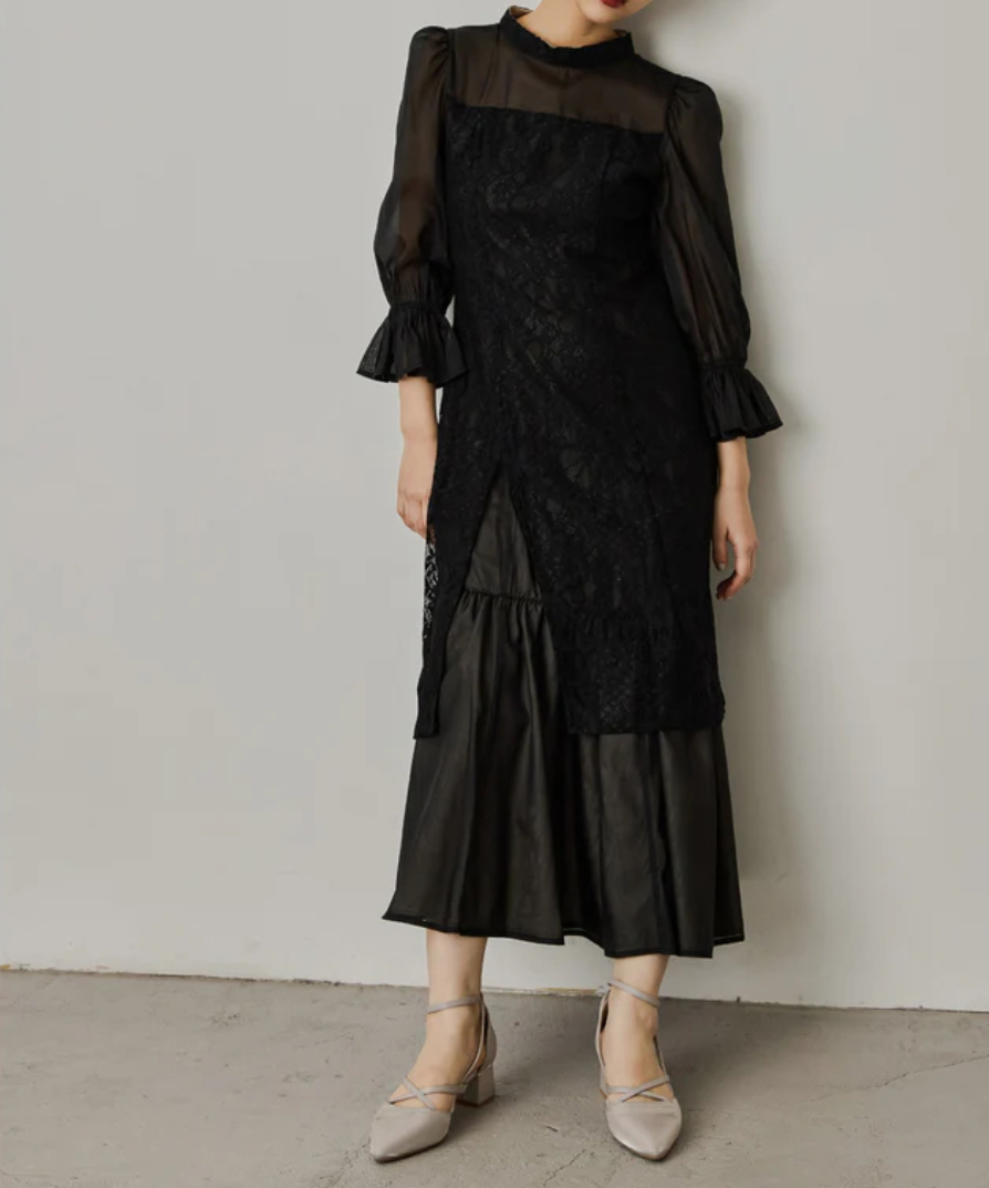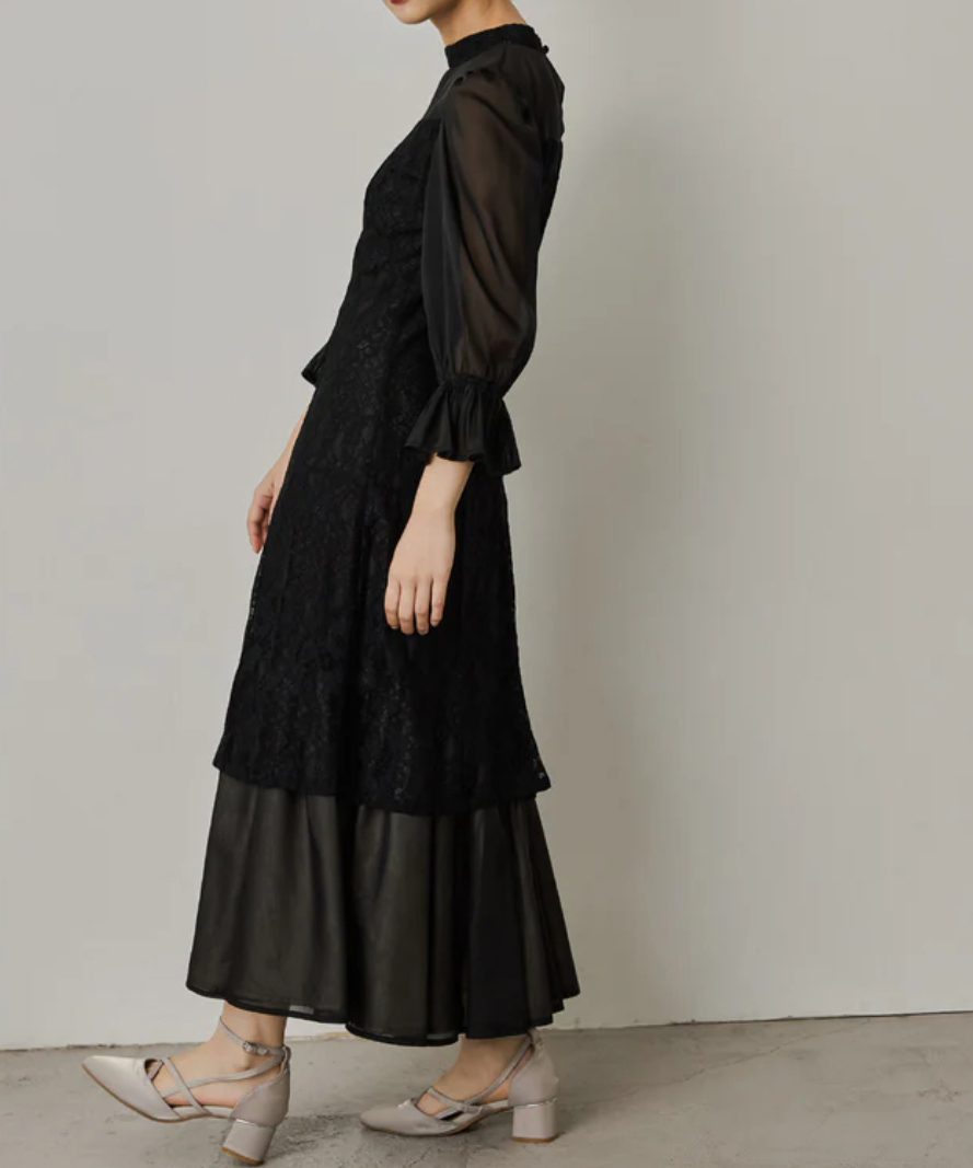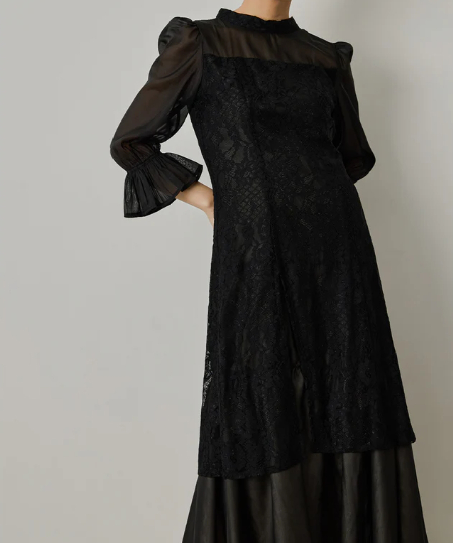 微細なラメ糸を練り込んだフラワーレースとオーガンジー素材をレイヤード風に仕立てたオケージョンドレス。