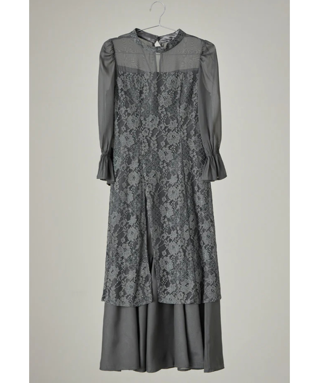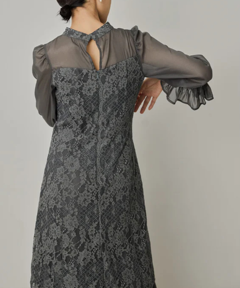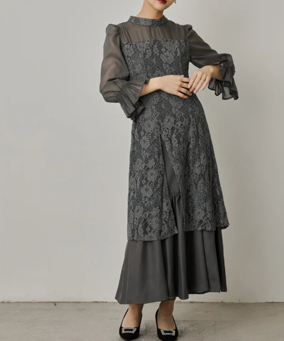 微細なラメ糸を練り込んだフラワーレースとオーガンジー素材をレイヤード風に仕立てたオケージョンドレス。