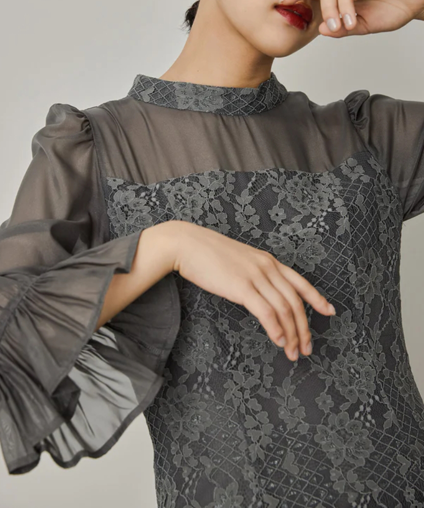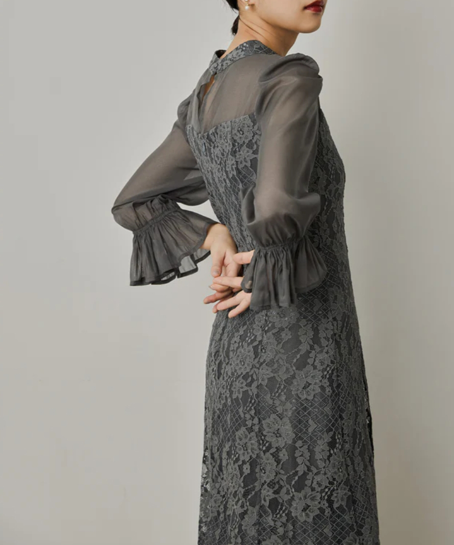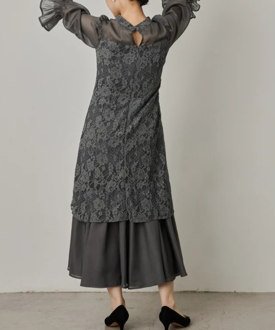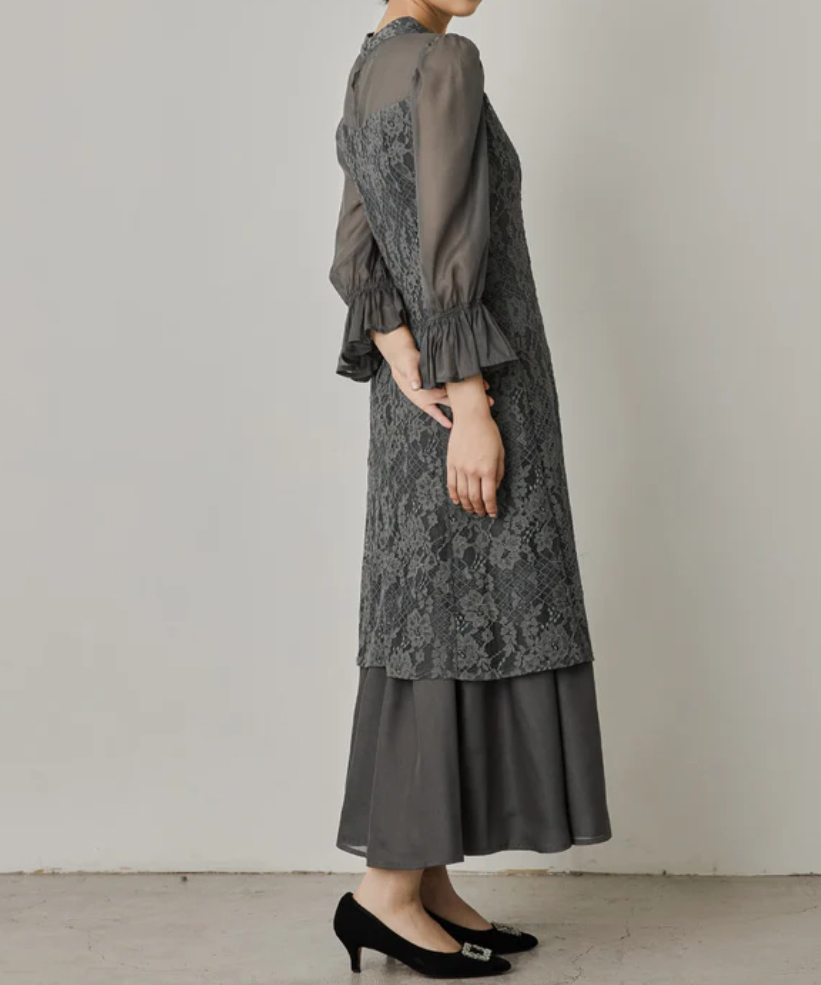 微細なラメ糸を練り込んだフラワーレースとオーガンジー素材をレイヤード風に仕立てたオケージョンドレス。