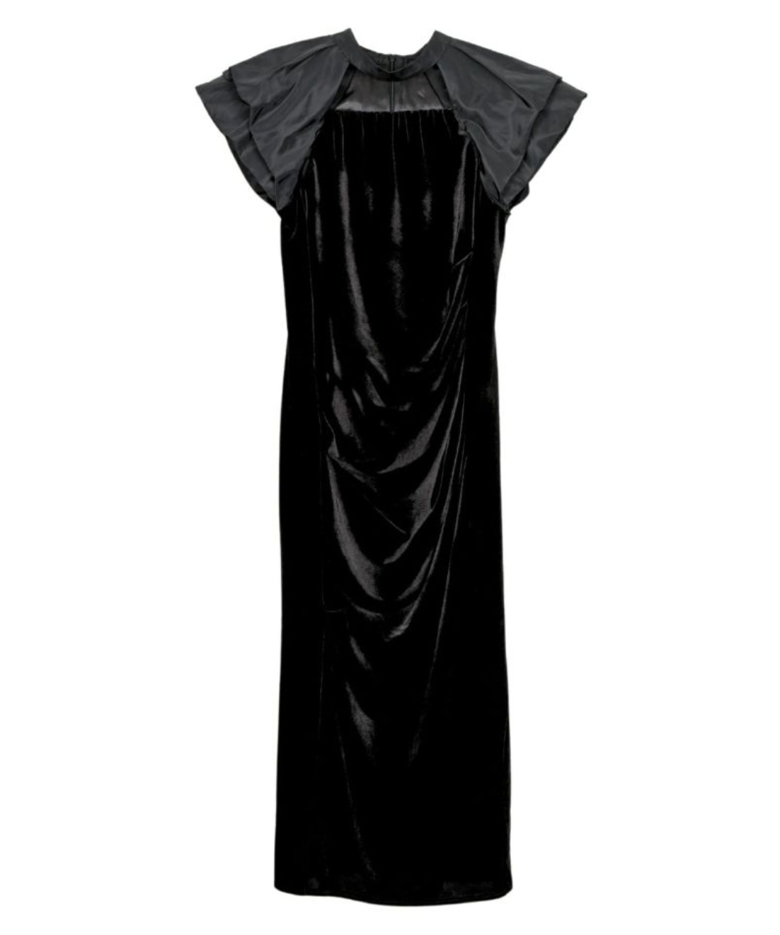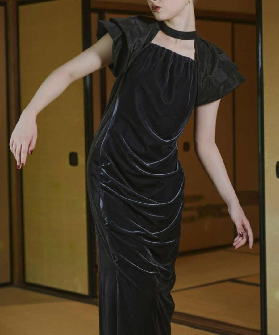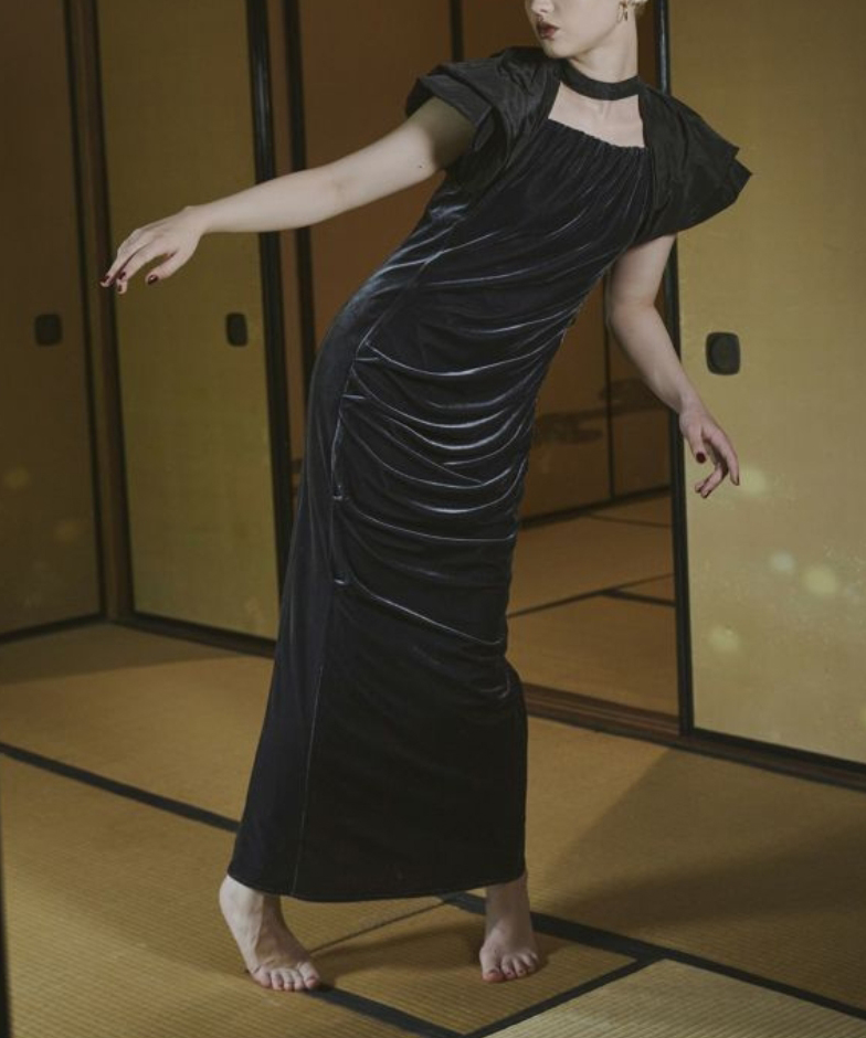 高級感あるベロア素材とドレープデザインで、華やかなオケージョンにぴったりの一着。