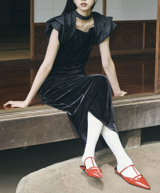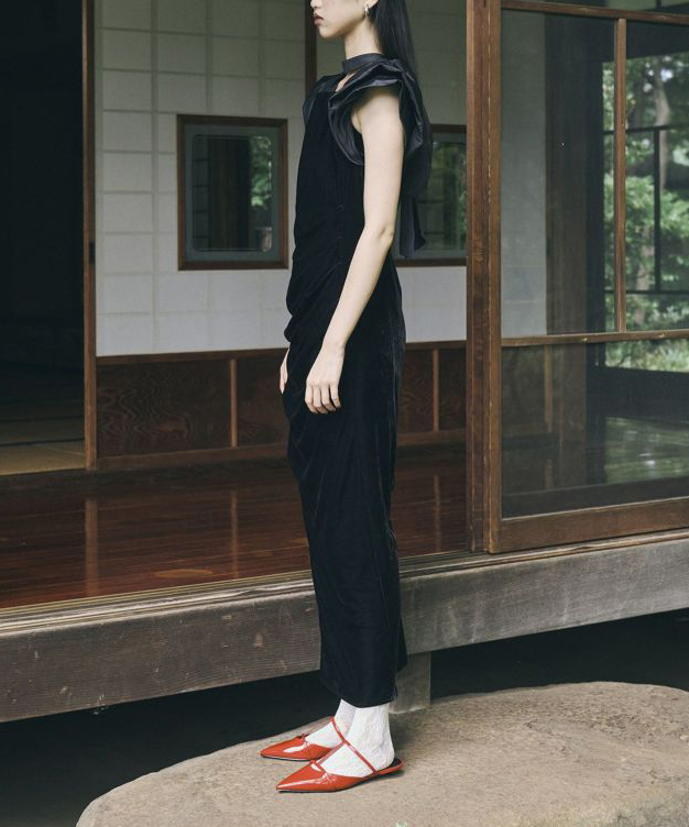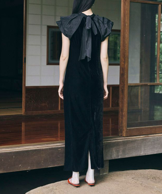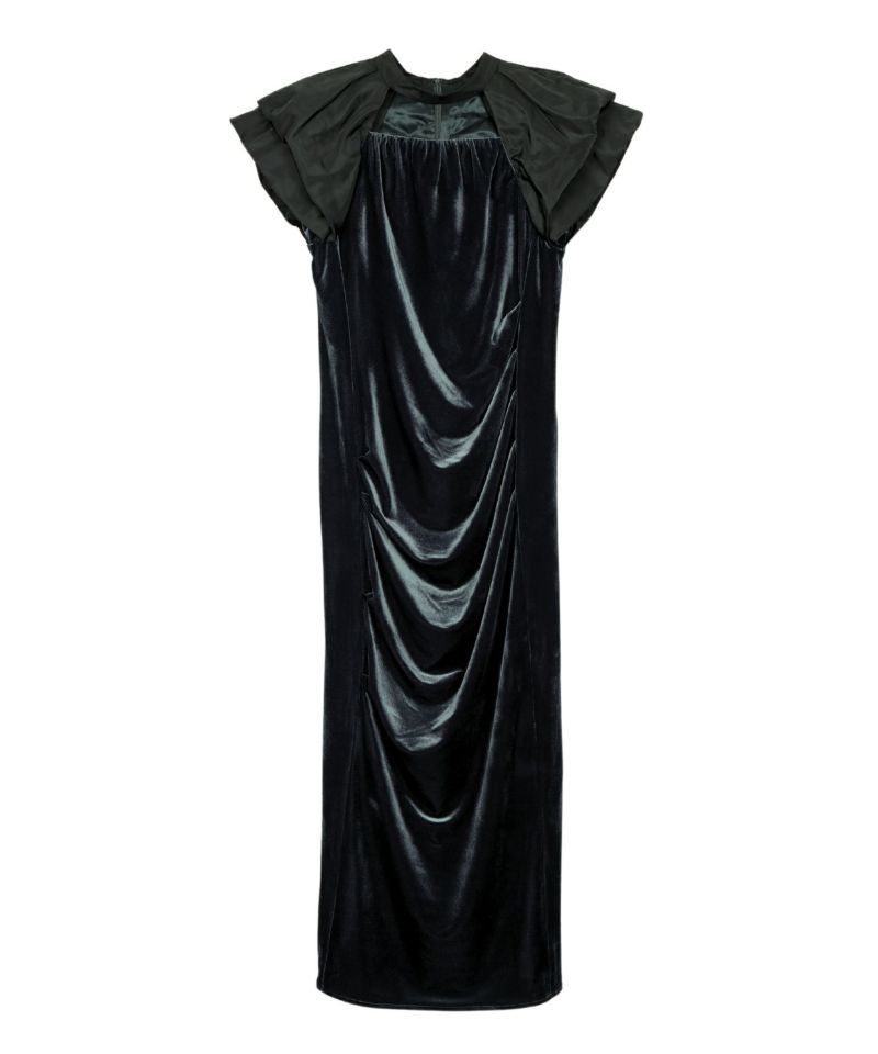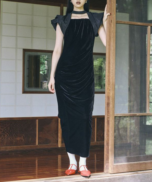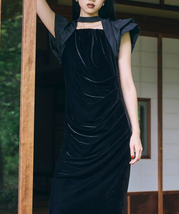 高級感あるベロア素材とドレープデザインで、華やかなオケージョンにぴったりの一着。