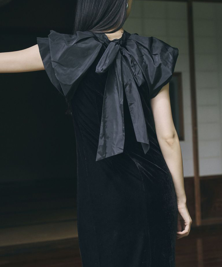 タフタ素材のバルーンスリーブとバックリボンが、顔まわりと後ろ姿を華やかに演出します。