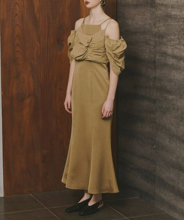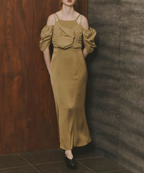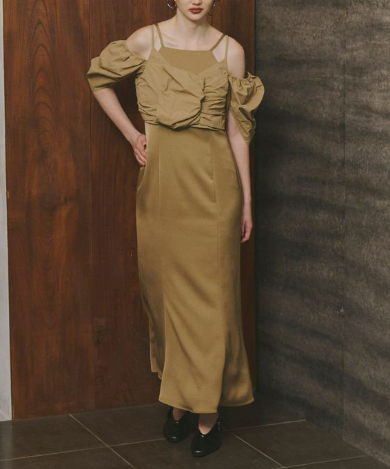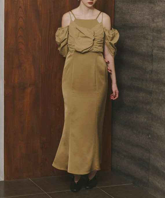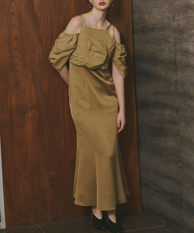 ワンピースは、形状記憶風ナイロンとマットなサテン素材を使用し、マーメイドラインでありながら程よくフィットするシルエットです。