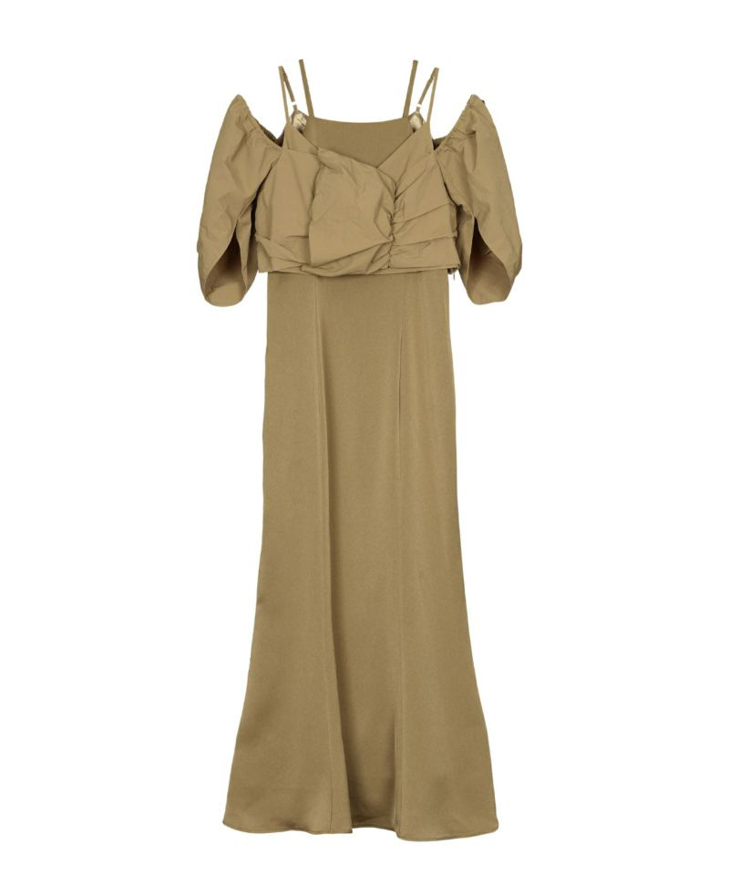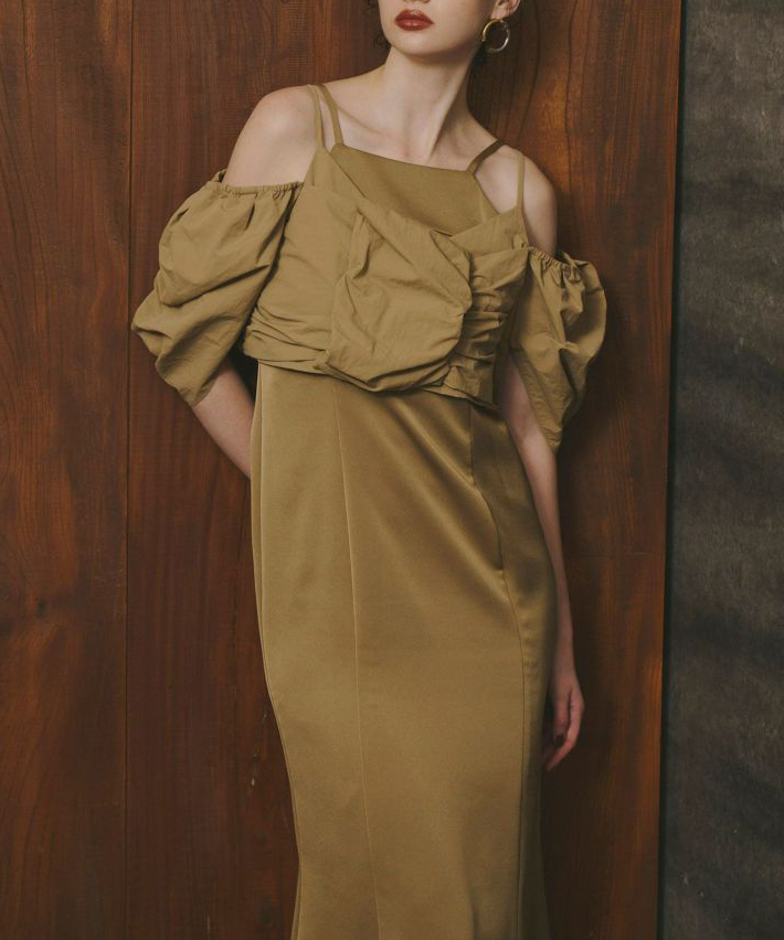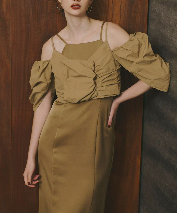 グログラン生地のリボンディテールとボリューム袖が特徴的なトップスで、2way仕様の肩紐が魅力のドレス。