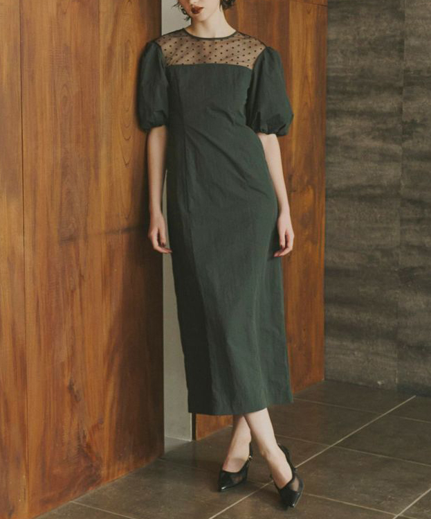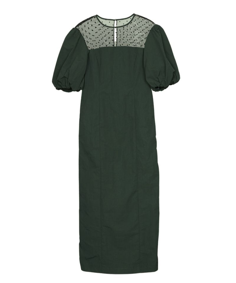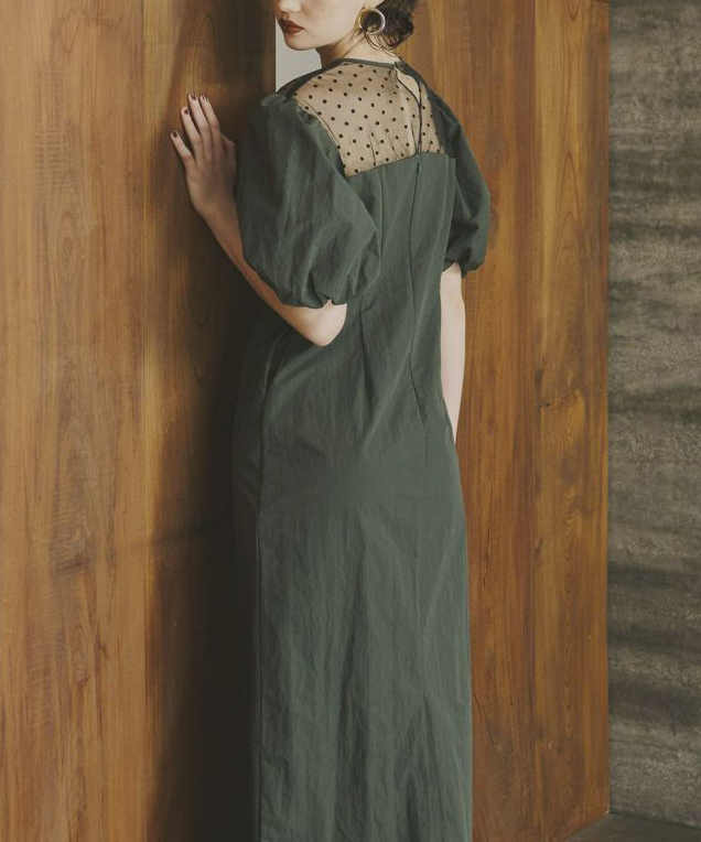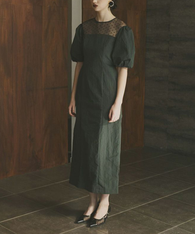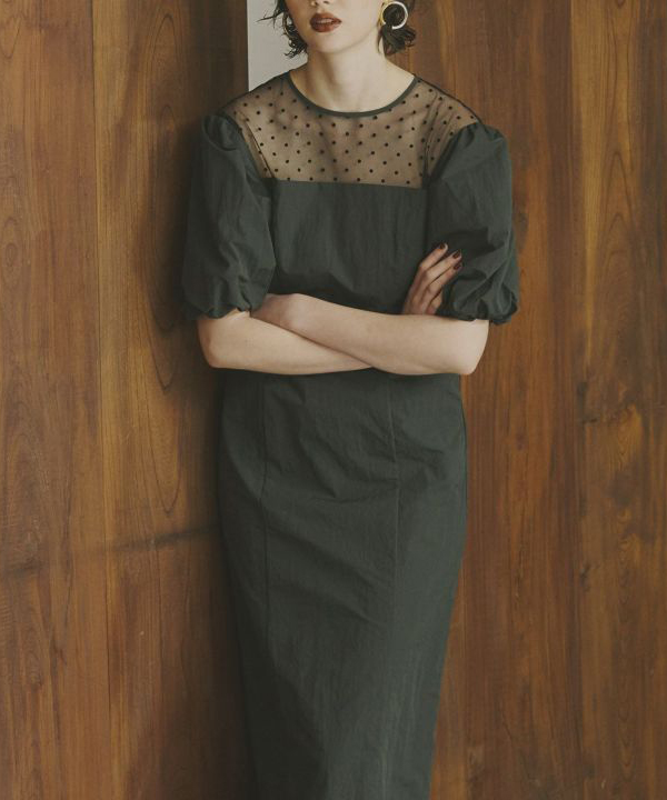 デコルテのドットフロッキーのチュールとボリュームたっぷりのパフスリーブが、女性らしさを引き立てるデザインです。