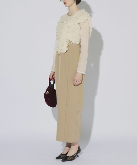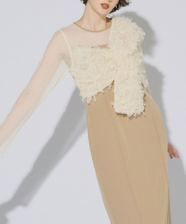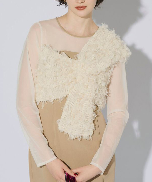 トップにはラメ糸と光沢糸をMIXしたチュールフリンジ素材を使用し、ボリューム感で華やかさを演出。