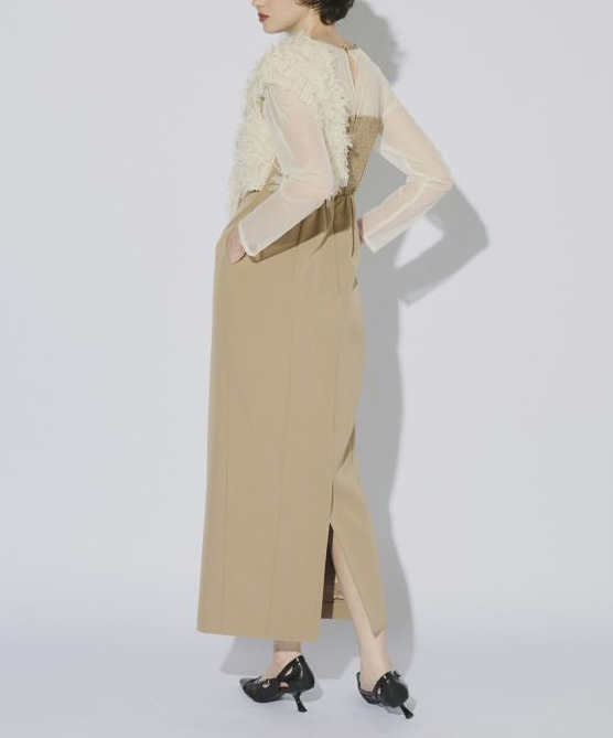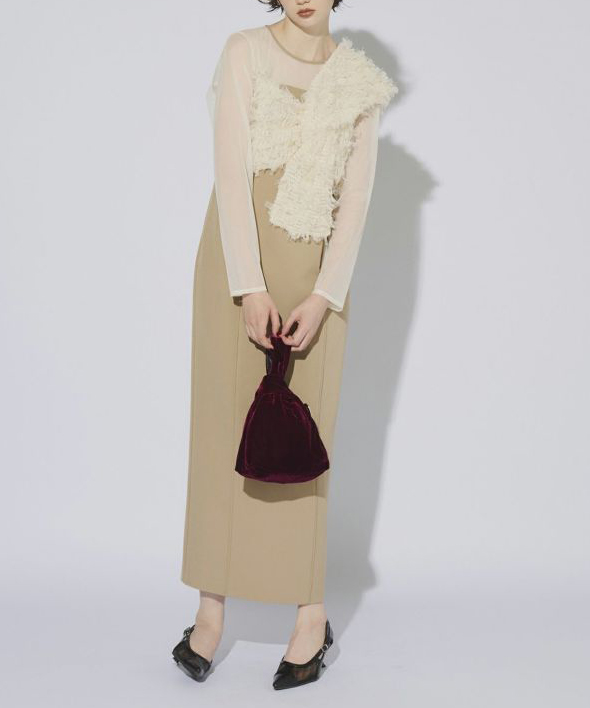 スリーブはタイトなシルエットでバランスを調整し、Iラインを意識したデザインで、ボディラインを拾いにくい素材感に仕上げています。