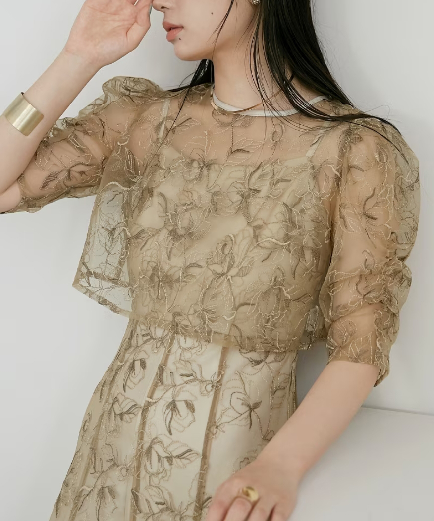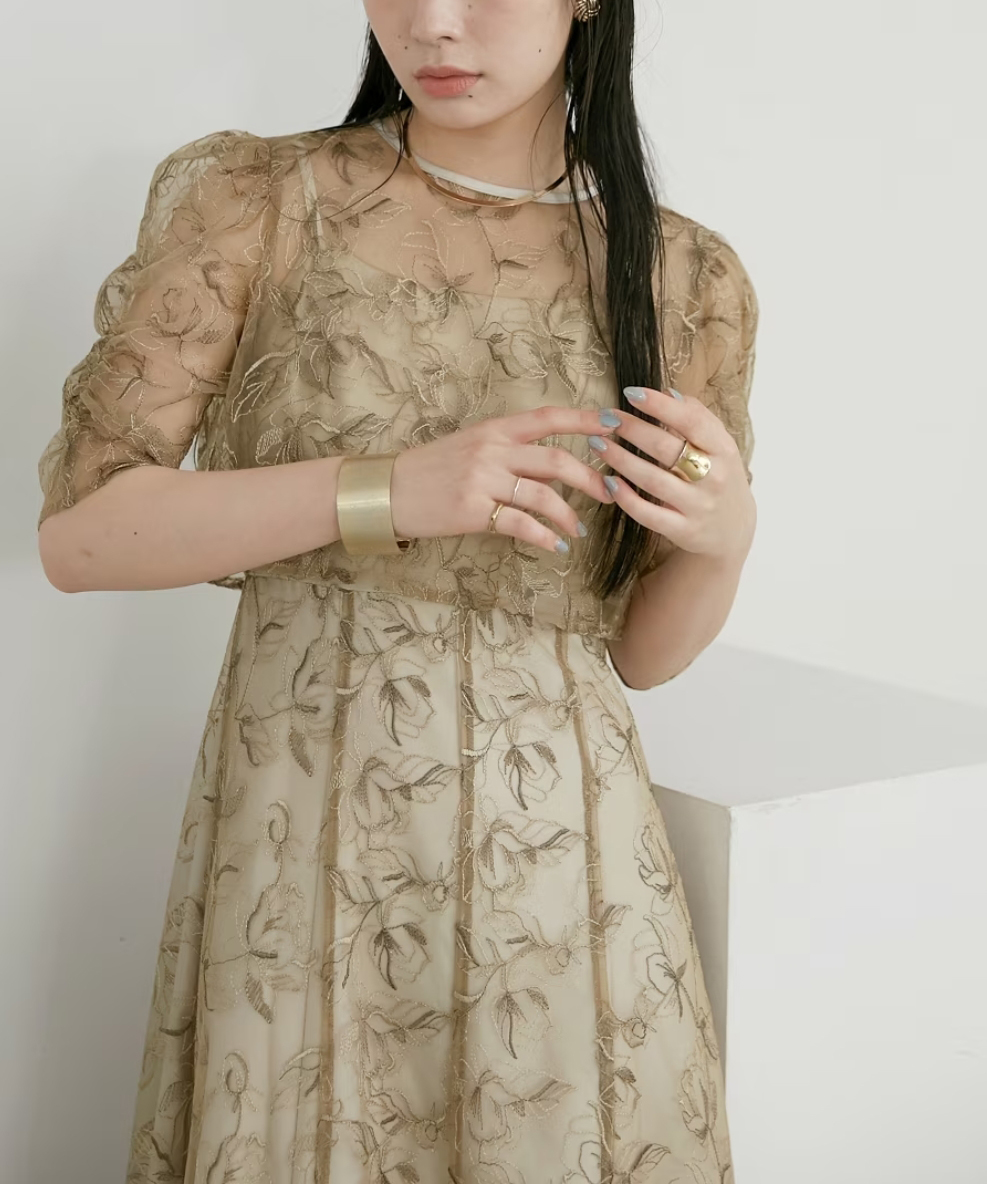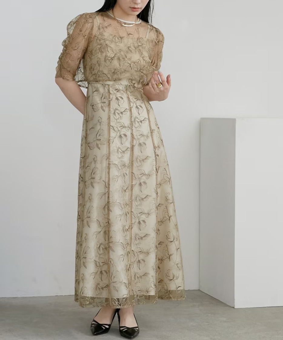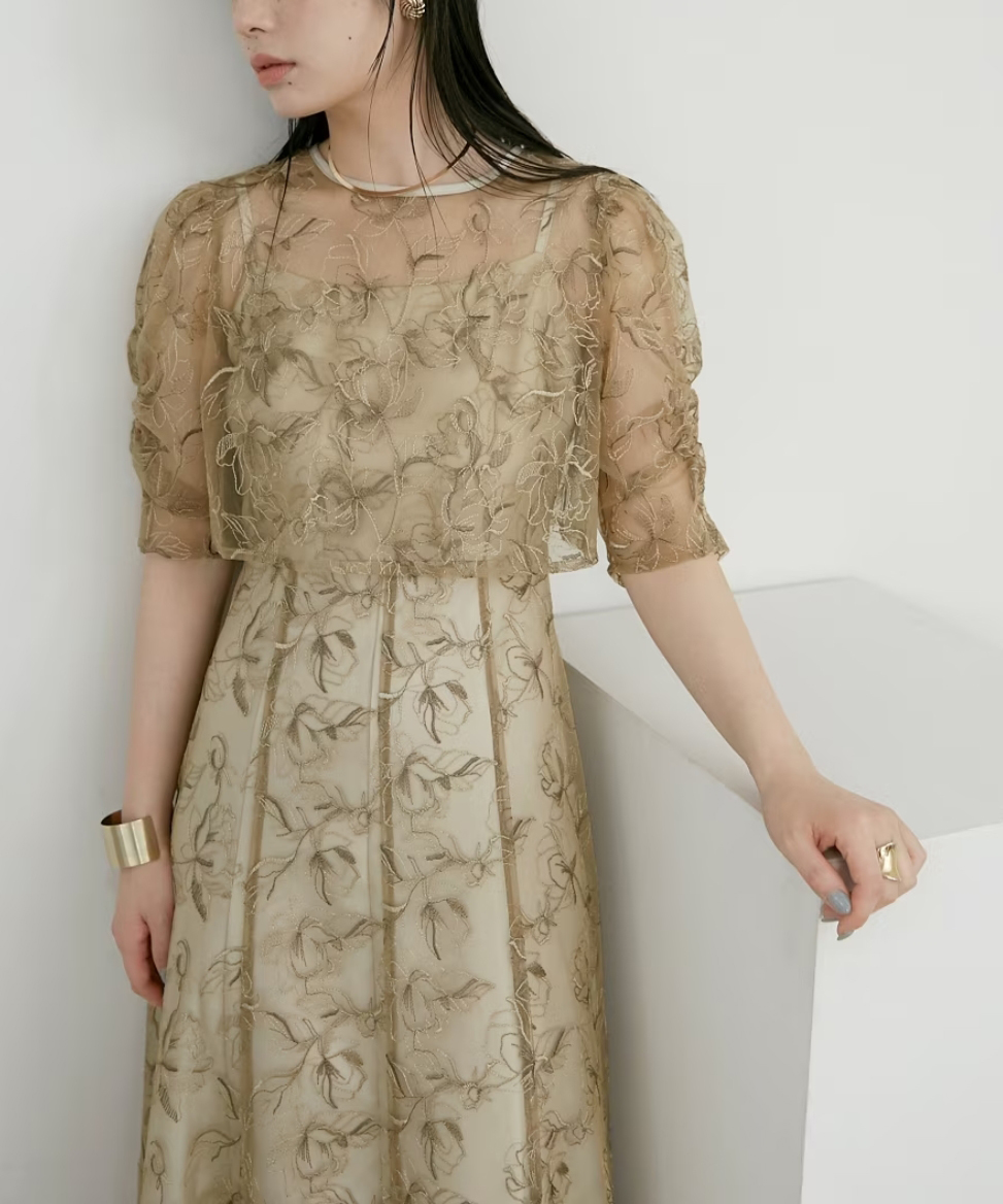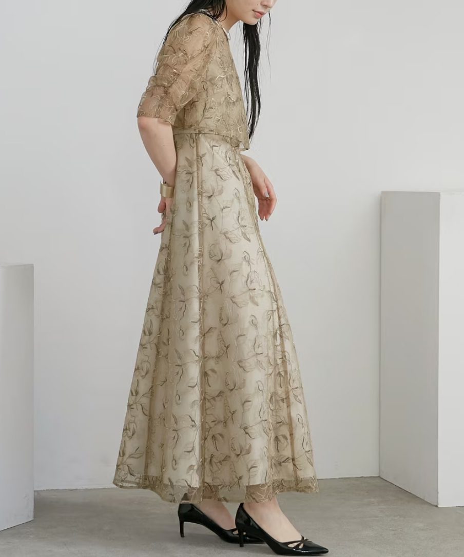 繊細な刺繍レースを使用した上品なワンピースドレス。