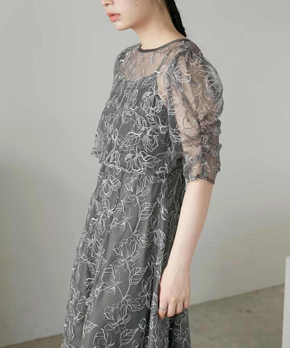 繊細な刺繍レースを使用した上品なワンピースドレス。