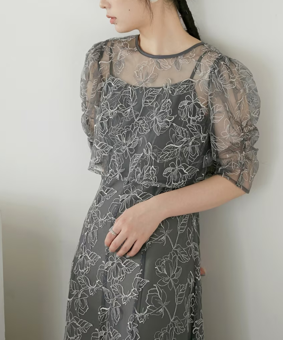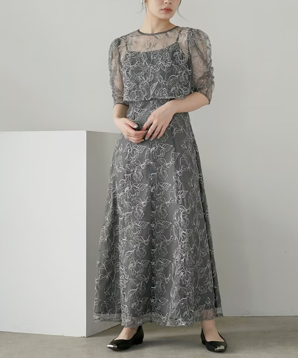繊細な刺繍レースを使用した上品なワンピースドレス。