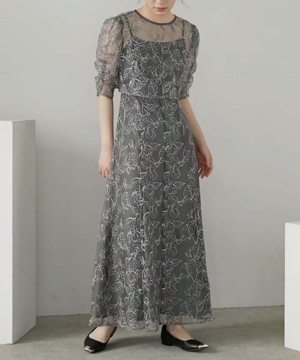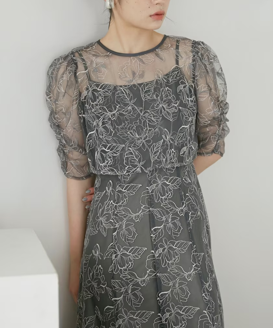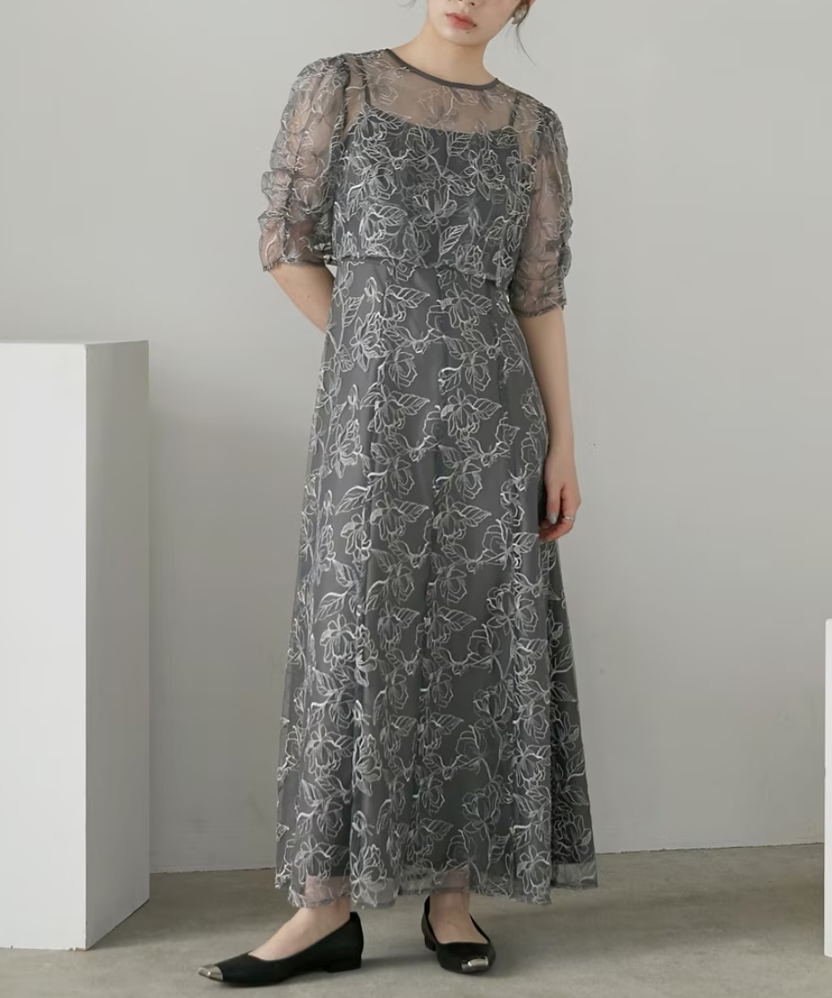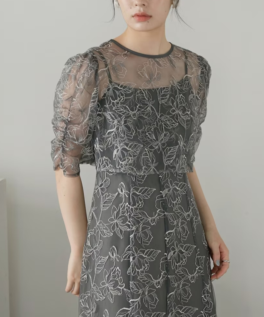 繊細な刺繍レースを使用した上品なワンピースドレス。