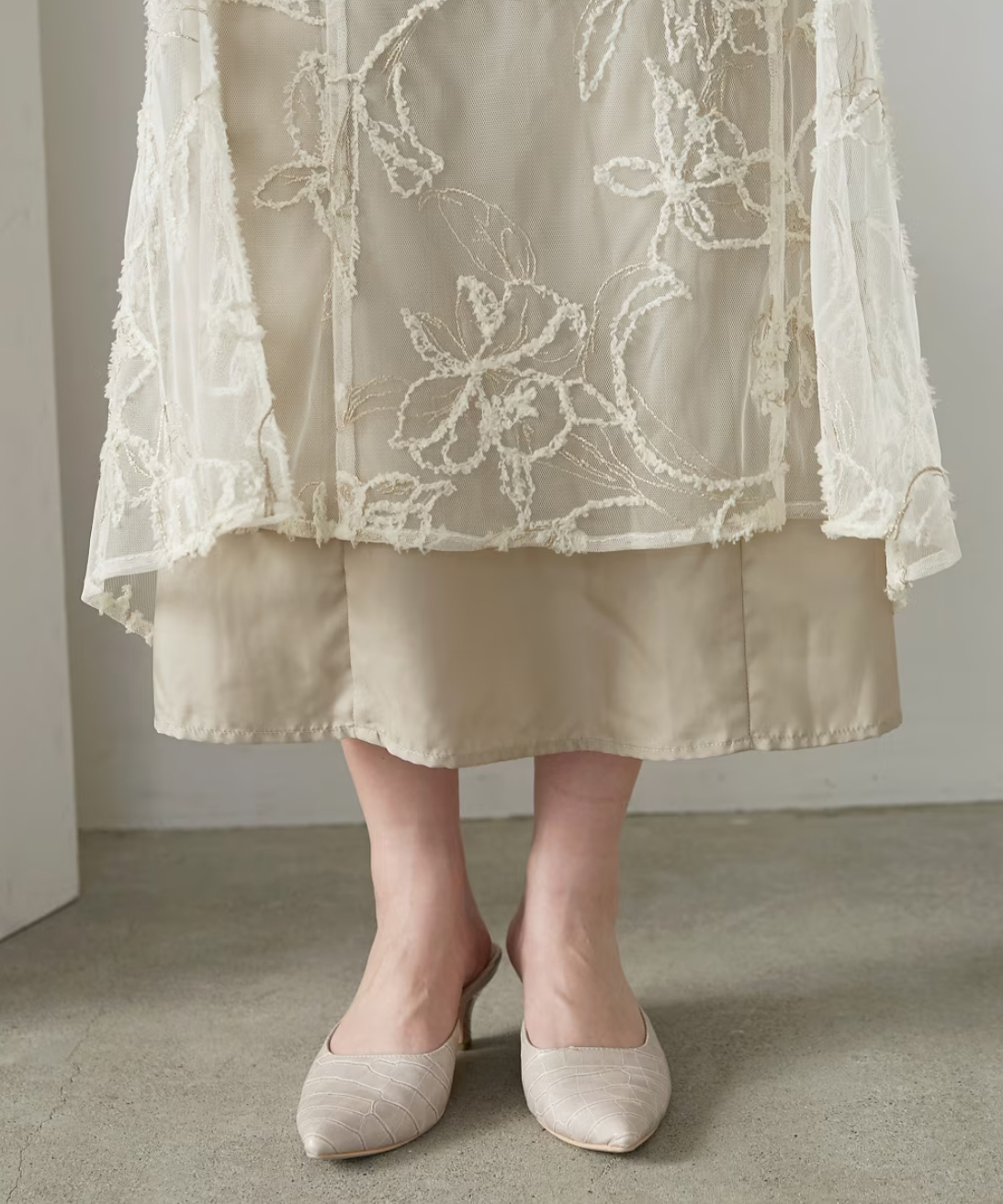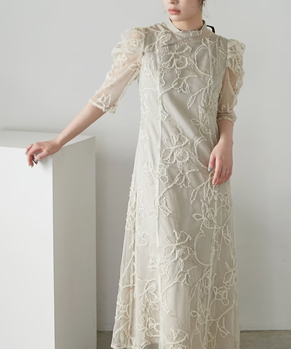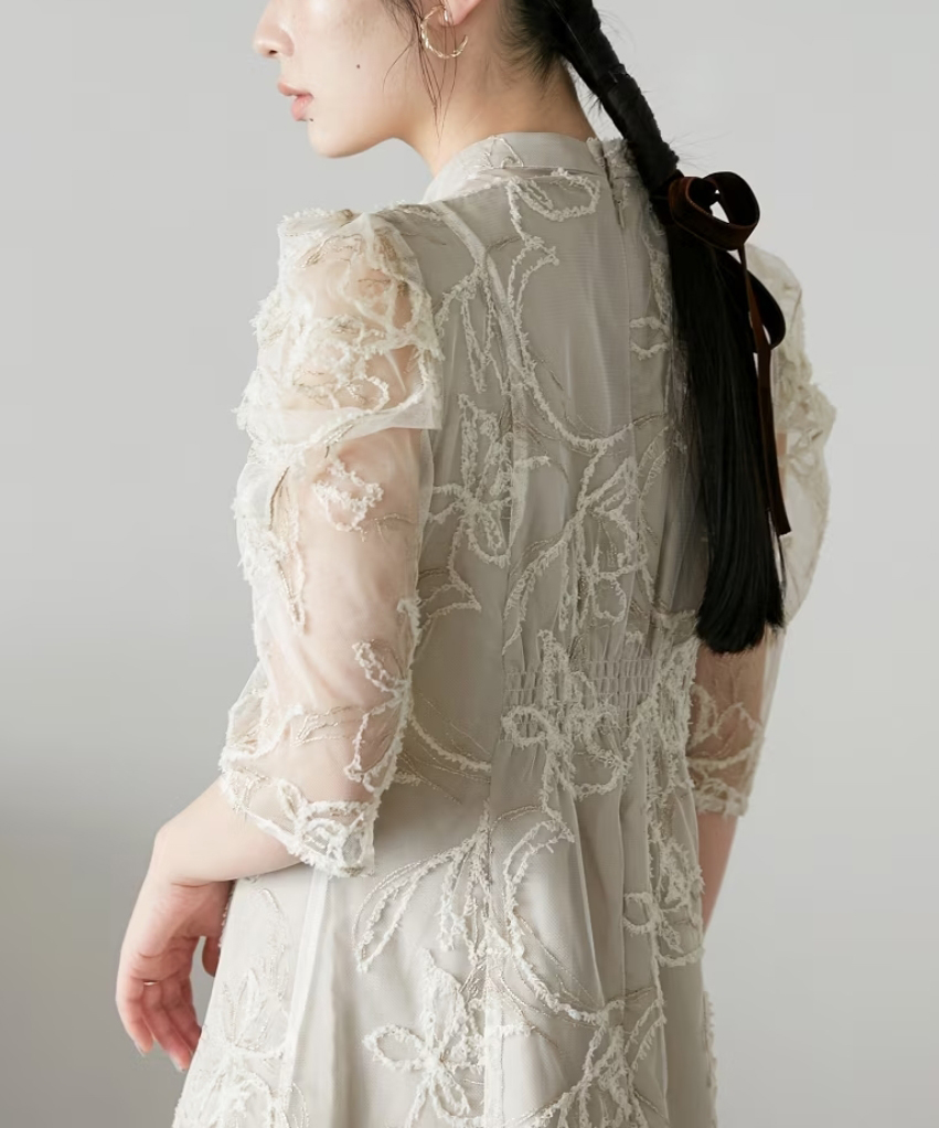 フリンジアクセントとラメ入り刺繍が華やかな印象を与えるチュール刺繍レース生地のワンピースドレス。