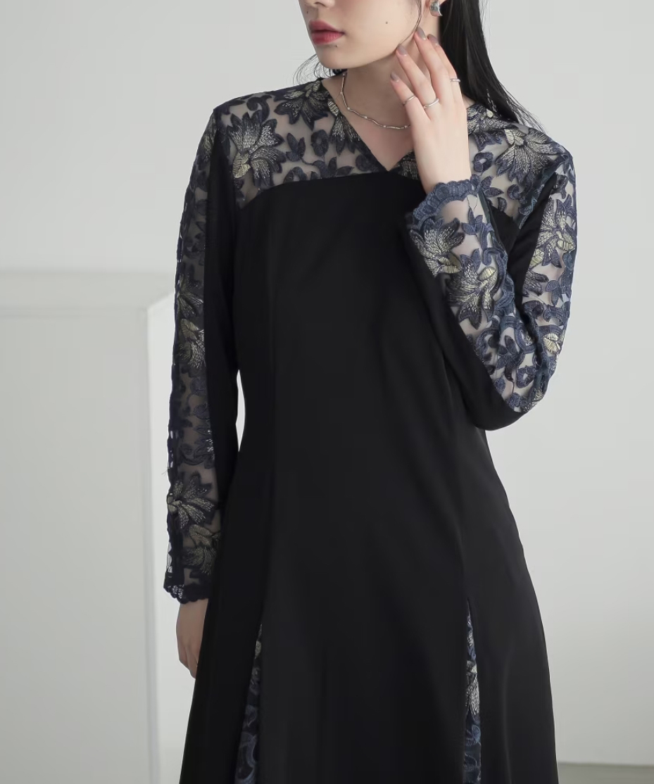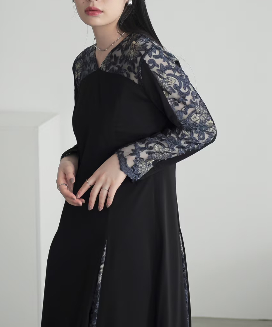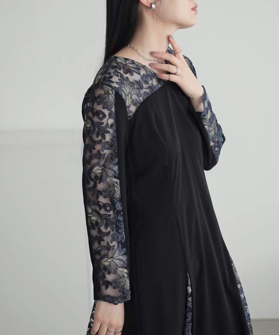 繊細なチュール刺繍が上品な印象を与えるワンピースドレス。
