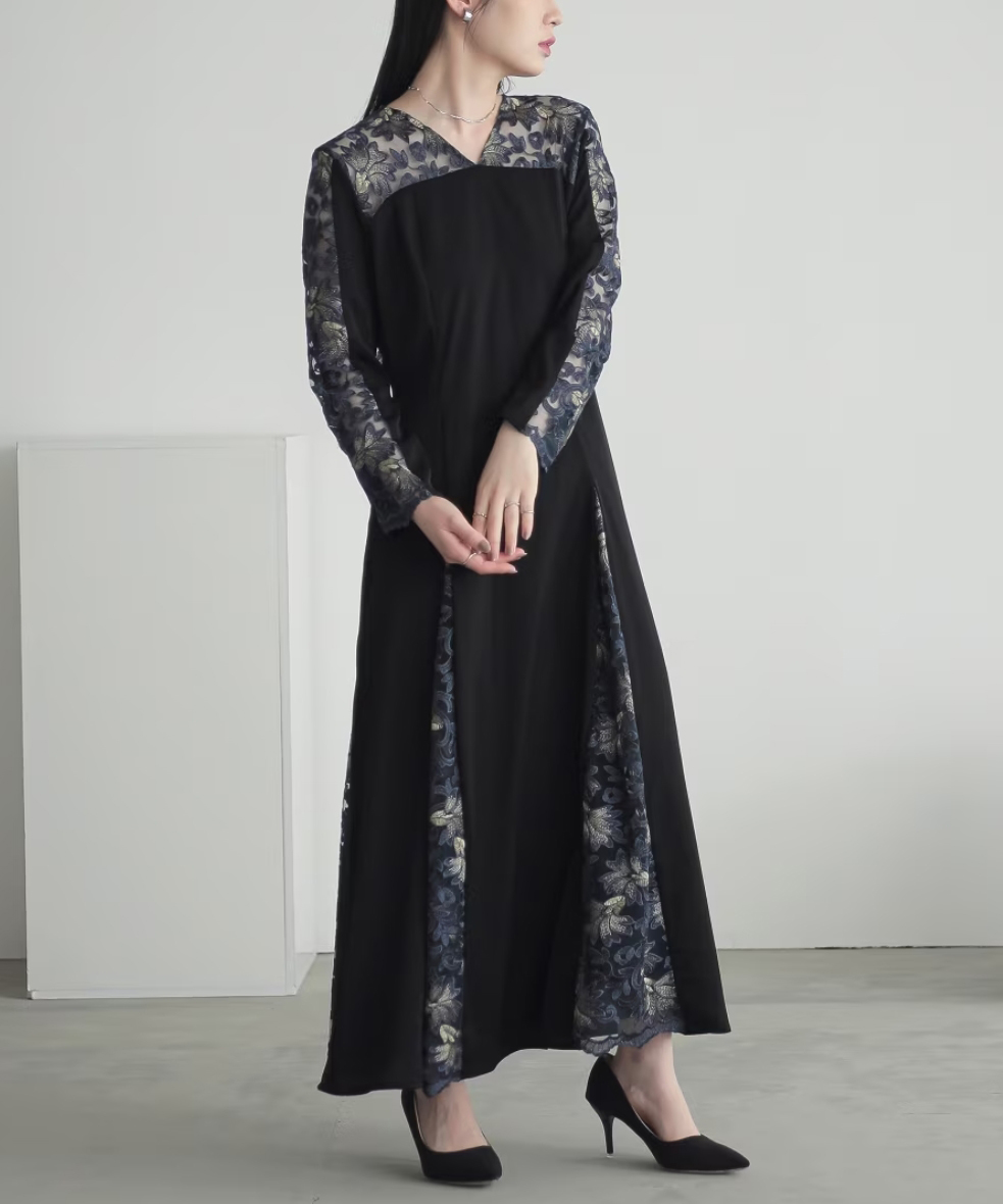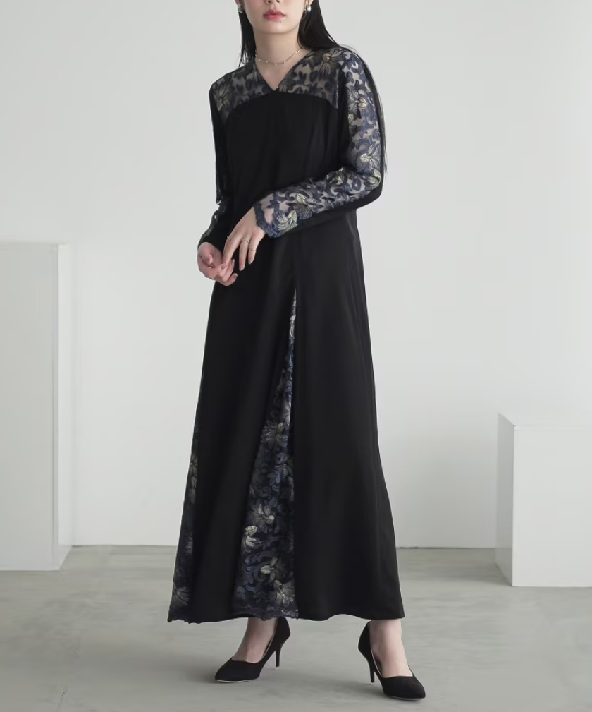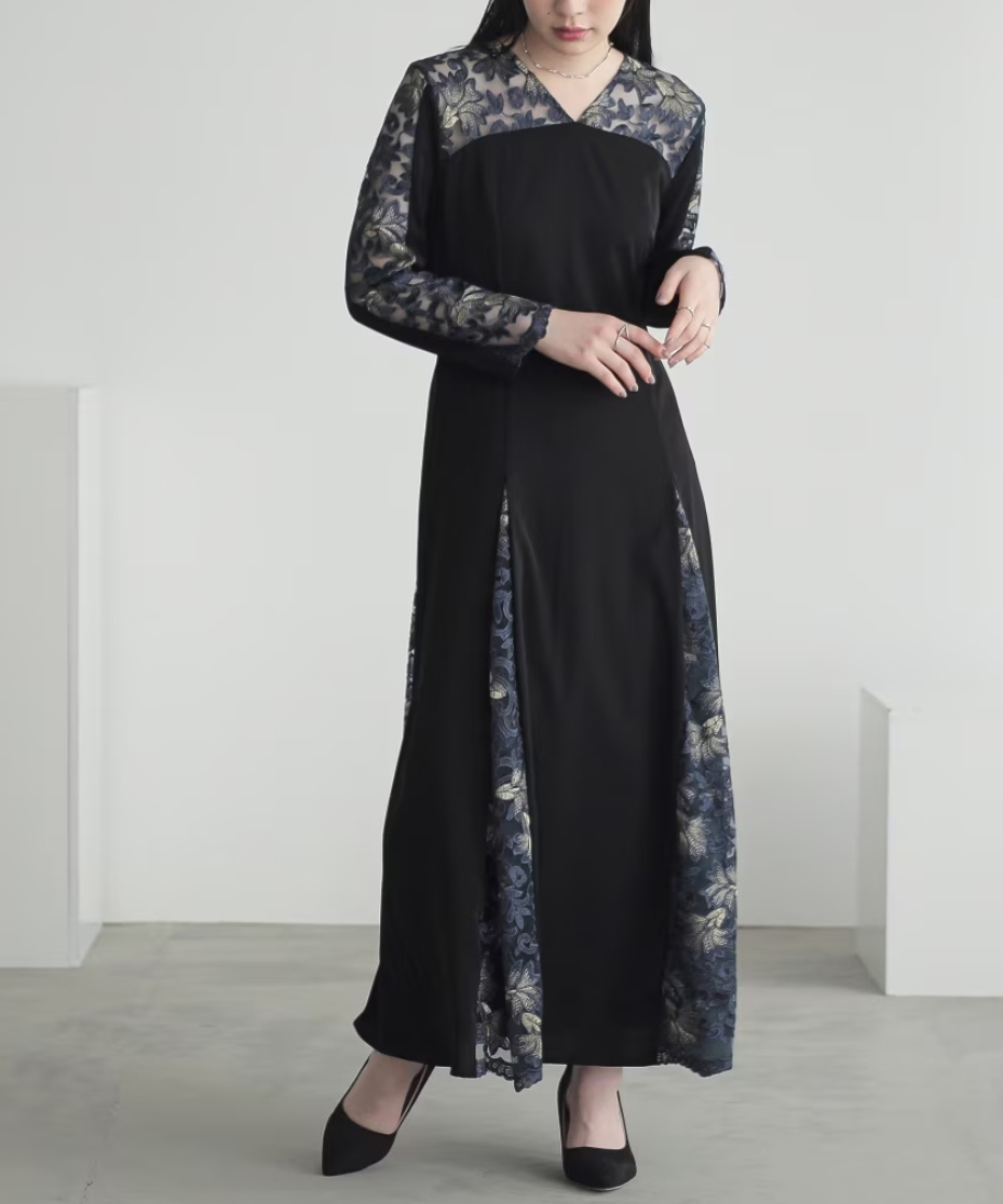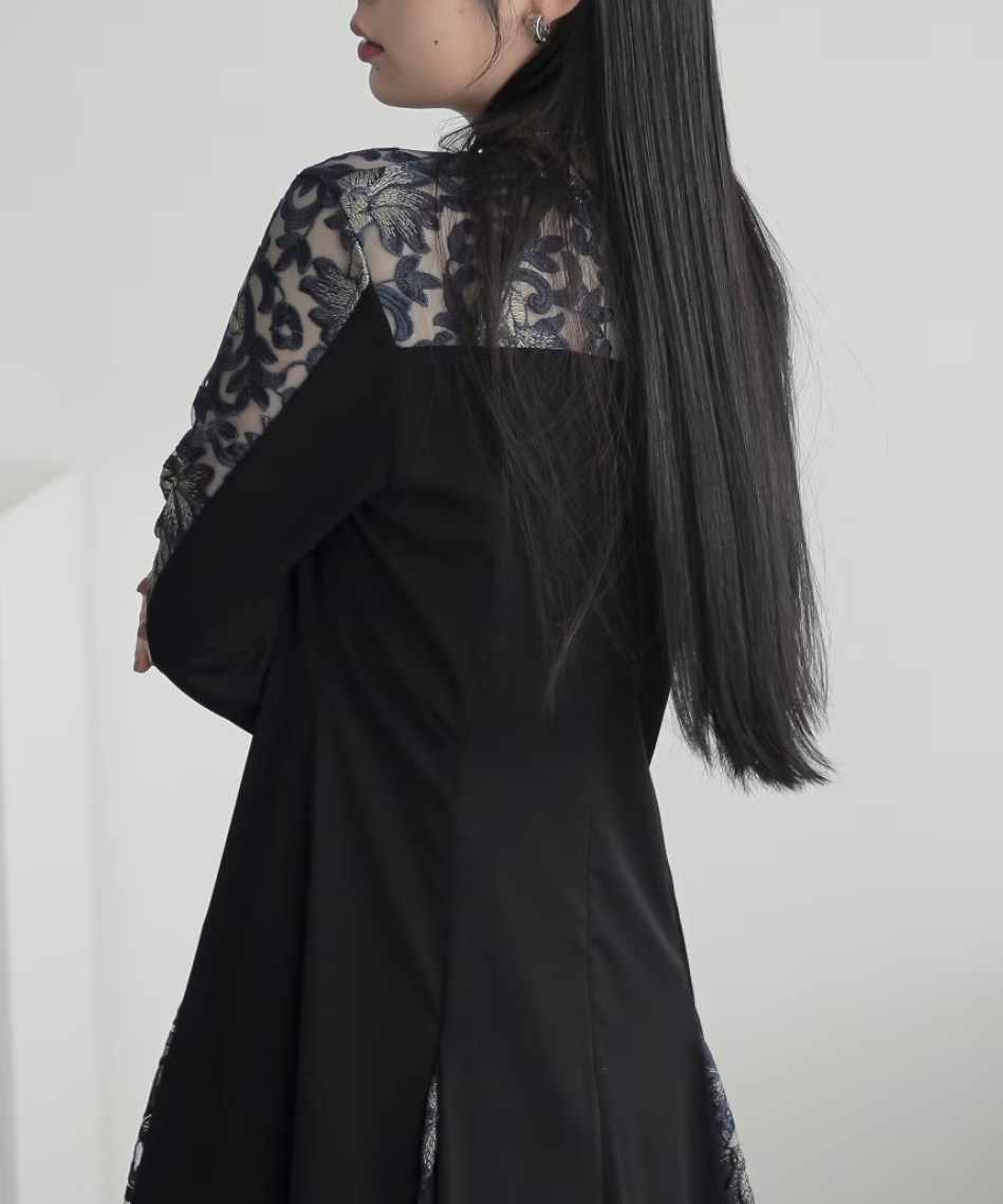 繊細なチュール刺繍が上品な印象を与えるワンピースドレス。
