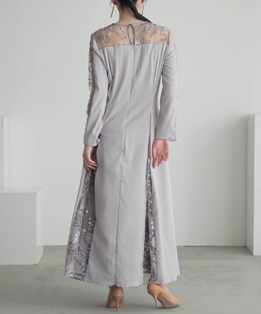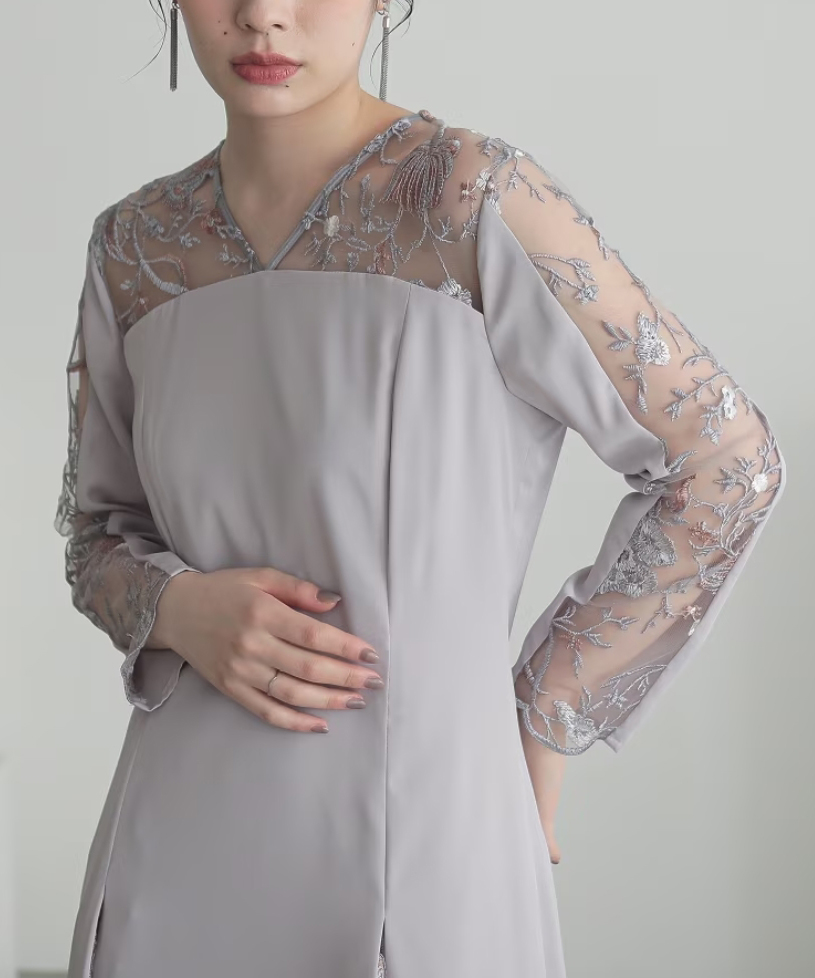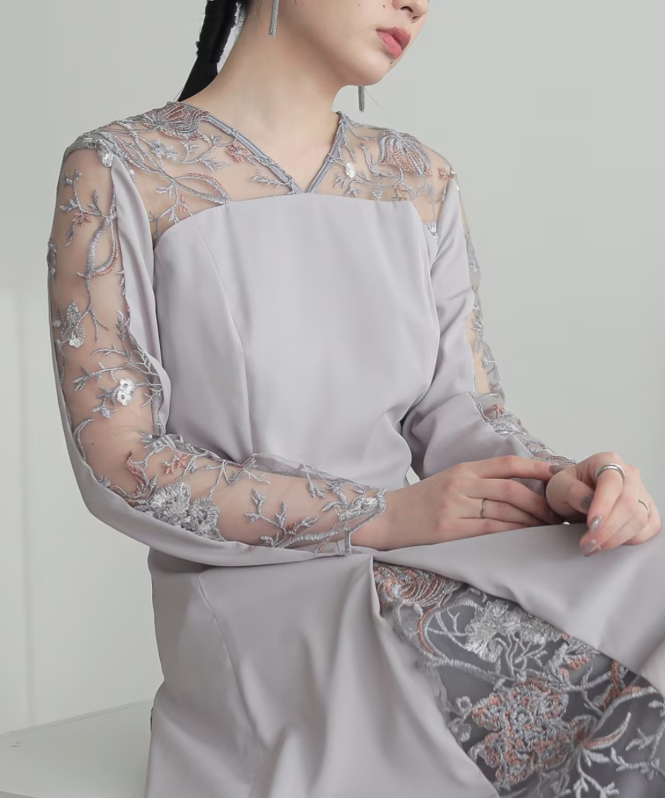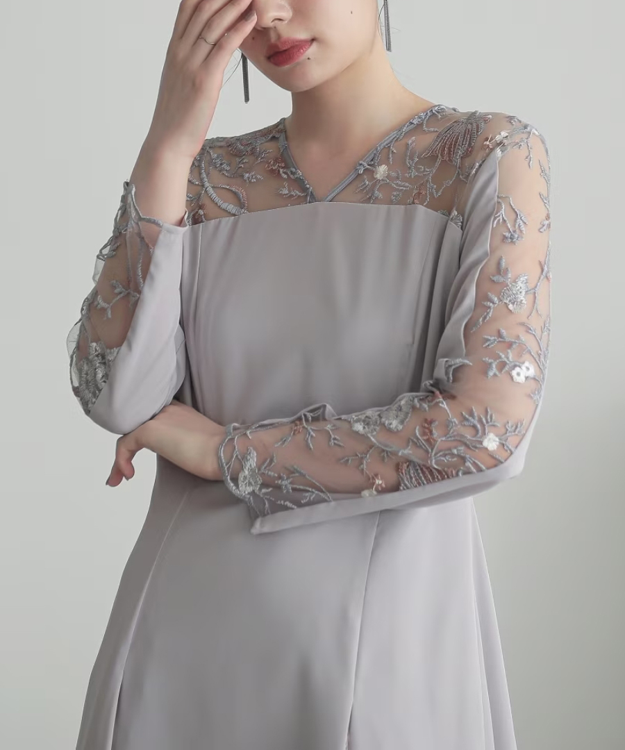 繊細なチュール刺繍が上品な印象を与えるワンピースドレス。