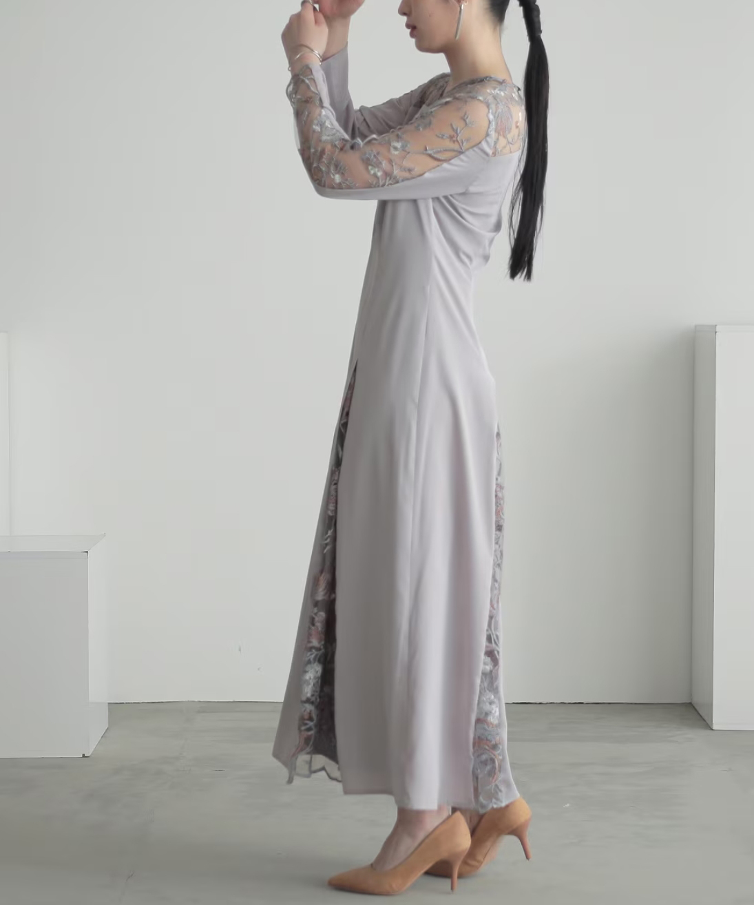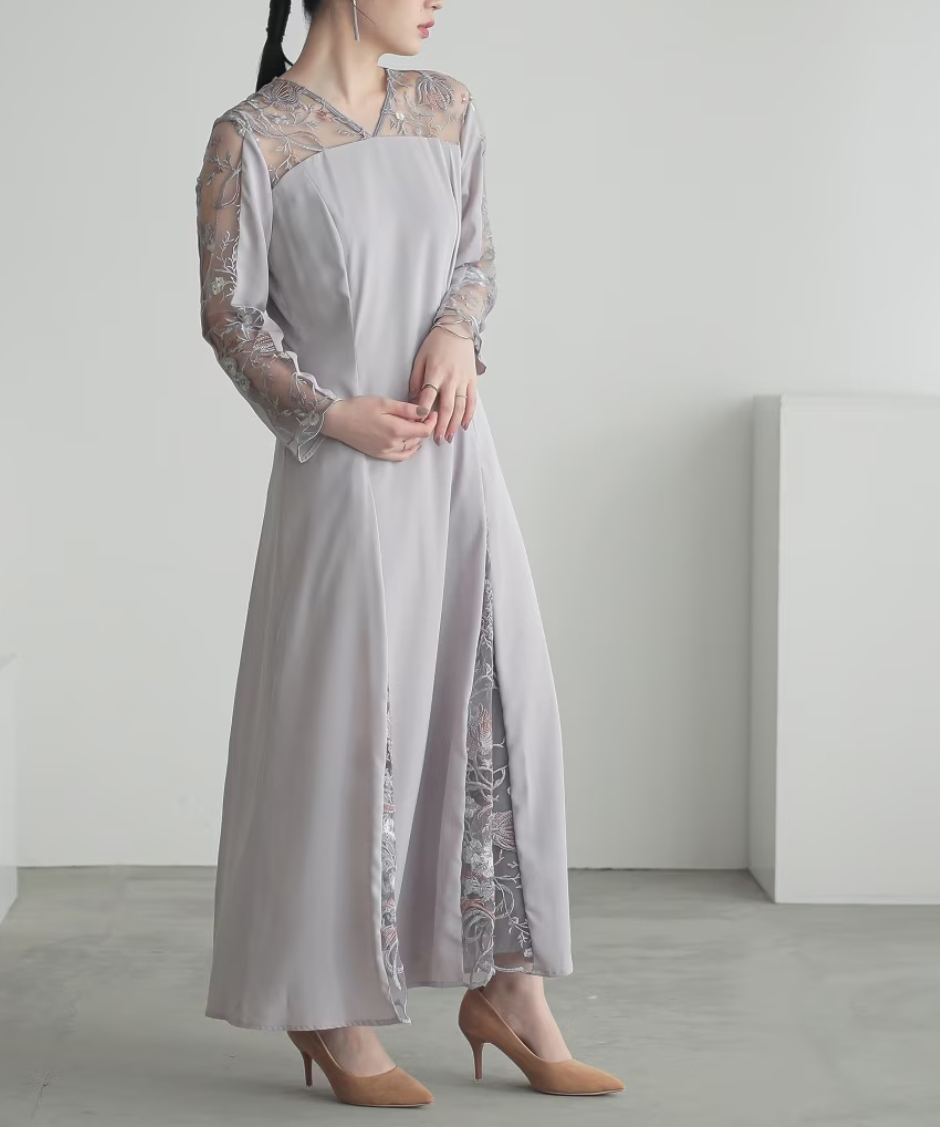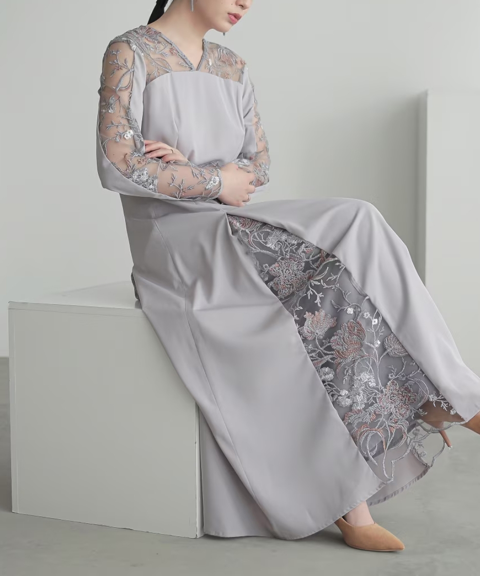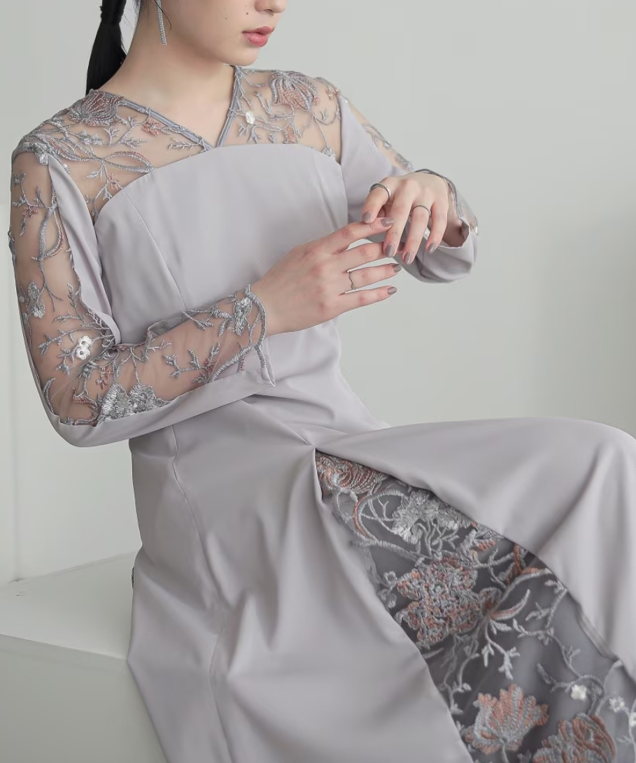 繊細なチュール刺繍が上品な印象を与えるワンピースドレス。