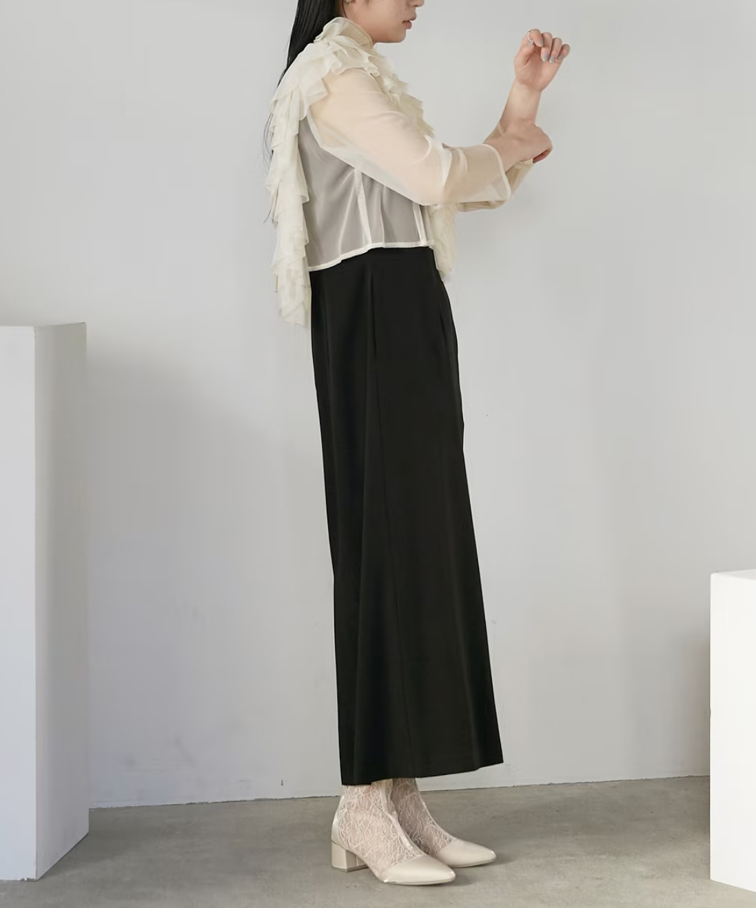 気になる二の腕をおしゃれにカバーし、ロング丈でスタイリッシュなシルエットに。