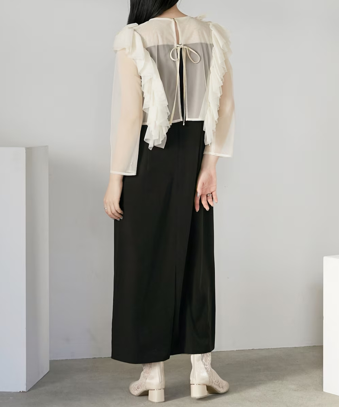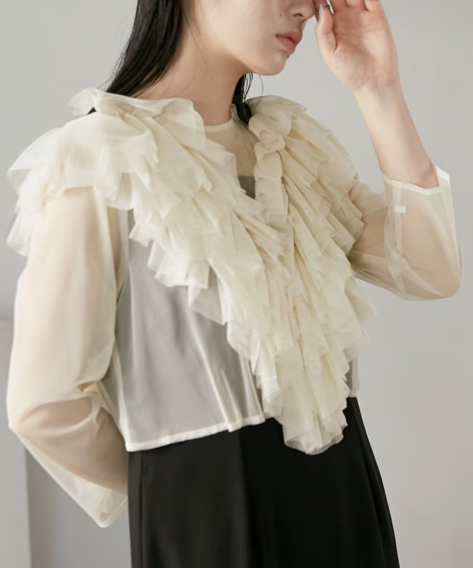 肌触りのいいチュールフリルデザインの、エレガントさを際立たせるワンピースドレス。