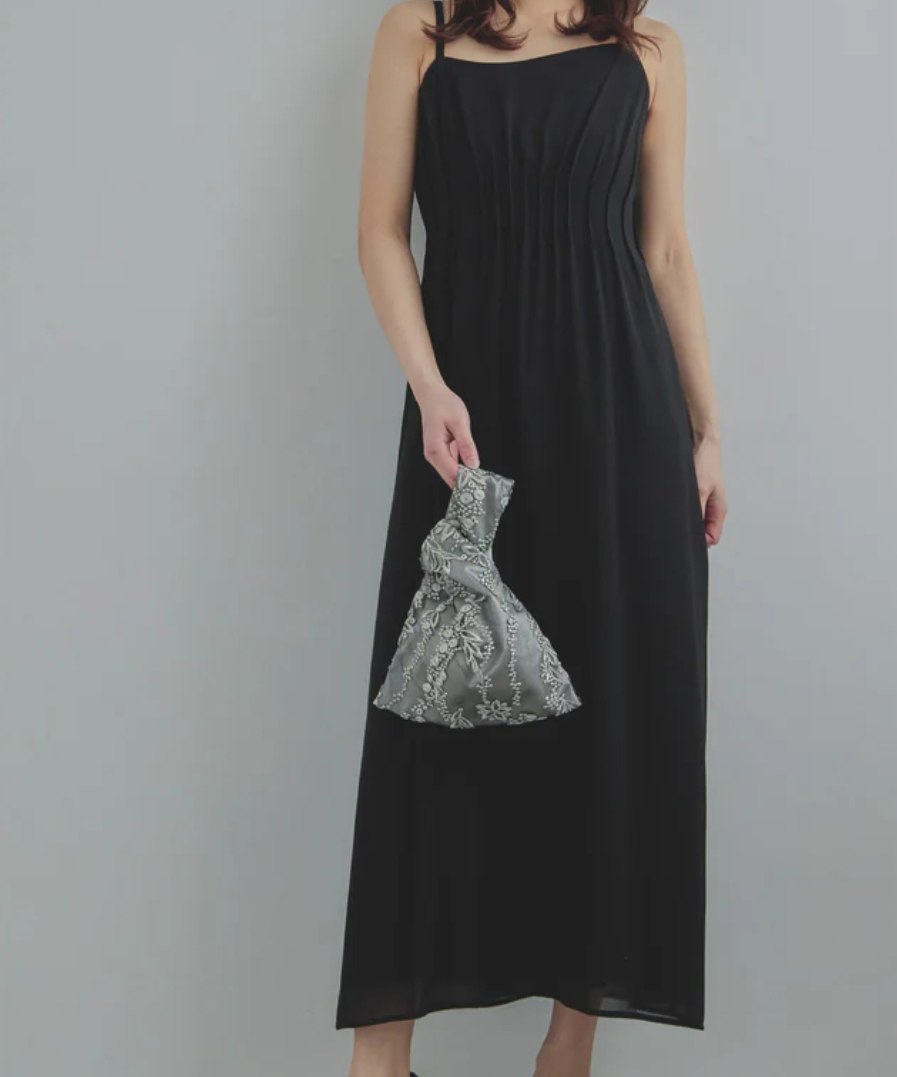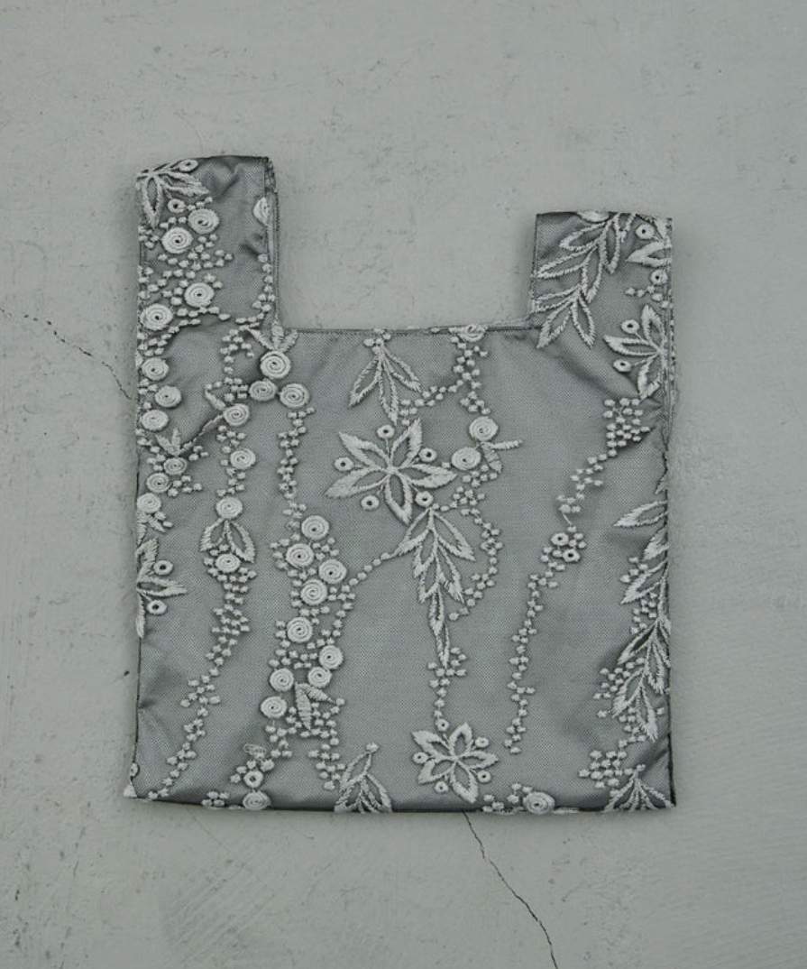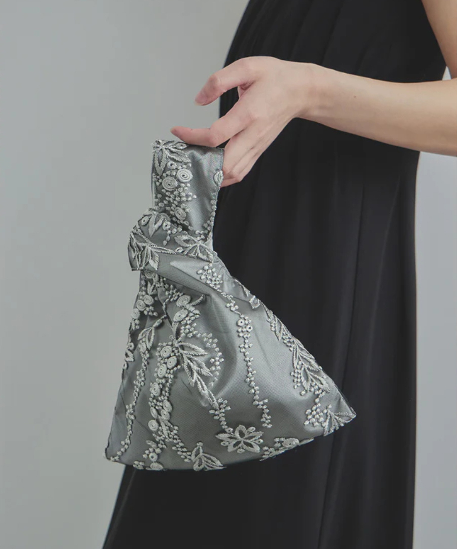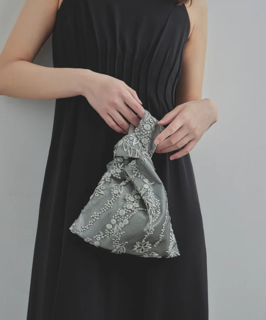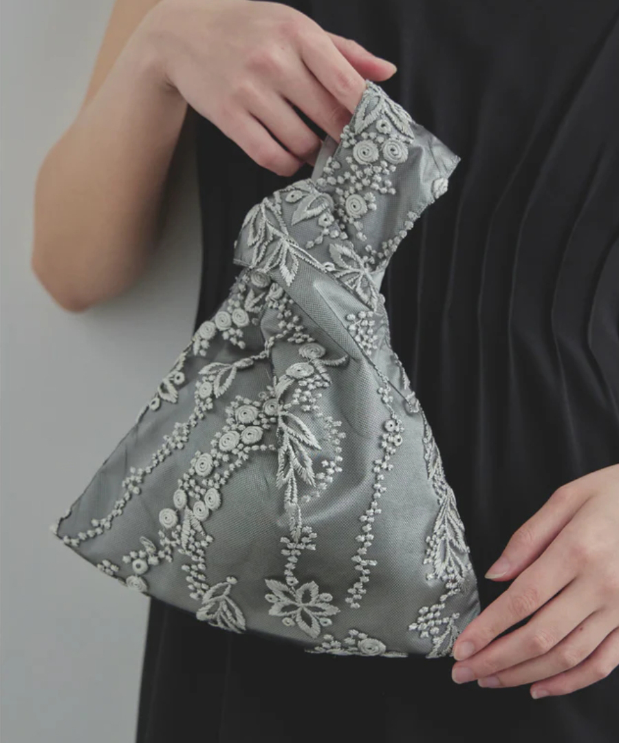艶感のあるサテン生地に高級感のある刺繍レースを使用して存在感を放つワンハンドルバッグ。