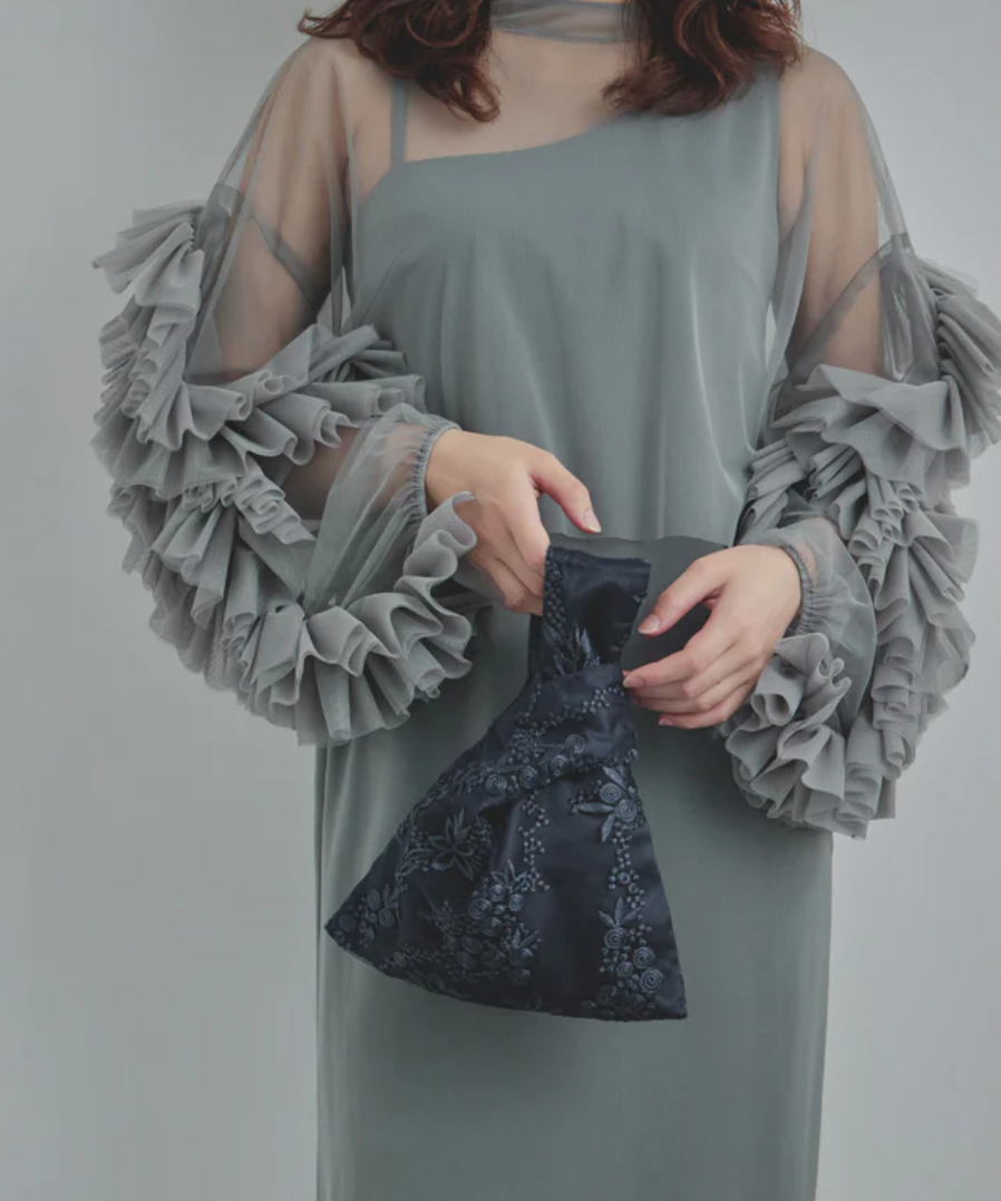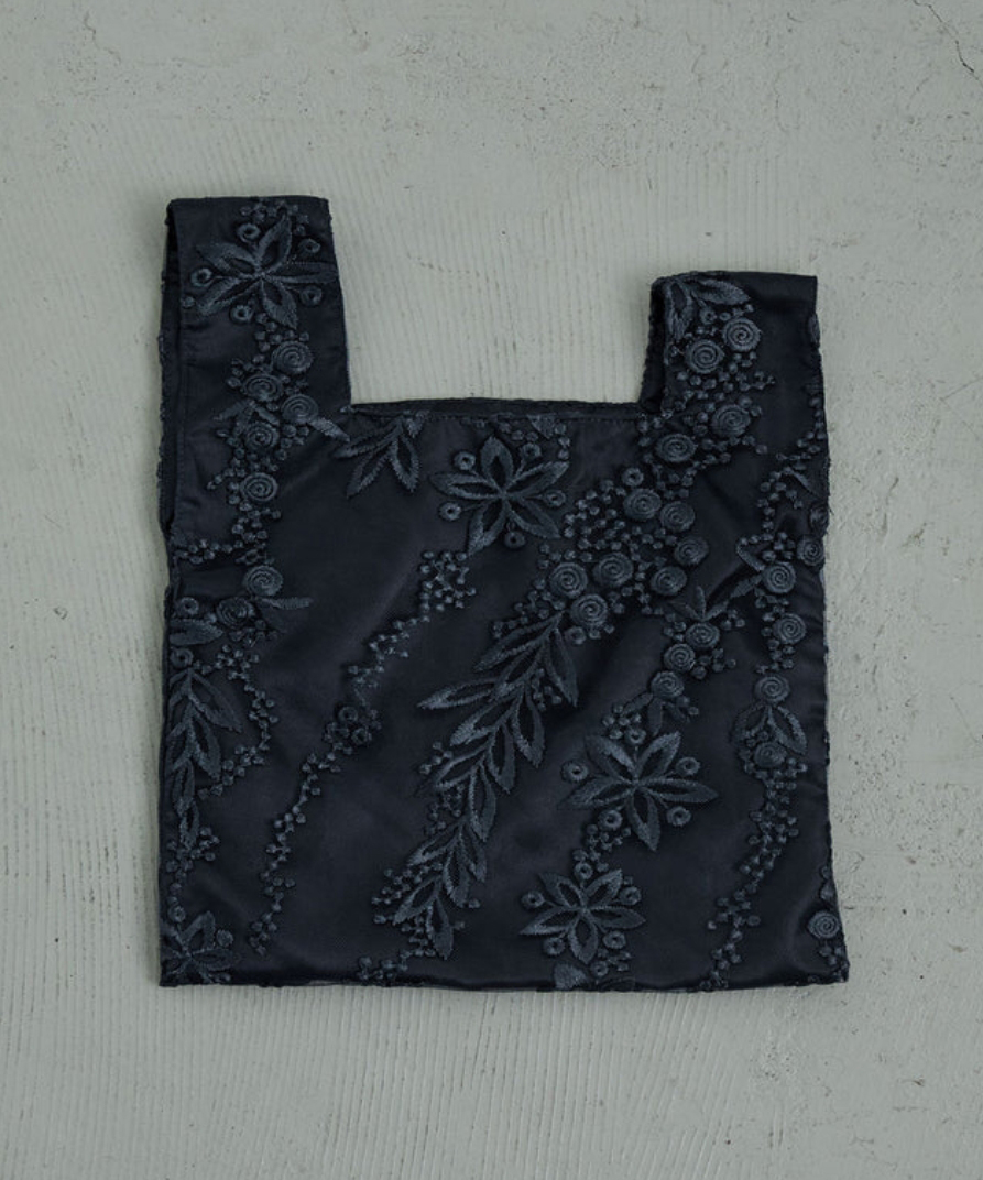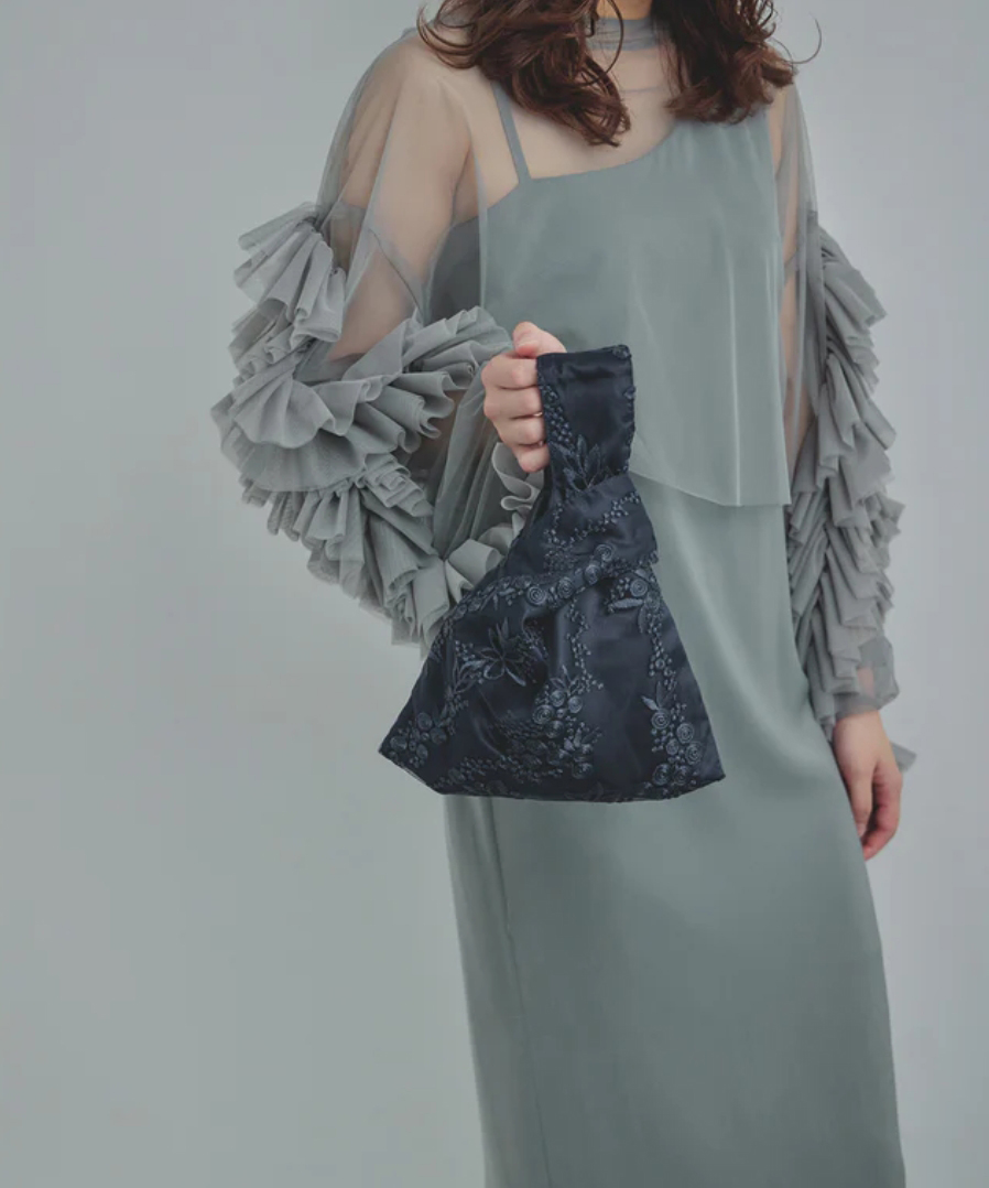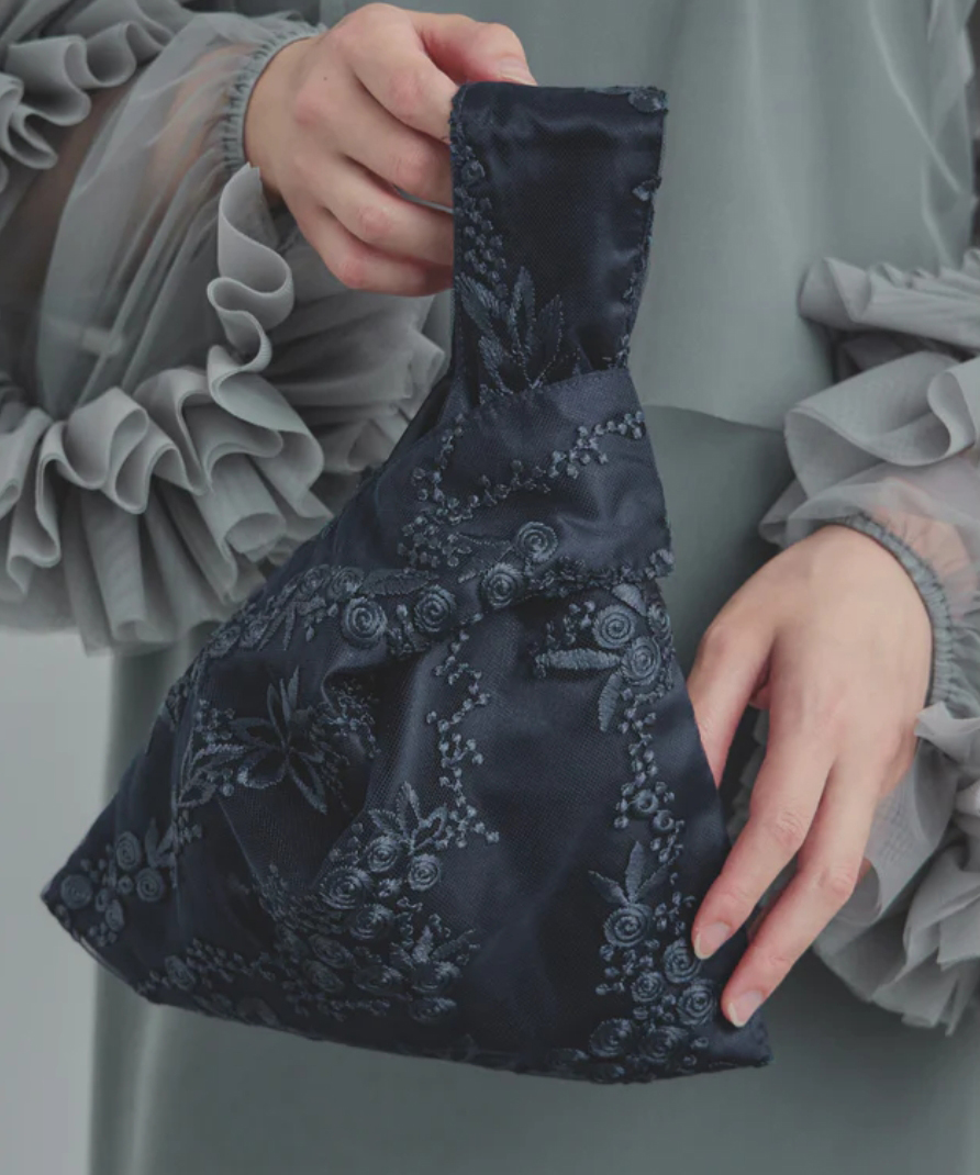 艶感のあるサテン生地に高級感のある刺繍レースを使用して存在感を放つワンハンドルバッグ。
