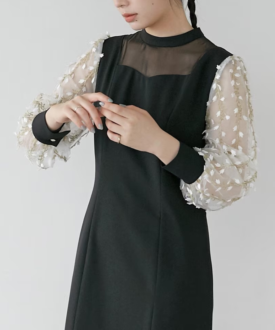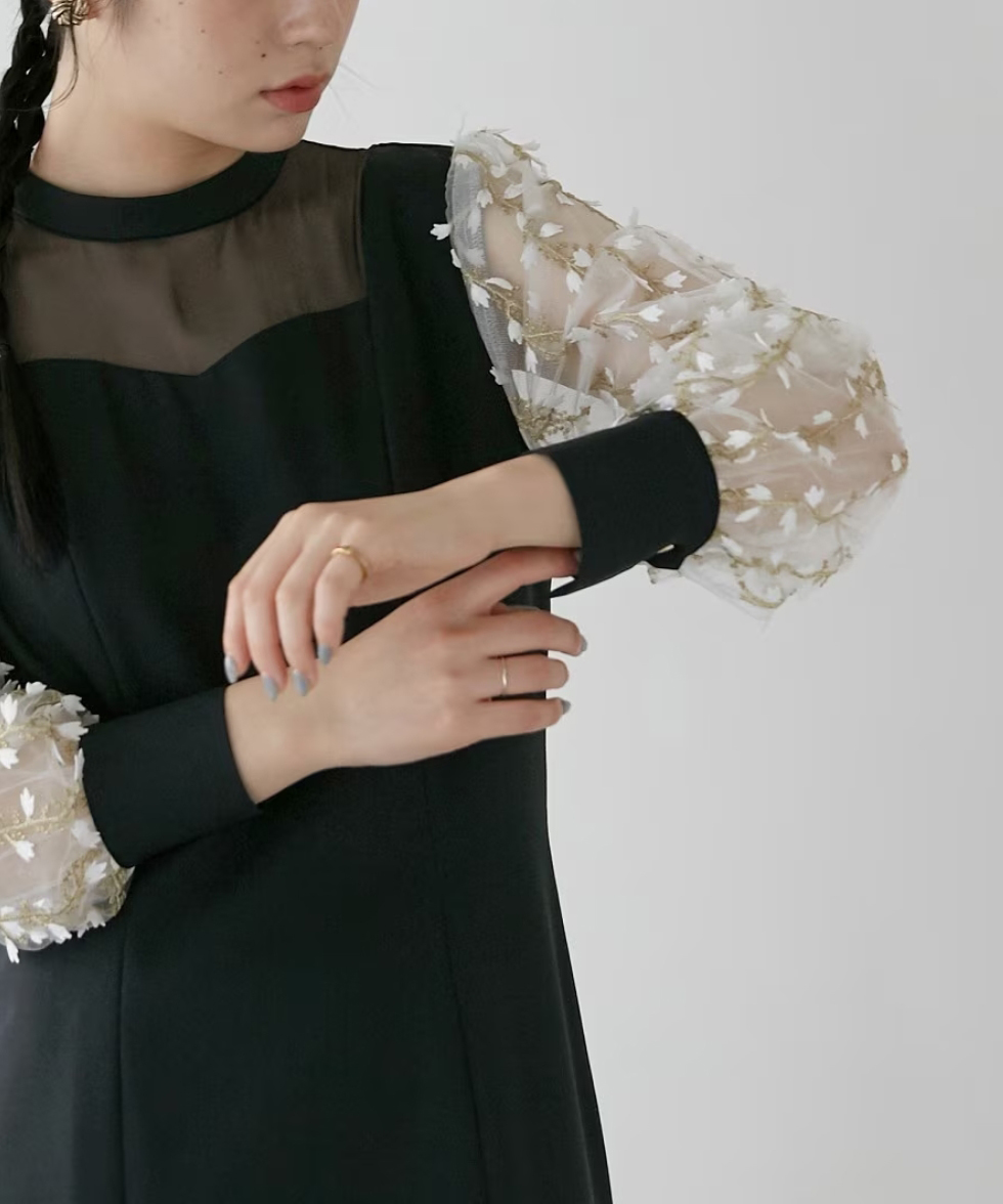 繊細で立体的な花柄チュール刺繍素材が華やかさを表現してくれるワンピースドレス。