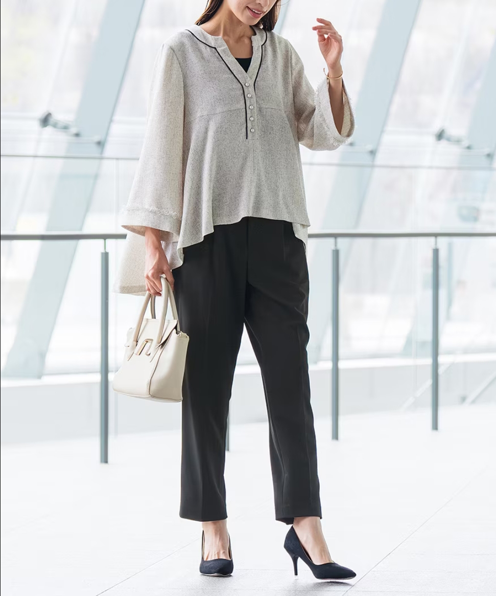 エレガンスな装いの着回しできる使いやすいパンツセットアップ。