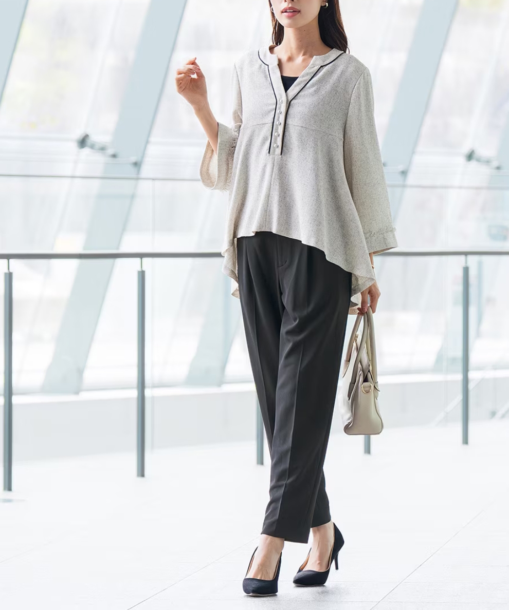 伸縮性のあるパンツは、綺麗なシルエットで体型カバーしつつ上品な印象を与えます。