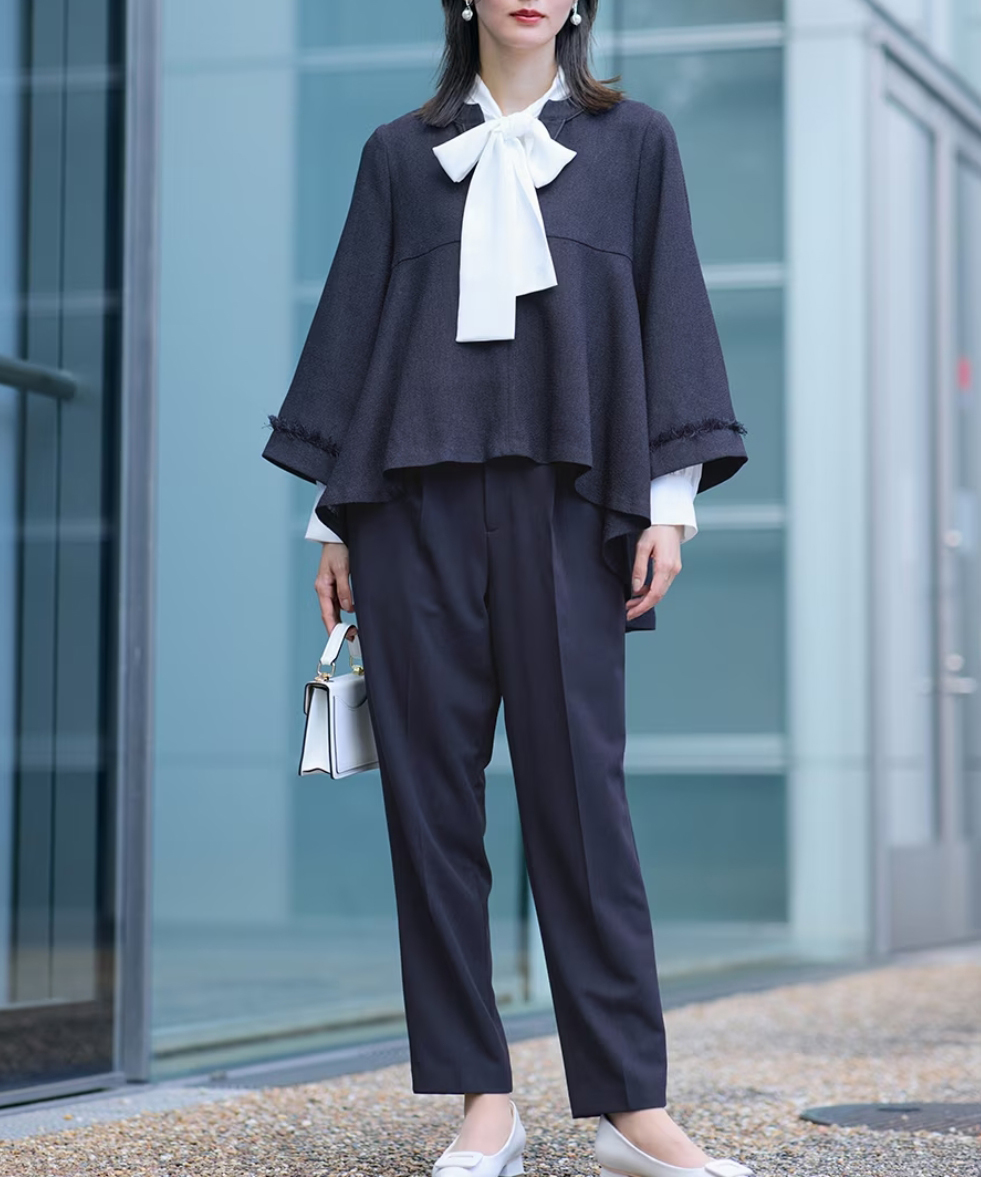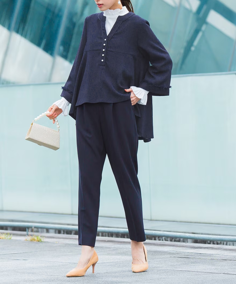 エレガンスな装いの着回しできる使いやすいパンツセットアップ。