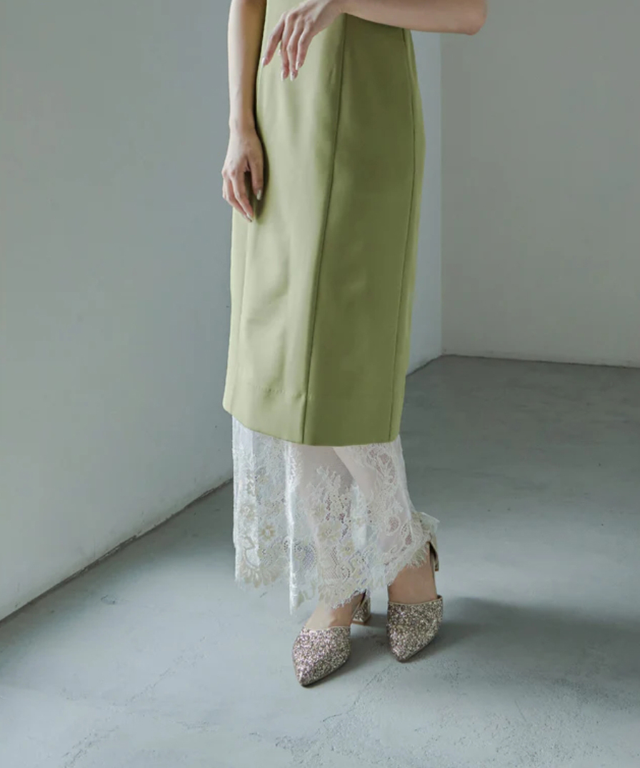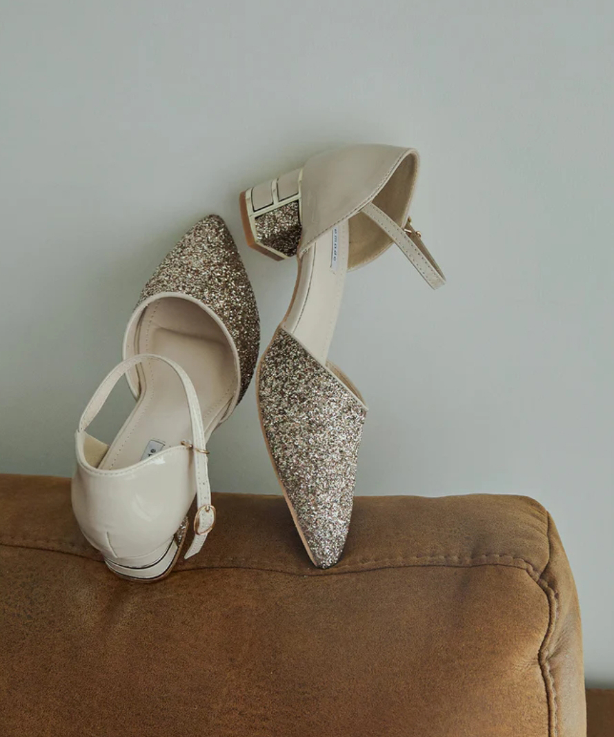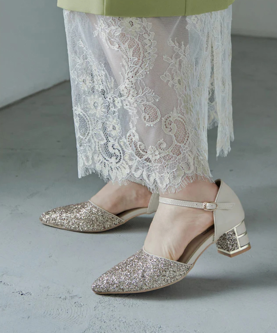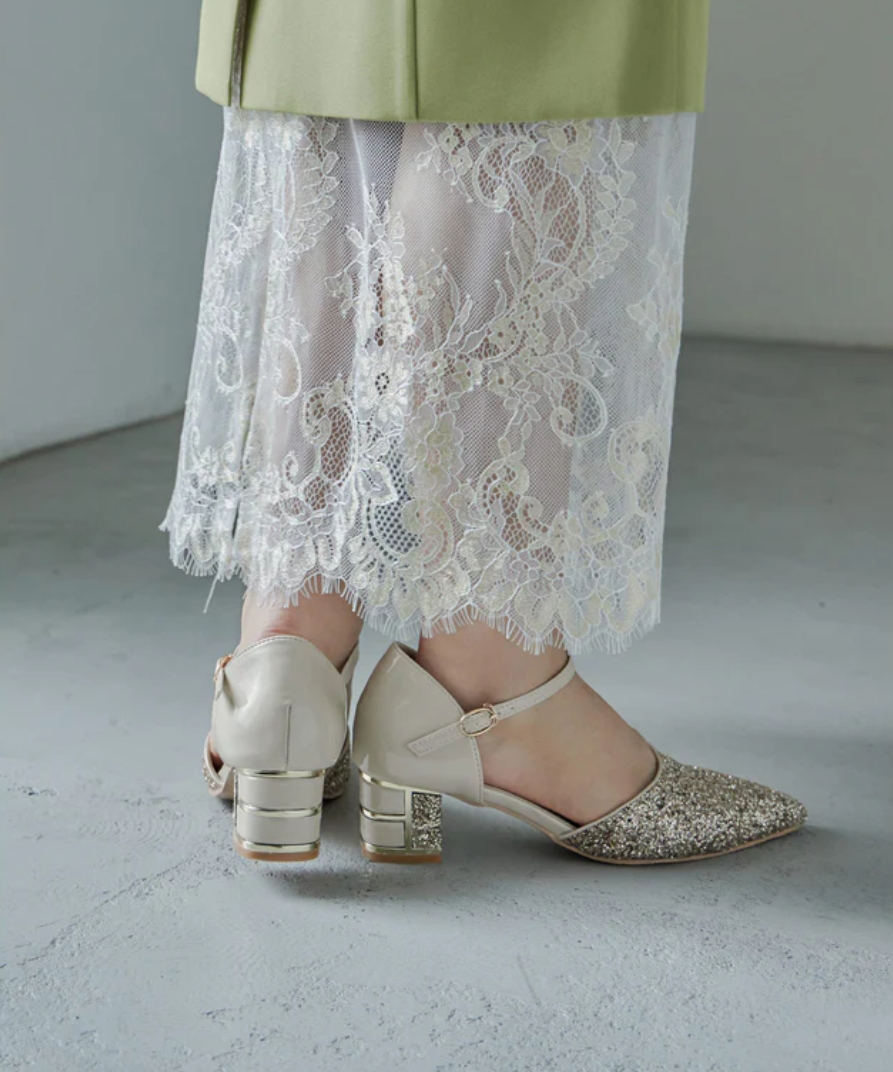 グリッターとエナメルを組み合わせ、足元を華やかに演出してくれるチャンキーヒールパンプス。