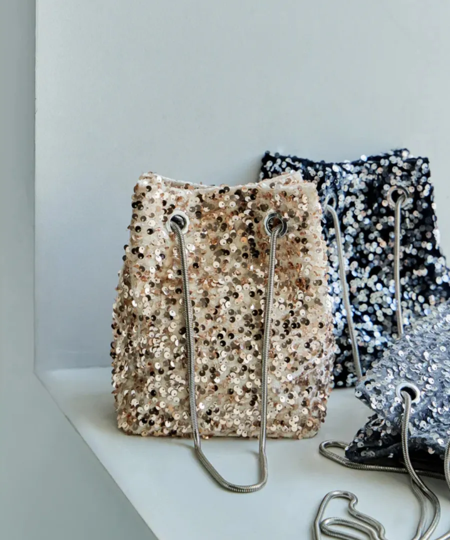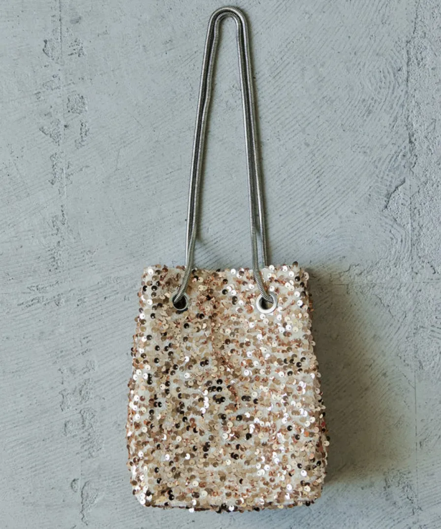きらきら輝くスパンコールで存在感ある巾着スパンコールバッグ。