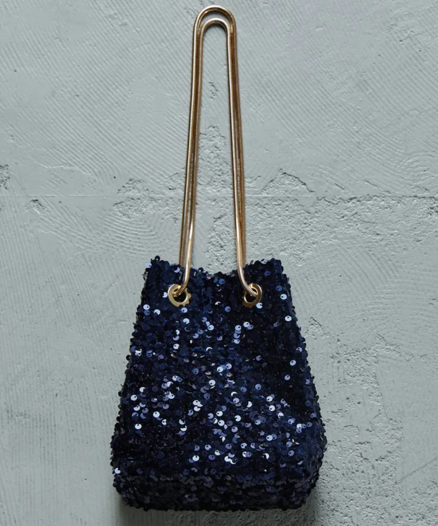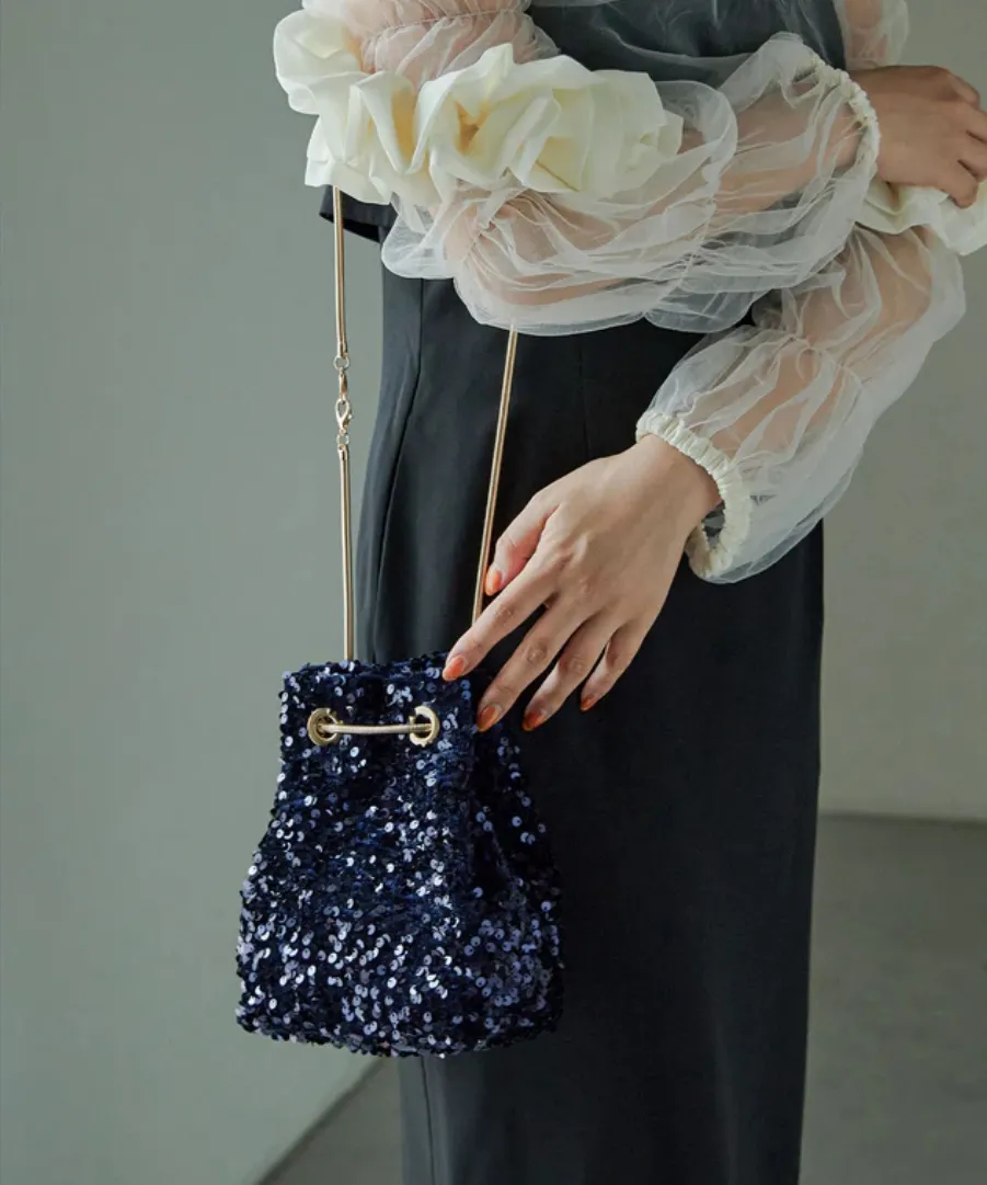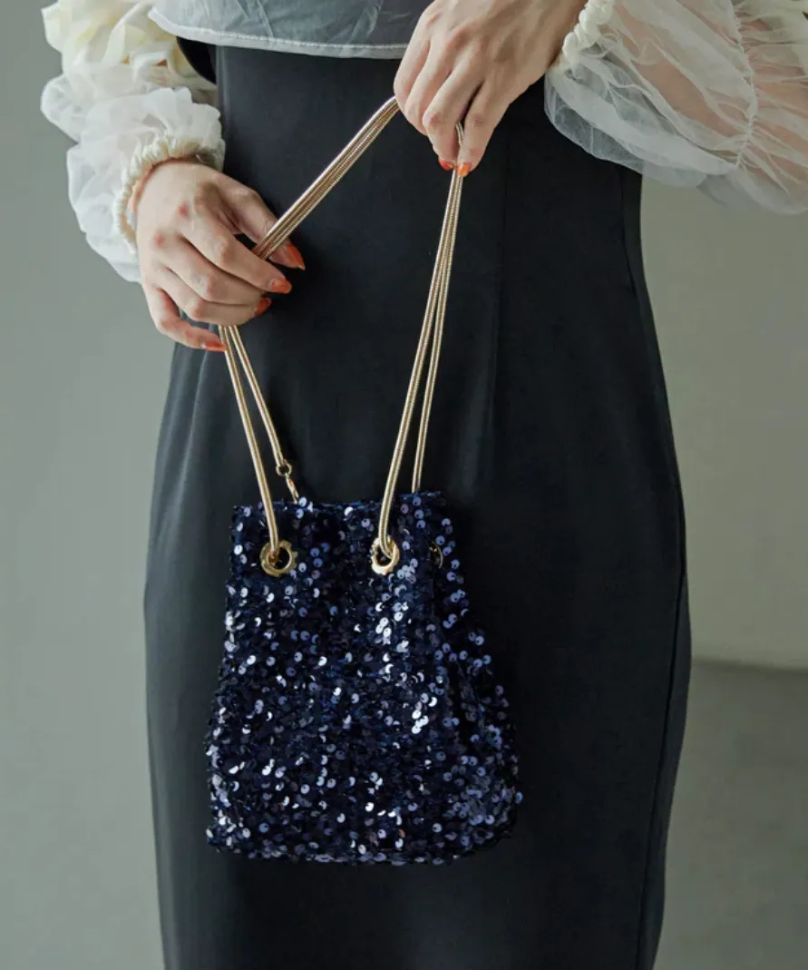 きらきら輝くスパンコールで存在感ある巾着スパンコールバッグ。