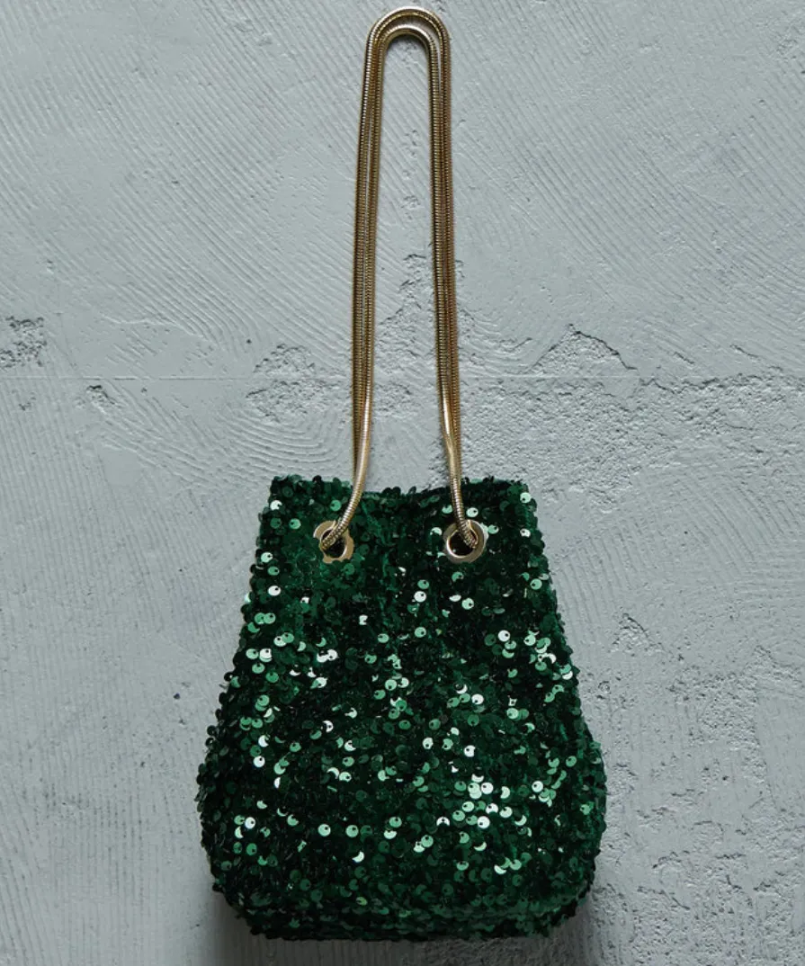 きらきら輝くスパンコールで存在感ある巾着スパンコールバッグ。