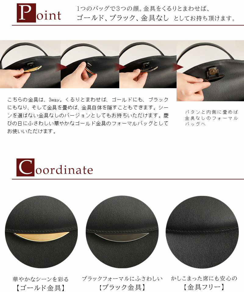 金具が3wayとなってなり、くるりと回せば、ゴールド金具かブラック金具になり、金具を折り畳めば、金具自体も隠すことができ、シーンに合わせて変えることができる非常に便利なバッグです。