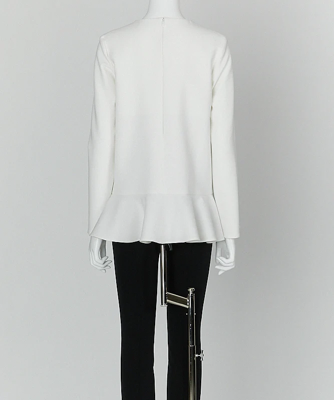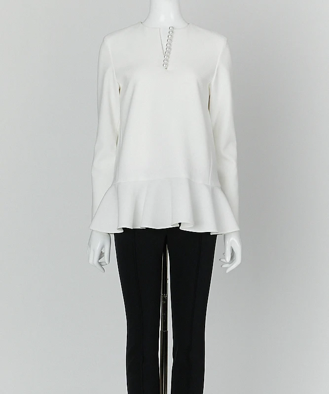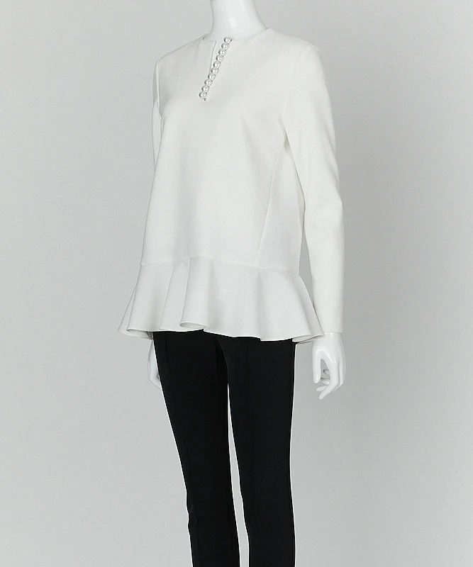 長袖のエレガントなシルエットに、裾のラッフルが優美に揺れる洗練されたブラウス。胸元や袖口に施されたYOKO CHANオリジナルのパールが、シンプルながらも気品ある装いを演出します。滑らかでとろみのある素材で仕立てており、着心地の良さと美しいドレープ感を両立。ボディラインを美しく見せる絶妙なシルエットは、スカートやパンツなど様々なボトムスと相性良く馴染みます。オフィスからディナーまで、一日中あなたをエレガントに彩る一着です。