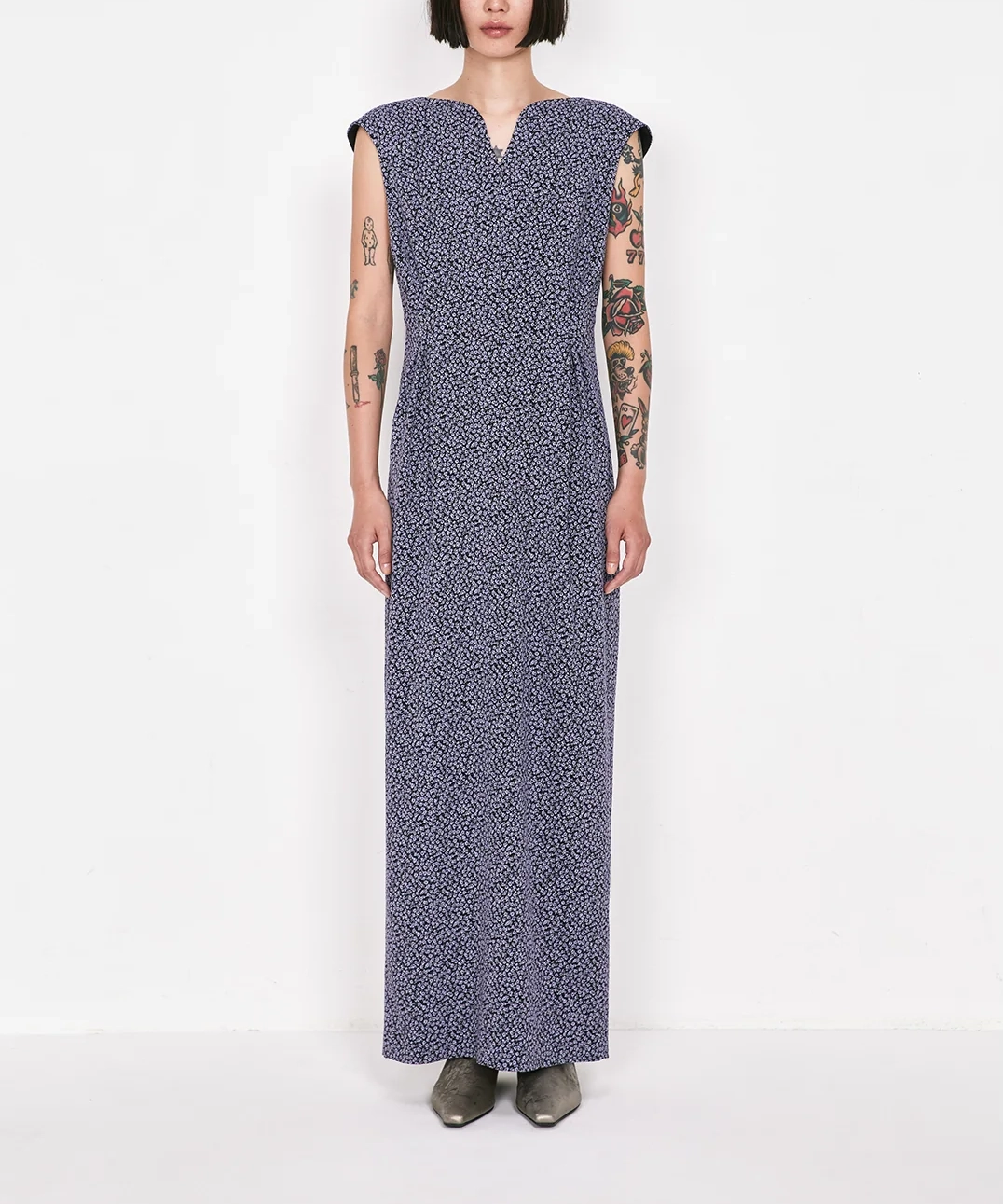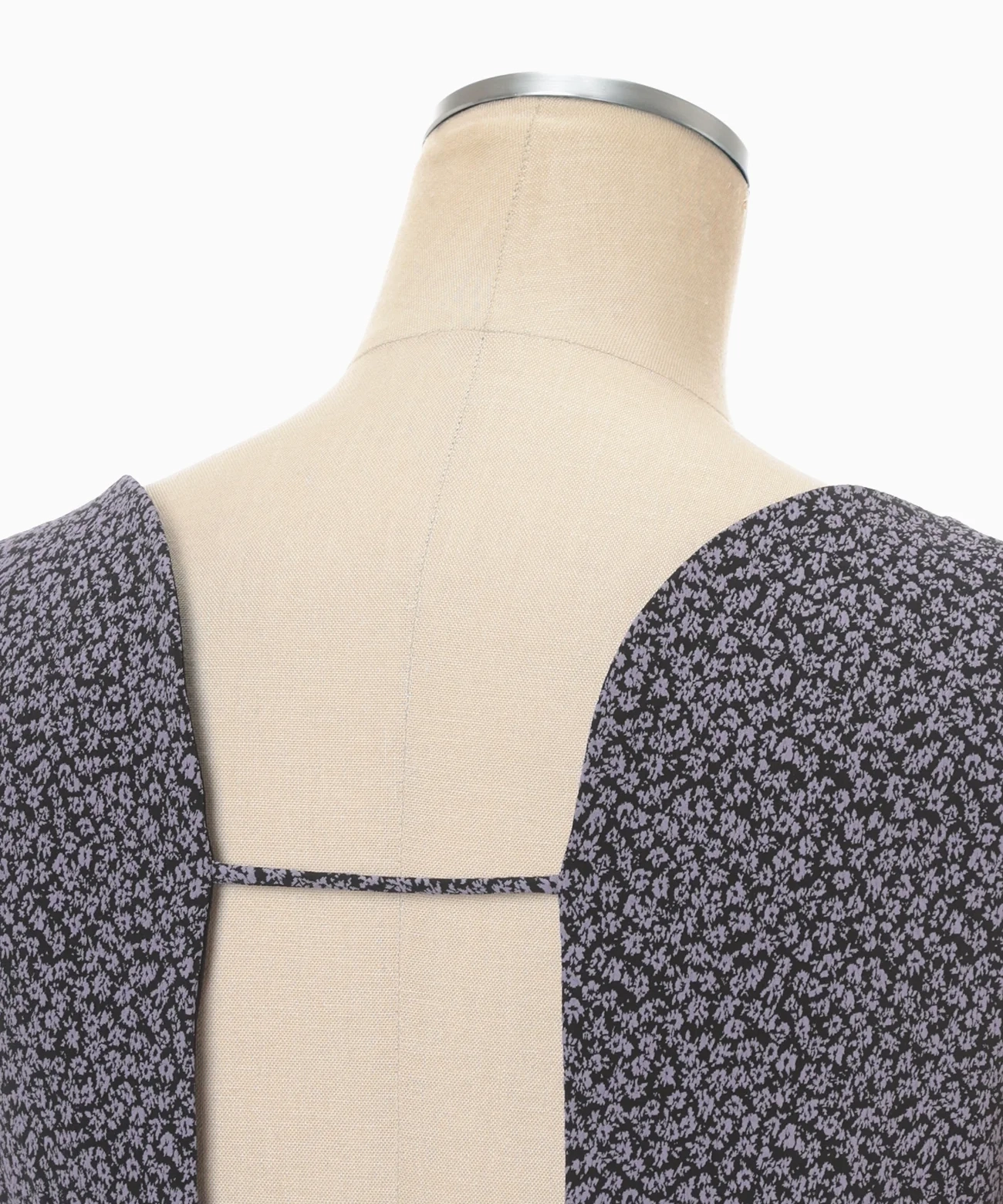 小花柄が魅力的なアセテートレーヨン通風ジャカード生地を使用。ポリエステルのソロテックス糸を緯糸に採用し、ポコポコとした凹凸感ある表情を実現。ウエストのタックがコンパクトな身頃から広がる洗練されたシルエットを生み出し、印象的なデザインに。