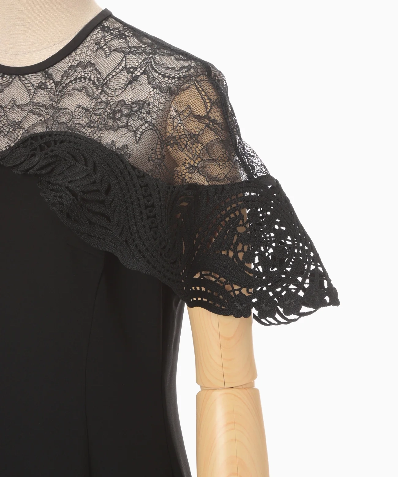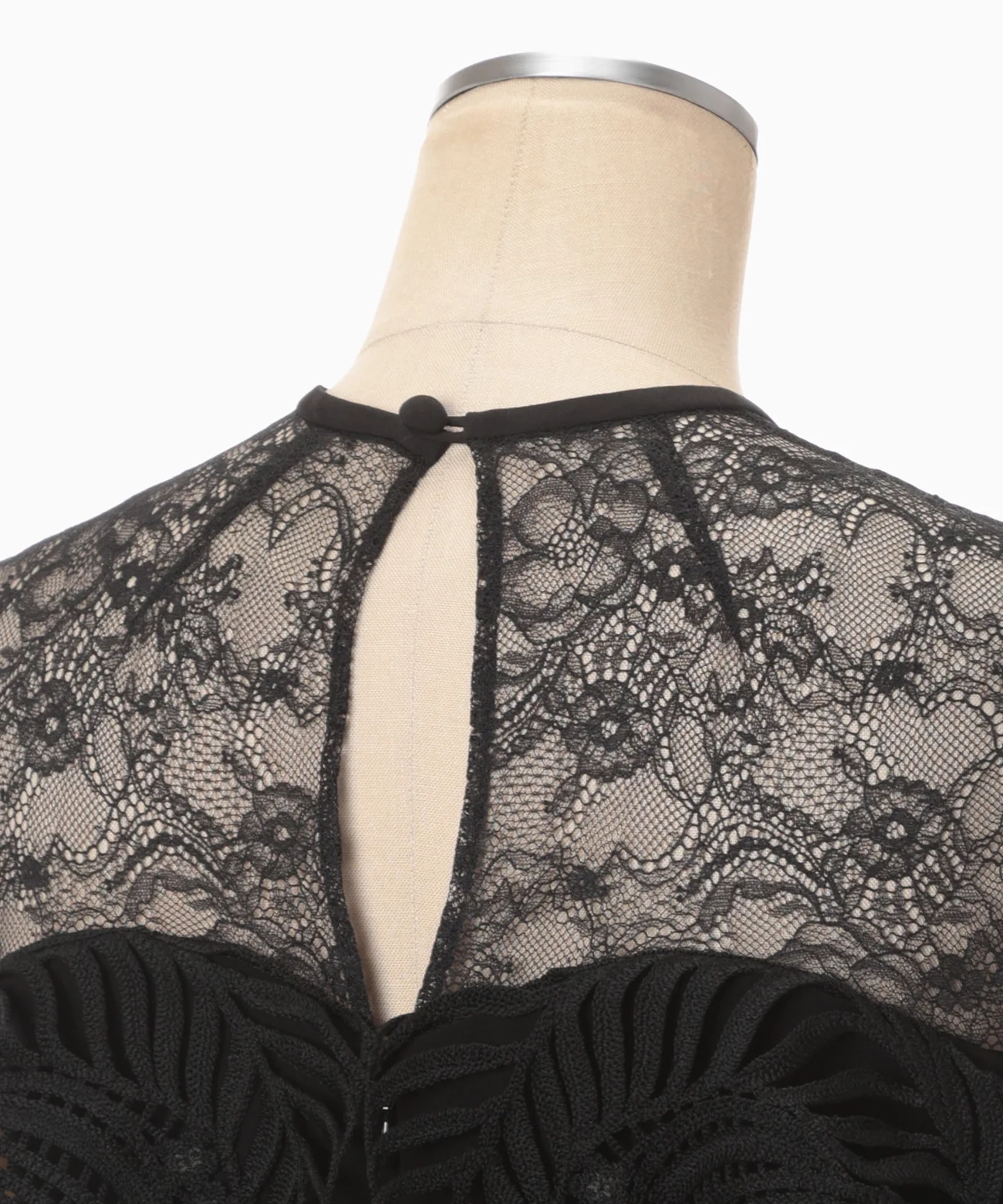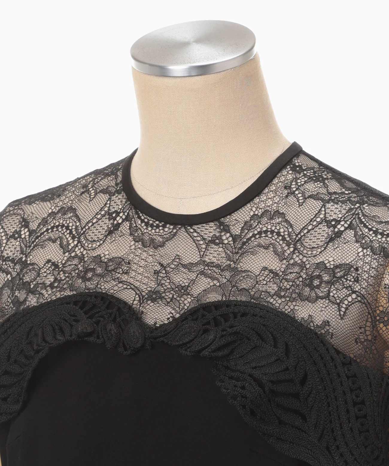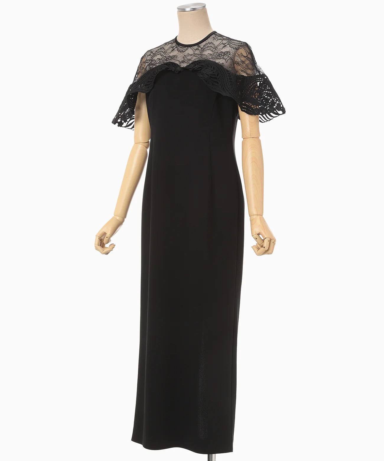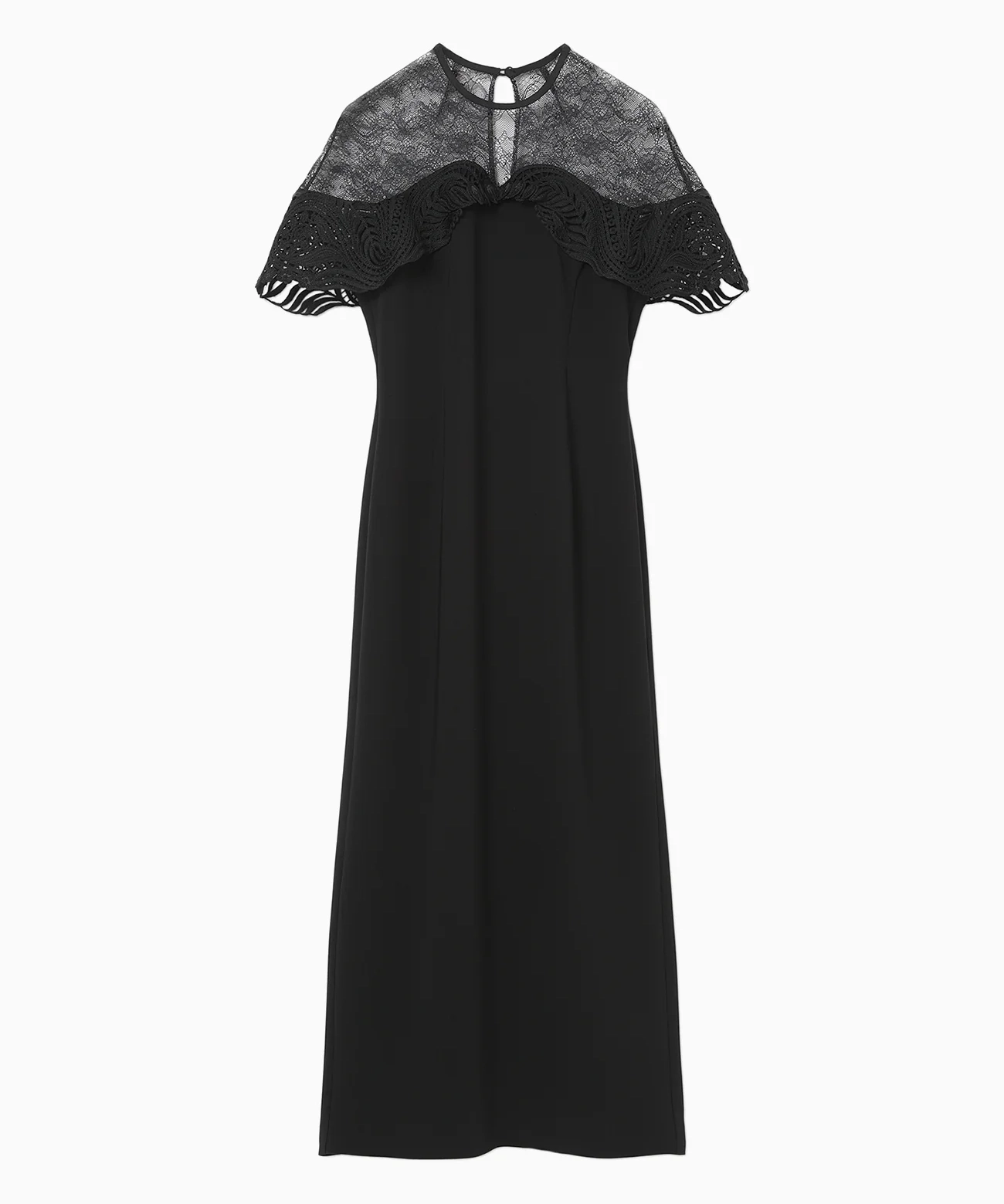 トリアセテートとポリエステルのジョーゼットを使用した贅沢なラッセルレースドレスです。特殊な膨らみのある糸を採用し、高いストレッチ性と速乾性を実現。接触冷感機能も備え、シワになりにくい優れた着心地をお約束します。デコルテには当店オリジナルの花柄ラッセルレースと繊細な刺繍をあしらい、首元から肩にかけて可憐な印象に。シェイプされたウエストから自然に落ちるシルエットが縦のラインを美しく強調し、スタイルアップ効果も抜群です。