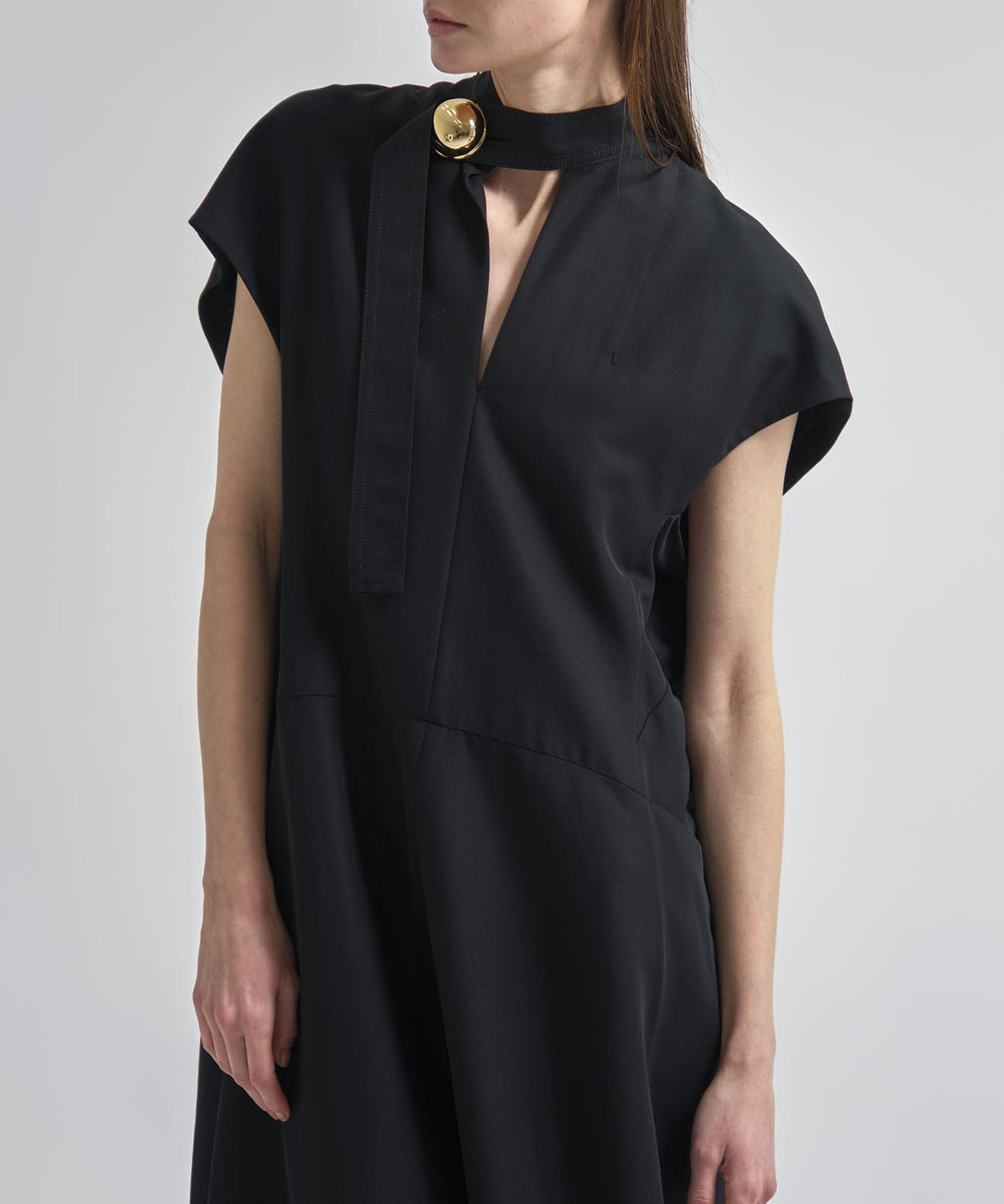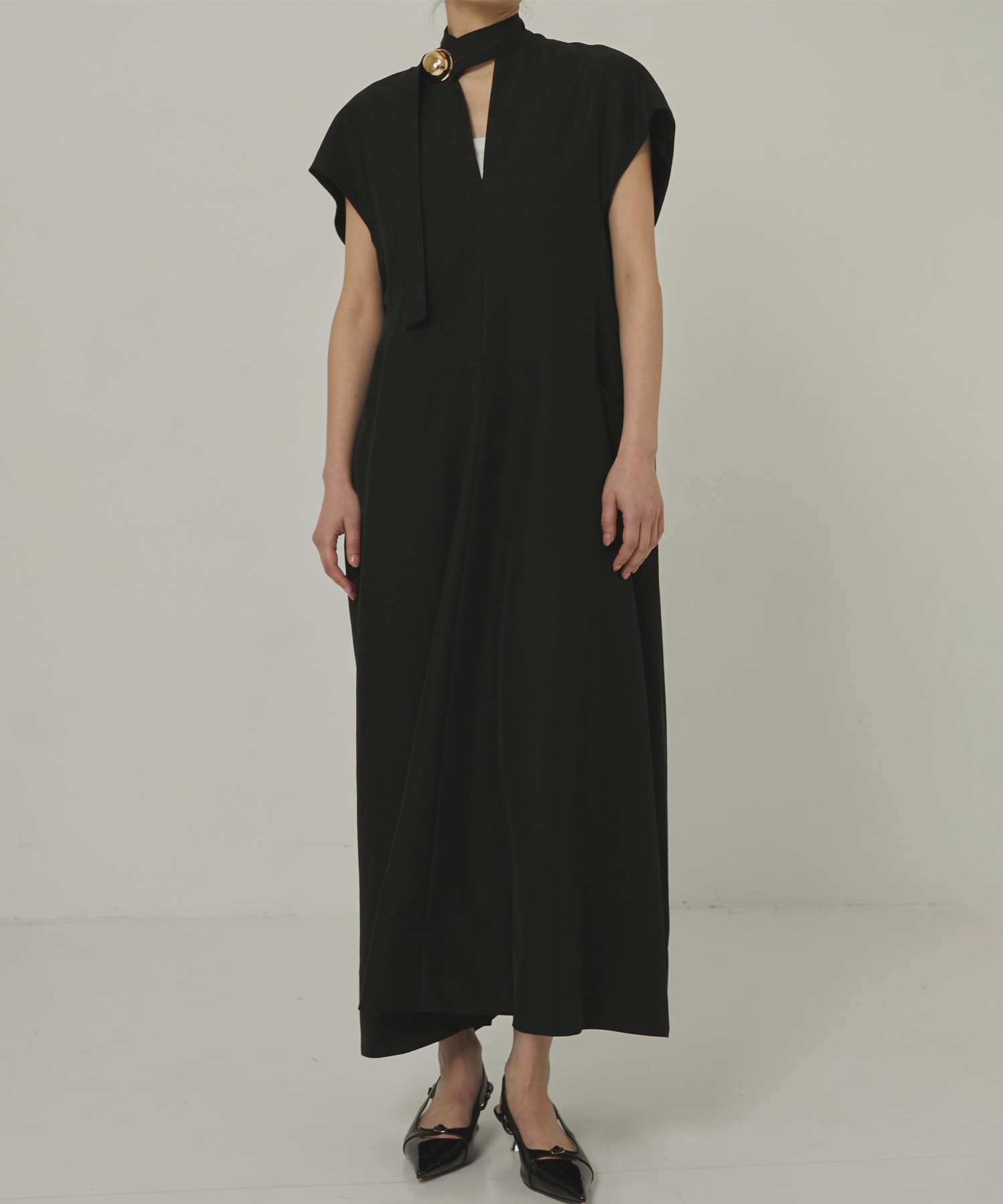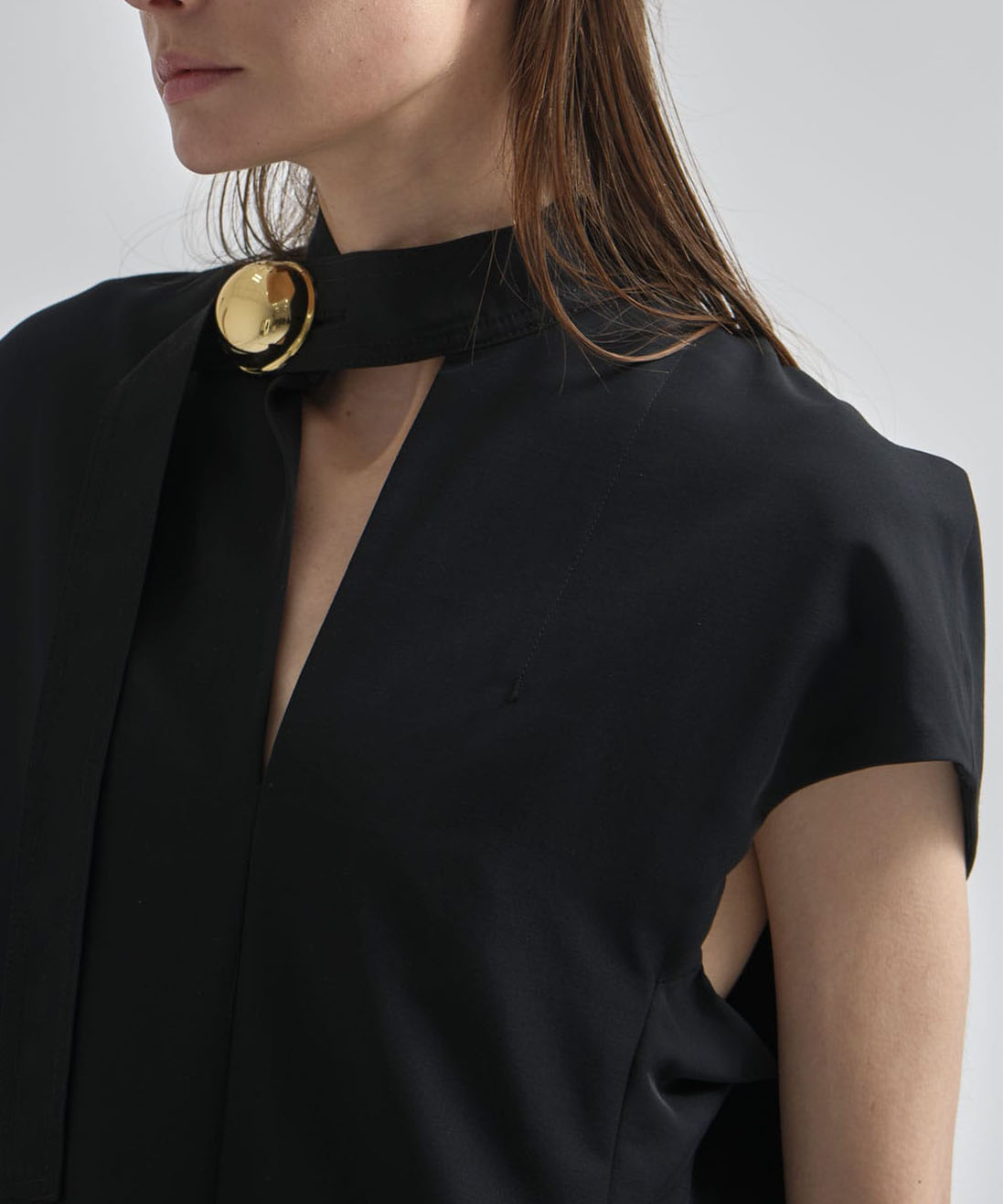 デコルテを美しく見せるV開きに、上品なボウタイ風ディテールが印象的です。