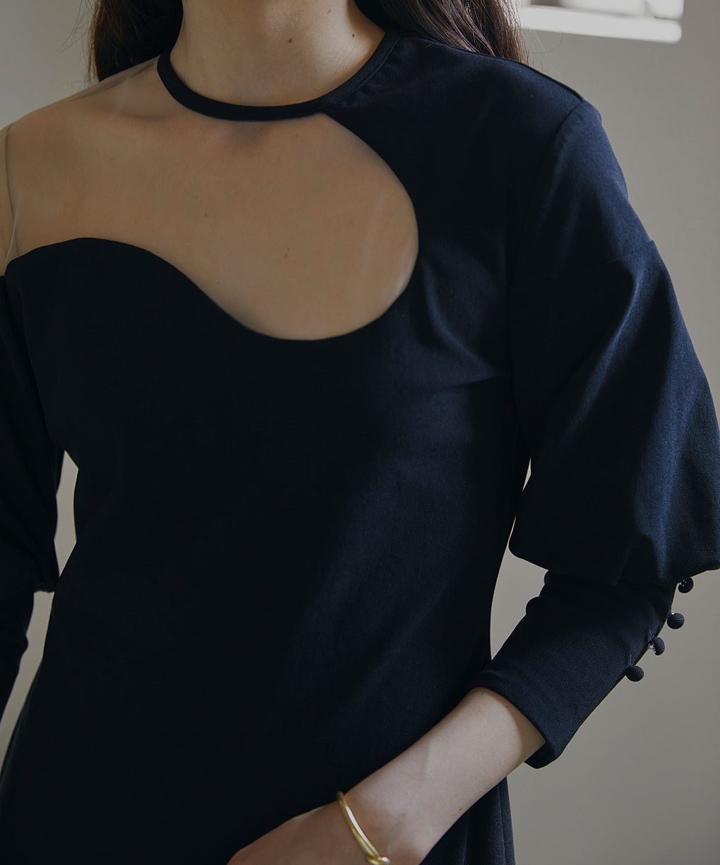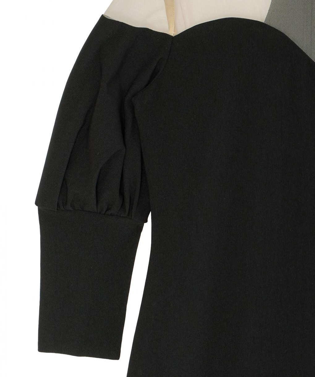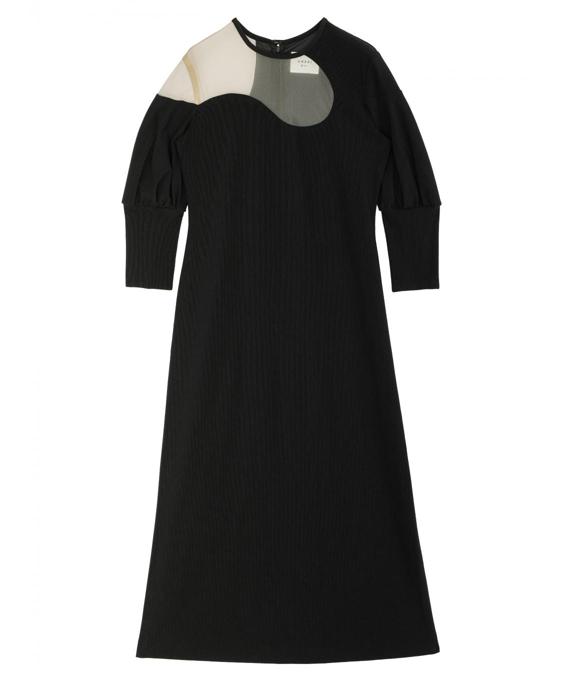 デコルテ周りのデザインがAmeriらしい特徴的なドレス。程良い厚みとハリがあるため、身体のラインあまり拾いません。カジュアルな素材なため、華やかなアクセサリーや小物と合わせると◎。