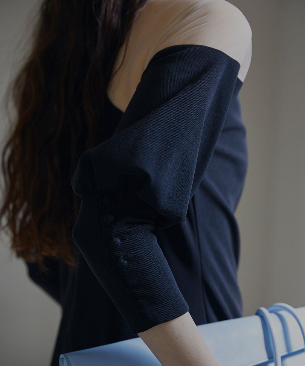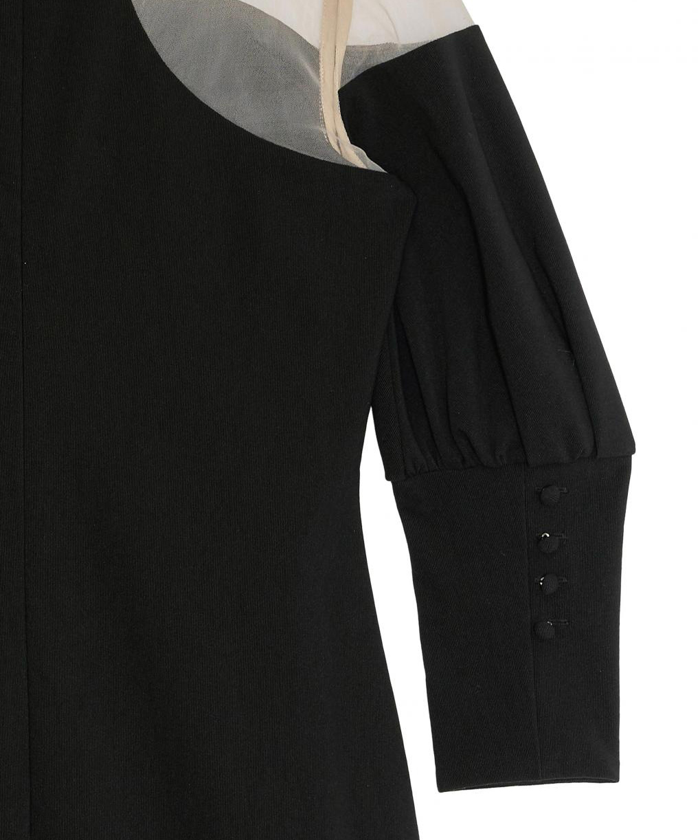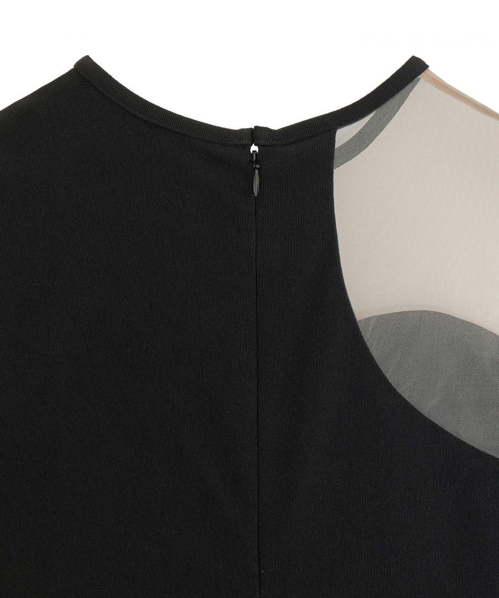 デコルテ周りのデザインがAmeriらしい特徴的なドレス。程良い厚みとハリがあるため、身体のラインあまり拾いません。カジュアルな素材なため、華やかなアクセサリーや小物と合わせると◎。