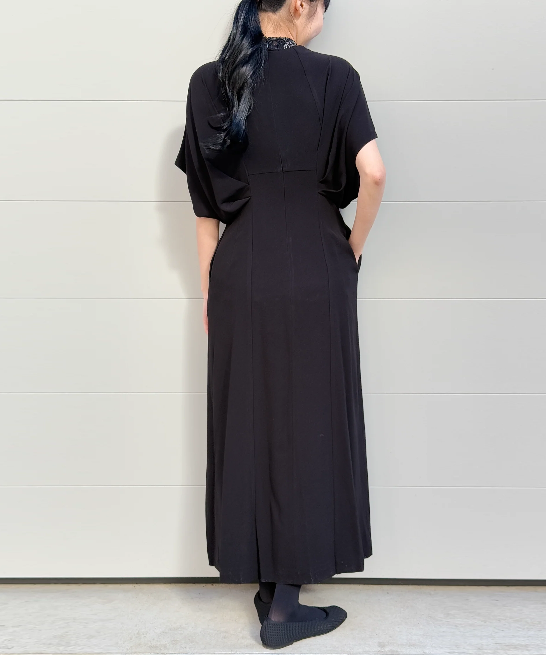 優雅なドレープが生み出す、蕾のようなケープショルダーが印象的なレースドレス。縦ラインを強調するレース切り替えと、ウエストから裾にかけて広がるエレガントなAラインが美しいシルエットを演出します。便利な脇ポケット付きで、裏地があるため透け感も気にならず安心。